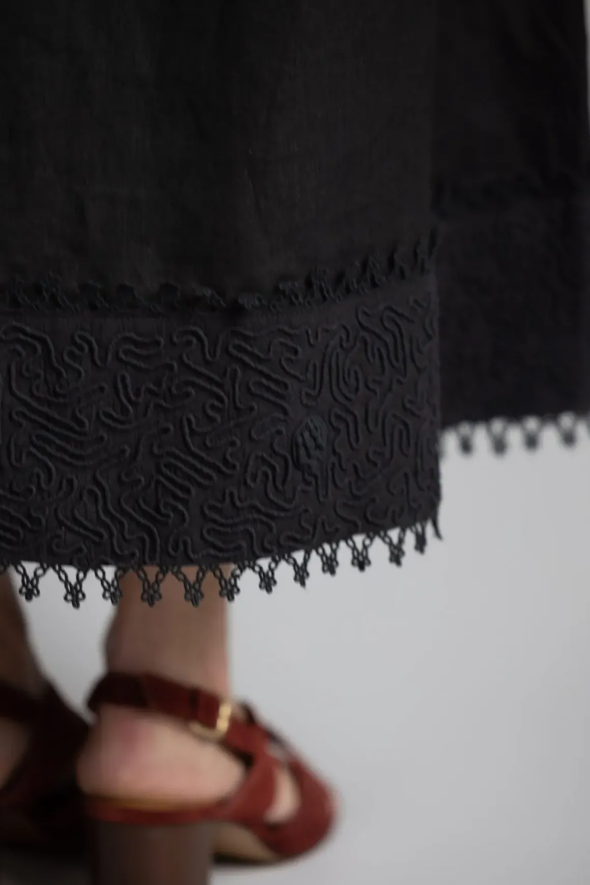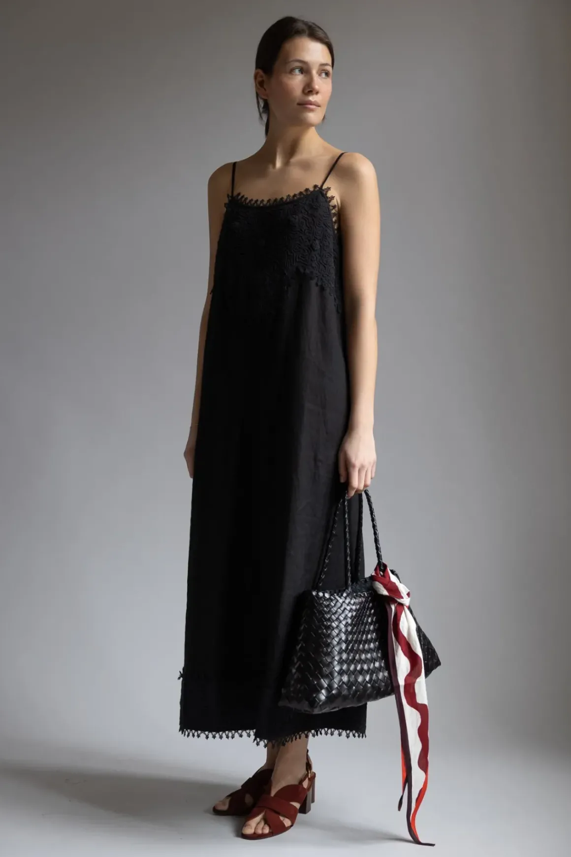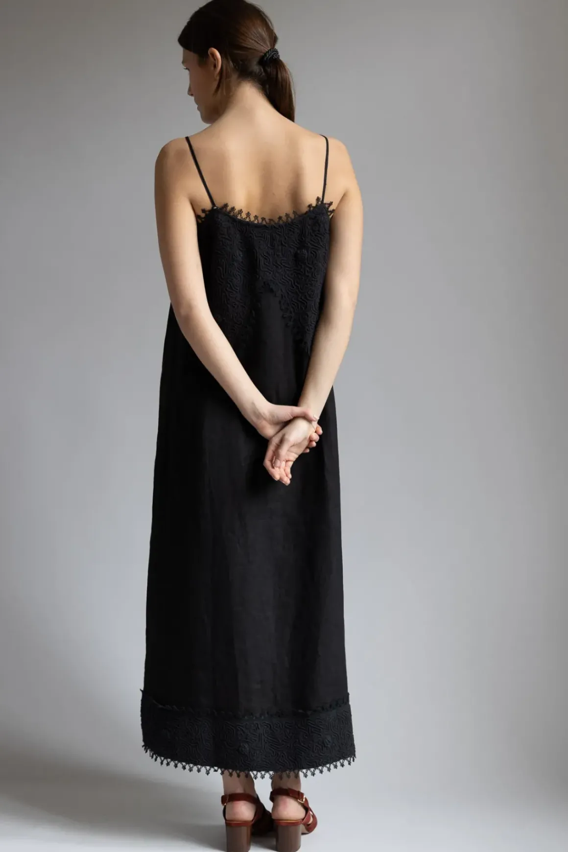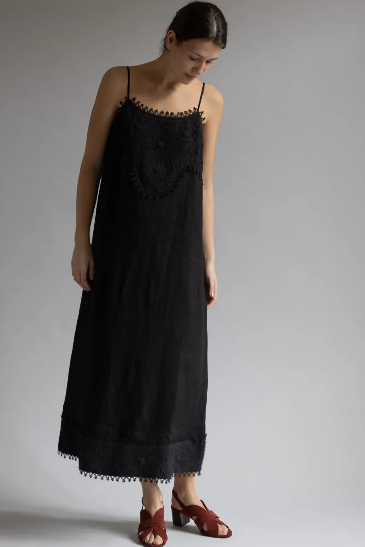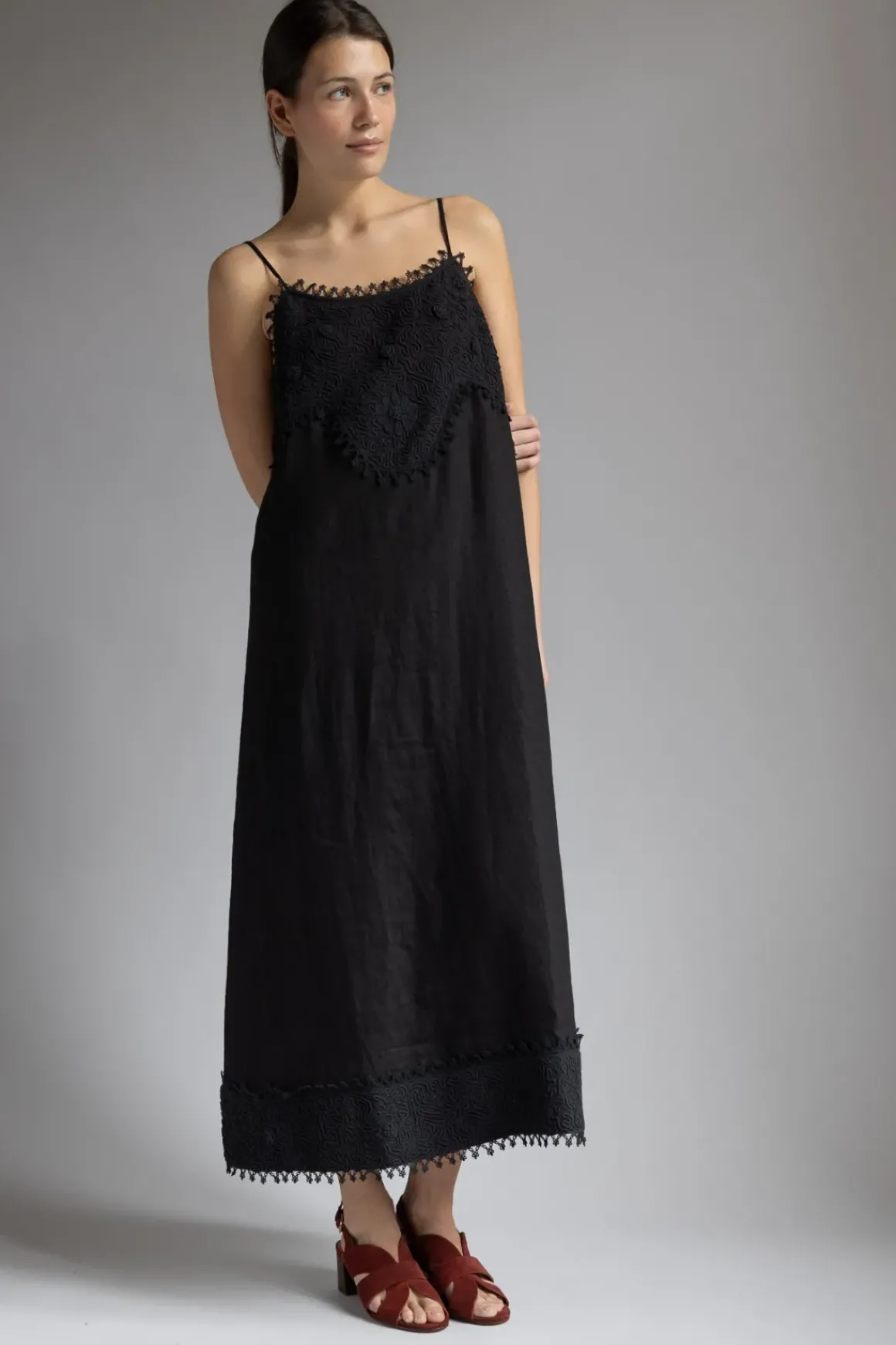 Emmy-kjolen er en linkjole med stropper, eksklusiv båndbrodering og blondedetaljer øverst og nederst. Den har en løs passform og perfekt både til middag som til stranden. Den har en underskjole i 100% bomull som går til rett over kneet.