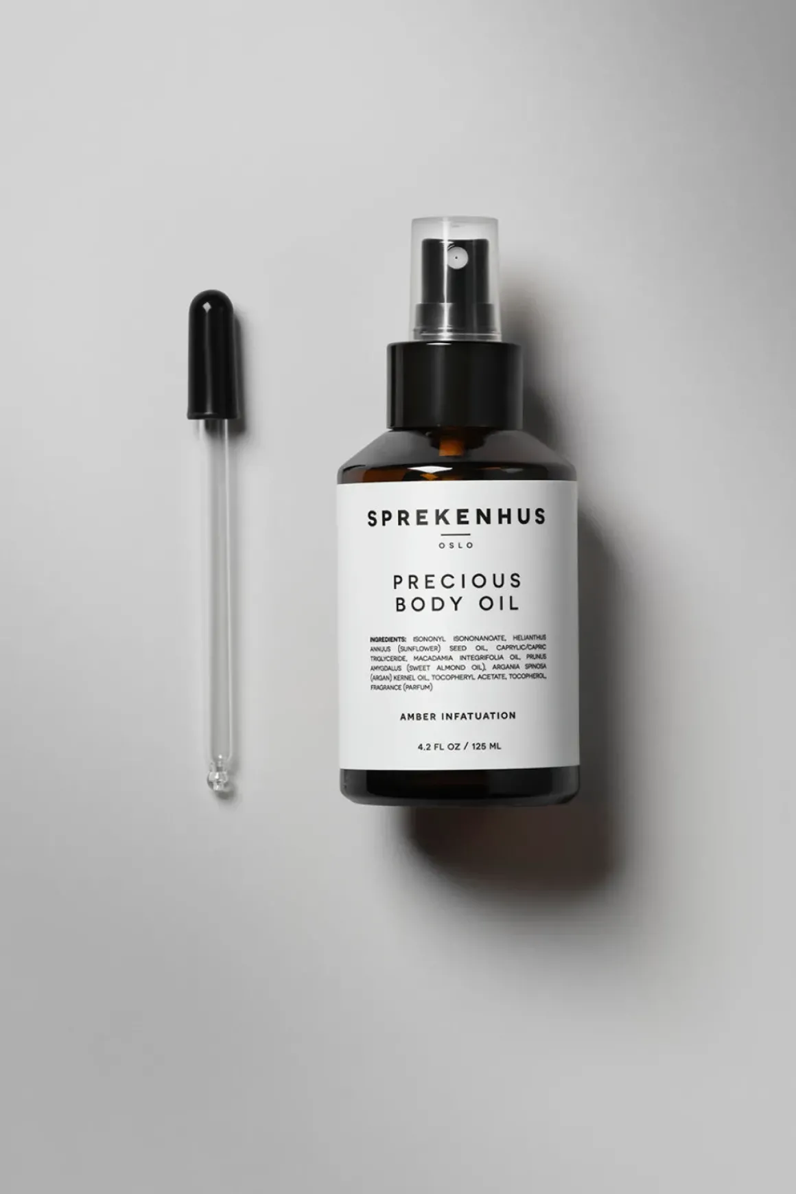 Sprekenhus Precious Body Oil er en luksuriøs olje, rik på essensielle fettsyrer, som gir intensiv pleie selv til den mest sensitive, tørre eller irriterte hud. Spray ønsket mengde direkte på huden for en umiddelbar fuktighetsboost. Den er ideell for å mykgjøre tørre legger, som en beroligende massasjeolje, eller som en luksuriøs tilsetning i badevannet. For enkel og presis påføring følger en pipette med, slik at du kan nyte oljens fullverdige effekt.