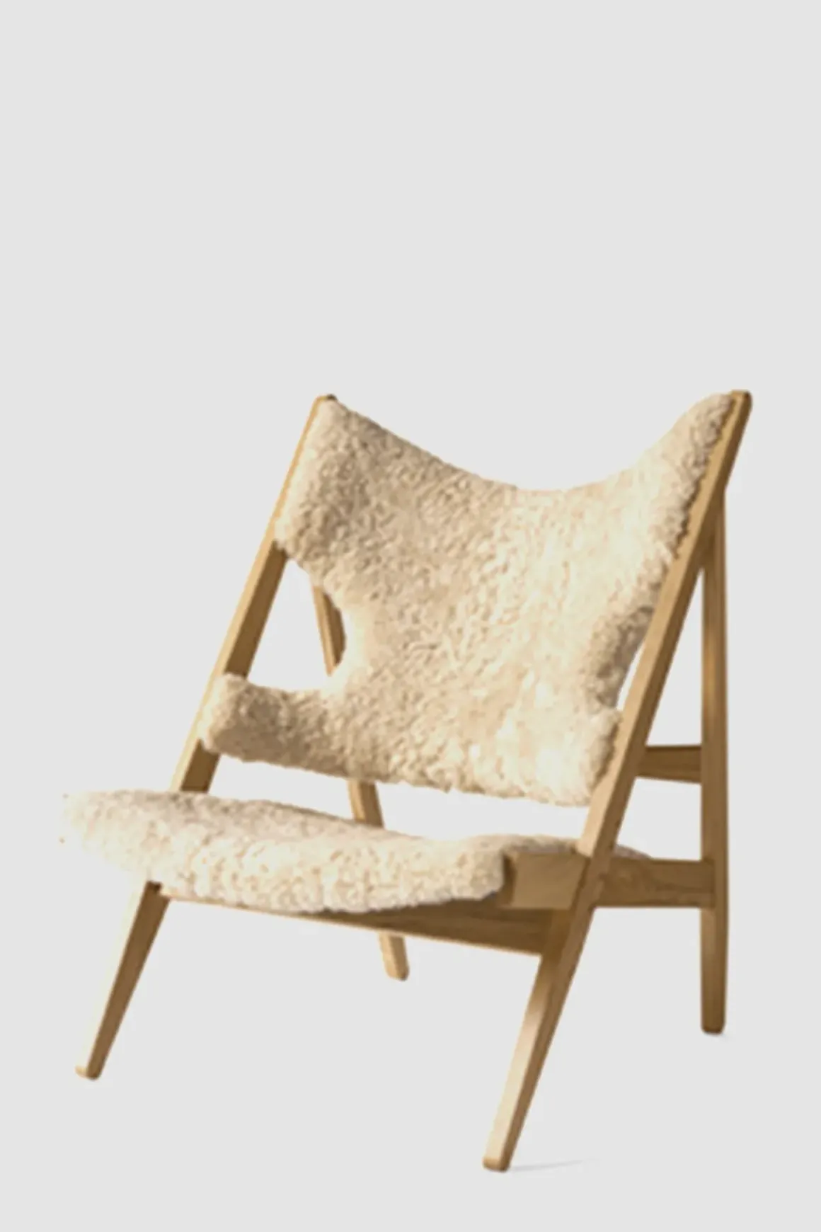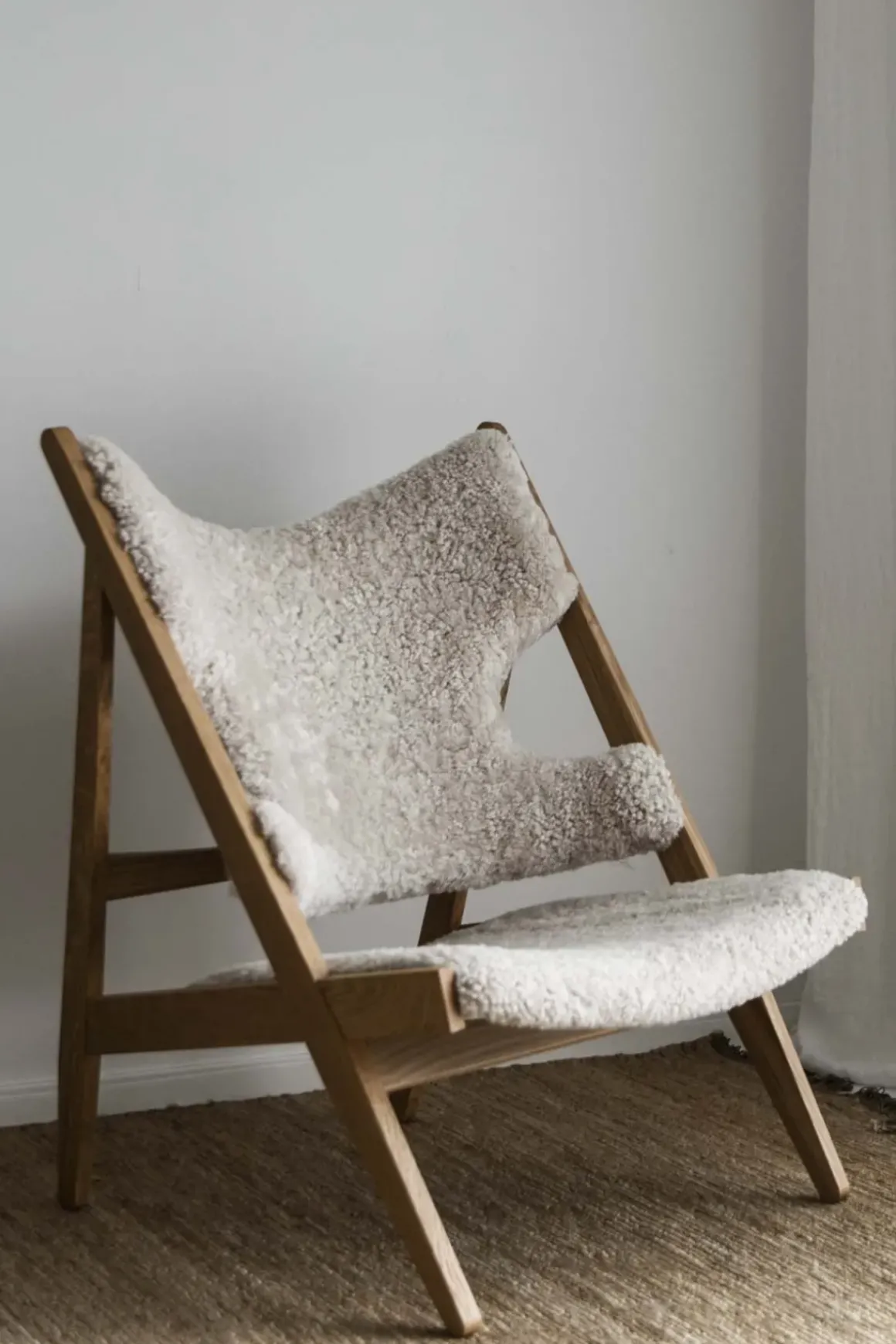 Knitting Lounge Chair, designet av Ib Kofod-Larsen i 1951. Stolen er en gammel klassiker som nå relanseres, deres første relansering av moderne danske ikoner. Stolen er håndlaget i Sverige av håndverkere som kombinerer det beste av tradisjonelle og klassiske teknikker med materialer av høyeste kvalitet. Stolen er like behagelig som den ser ut som, og er oppkalt etter utskjæringene på siden av ryggen som gir optimal komfort når du leser eller strikker. Setet er trukket med myk og deilig saueull for ekstra varme og kos. Stolens lekne karakter og gjennomtenkte design gjør den til et perfekt valg for alle interiørelskere.