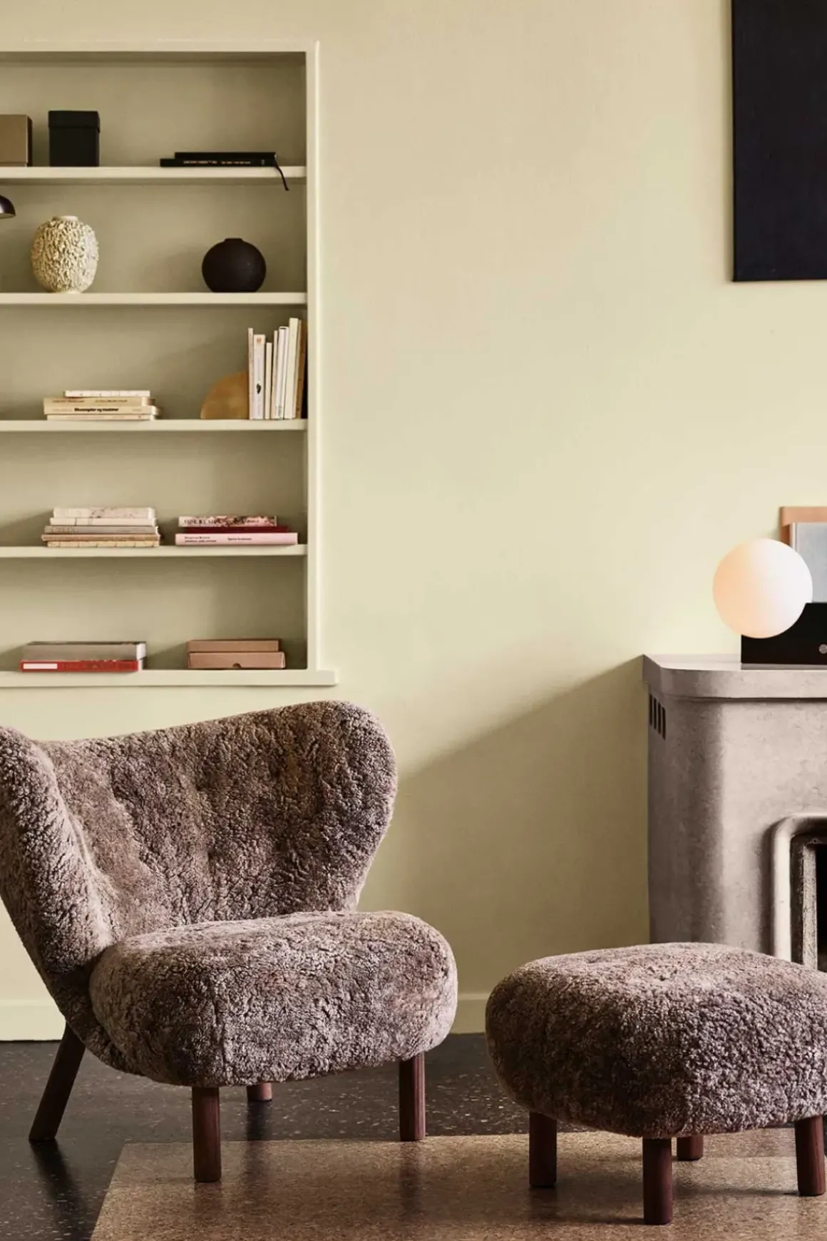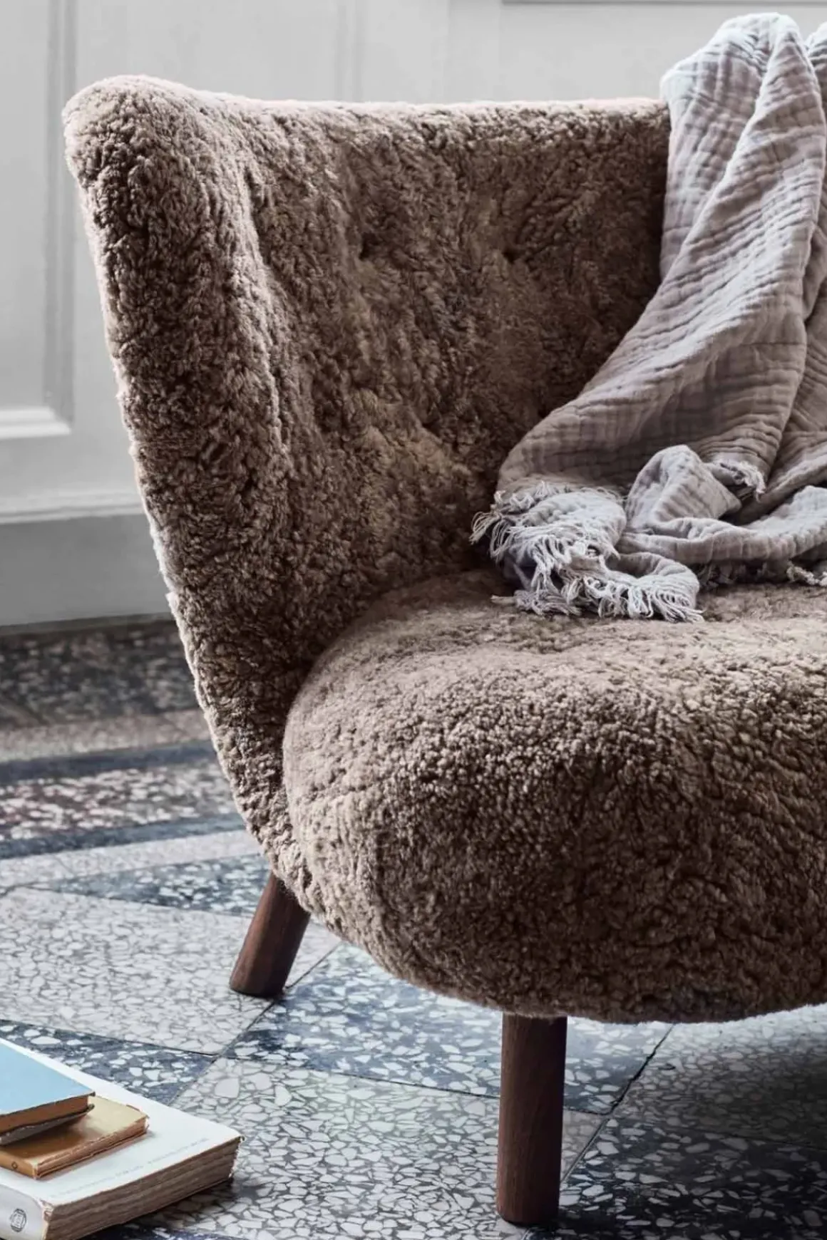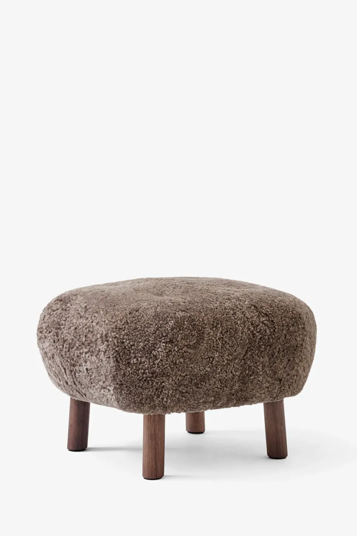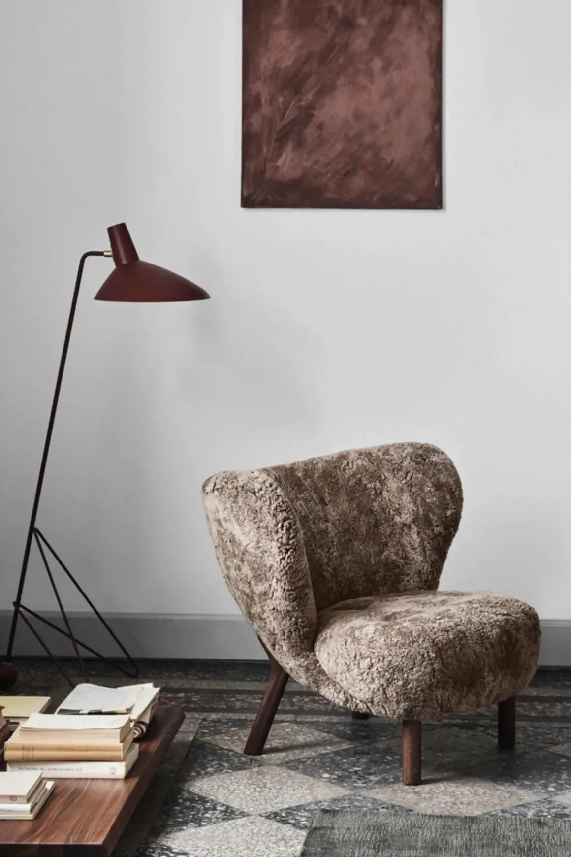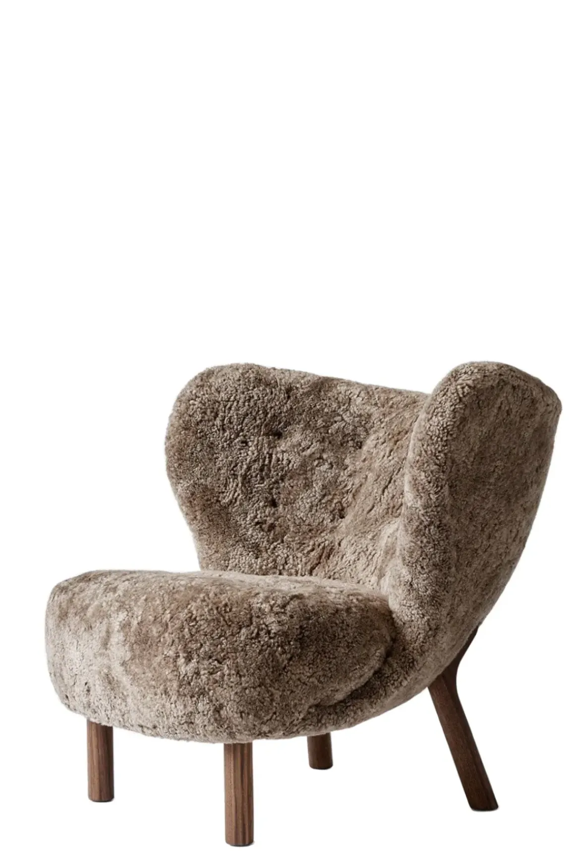 Little Petra Stol fra u0026amp;Tradition, designet av arkitekten Viggo Boesen i 1938. Little Petra ble øyeblikkelig en slager da den ble introdusert i 1938 på Copenhagen Cabinetmakers Guild Exhibition. Stolen er sterkt assosiert med starten på den danske funkis-stilen, og er en av få designs fra Boesen. Little Petra er overraskende allsidig og er i stand til å passe inn i alle slags rom, interiørstiler og miljøer. Denne versjonen har trekk i mørkt saueskinn med ben av valnøtt. En designklassiker som holder seg like moderne år etter år.
