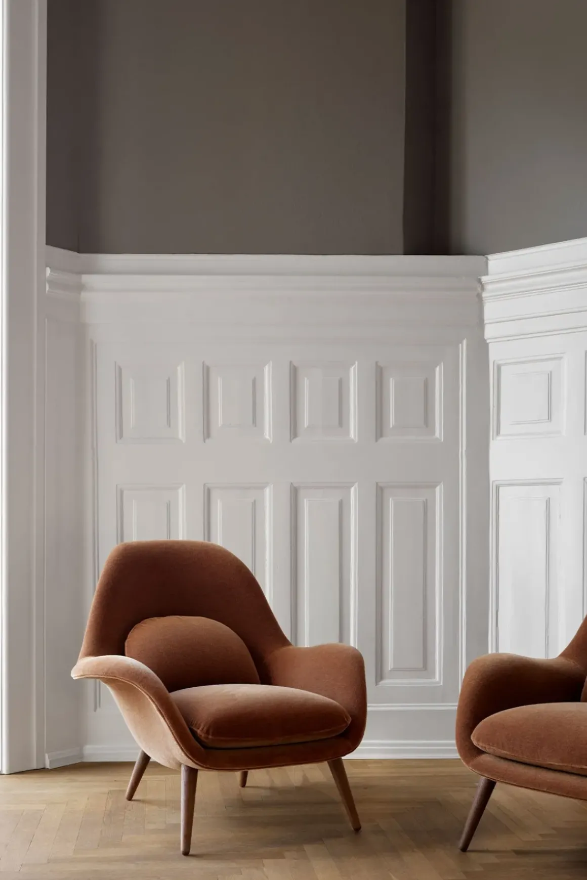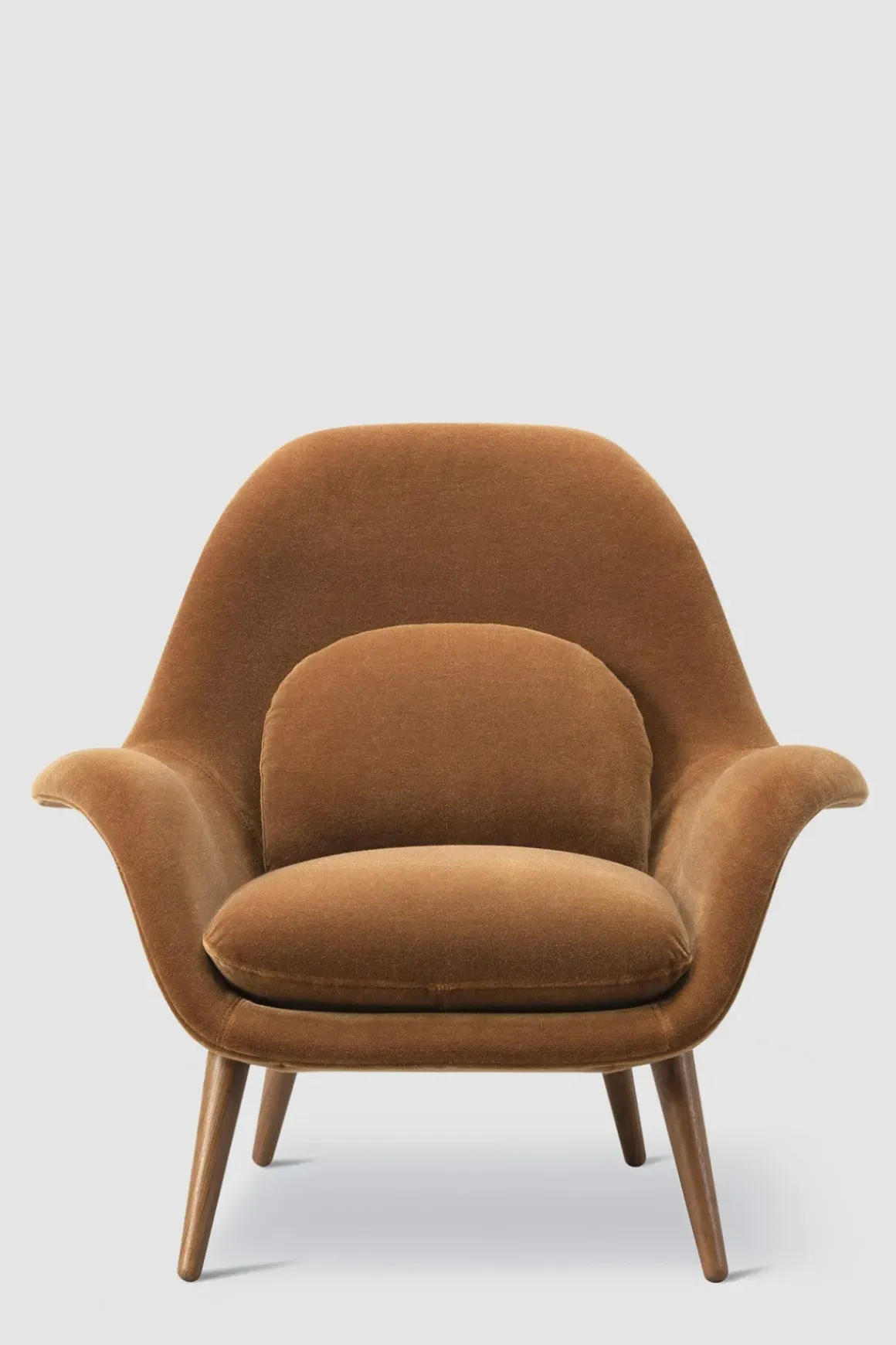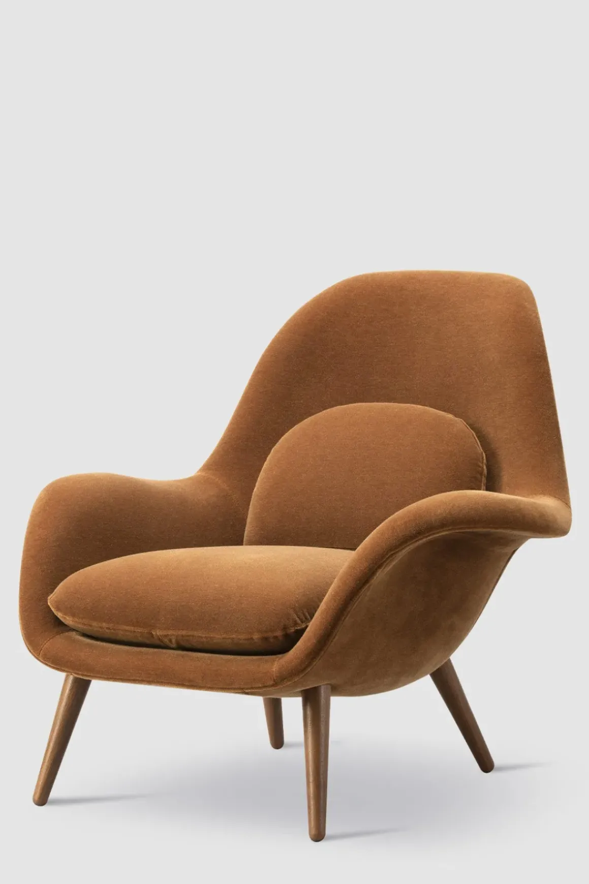 Swoon 1770 lenestol i stoffet Grand Mohair 2103 fra Fredericia. Stolen er designet av Space Copenhagen som har klart å kombinere fantastisk sittekomfort med stilsikkert og varig design. Swoon har en organisk form med svært god støtte til ryggen og inviterer til umiddelbar avslapning, samtidig som designet er minimalistisk og stramt. Lenestolen gjør seg godt i stuen, på soverommet, og også i større resepsjonsområder og salonger. Kan også bestilles med Ottoman puff i samme utførelse, for enda bedre komfort. Swoon er tilgjengelig med stolben i lakkert valnøtt, lakkert eik, beiset, røkt eik og sortlakkert eik.
