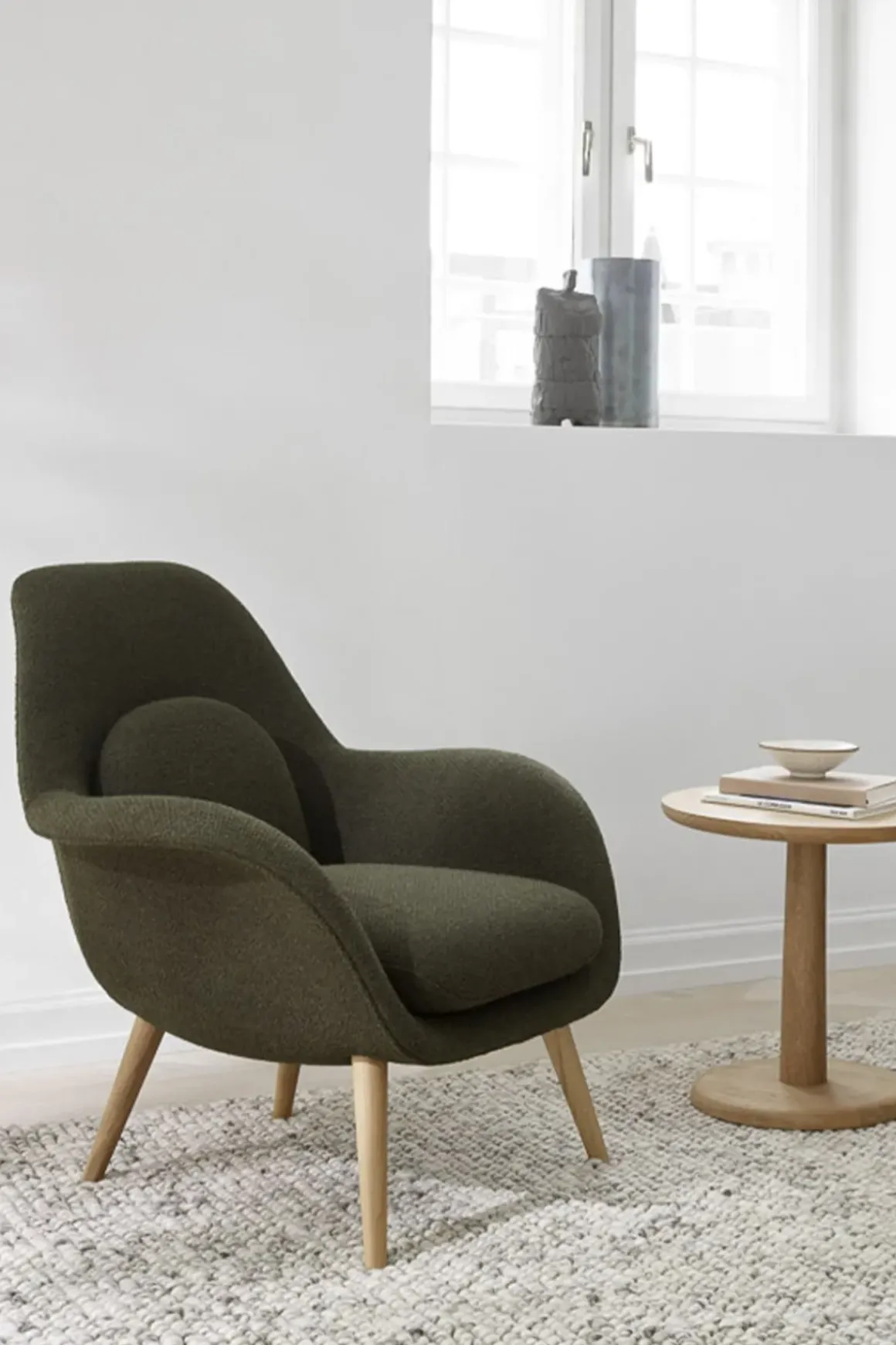 Swoon Petite 1774 lenestol fra Fredericia med base av oljet eik. Utført i det eksklusive stoffet Carlotto 900, et slitesterkt og mykt tekstil i mørkegrønn ullblanding med himmelsk bouclé tekstur. Med det enestående trekket som smelter sammen armlenene, setet og ryggen, i tillegg til støttende, myke puter, har du en moderne og skulpturell stol som passer i alle hjem. Swoon Lounge Petit er en nettere og hakket mer oppreist versjon av sin ikoniske forgjenger Swoon Lounge. Petite versjonen inviterer til total avslapning med sitt imøtekommende design og optimale sittekomfort med god ryggstøtte. Dette er en skandinavisk klassiker du vil få glede av i mange år fremover. I tillegg til diverse tekstiler kan du velge mellom base i flere materialer og stiler. Kom gjerne innom Bolina på Stabekk, hvor vi står klare med tekstilprøver og kan hjelpe deg med å designe din helt egen ‘drømme Swoon’.