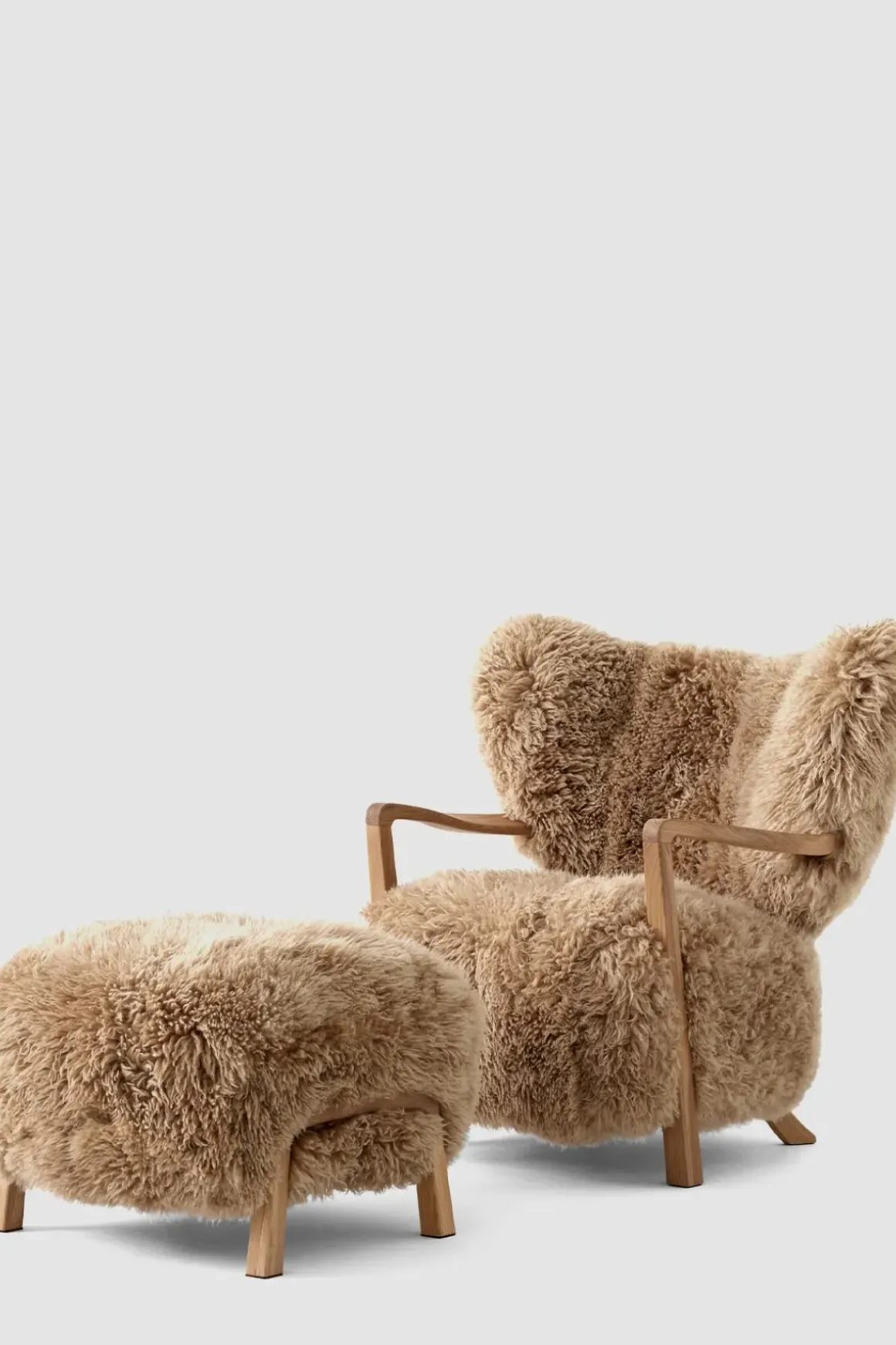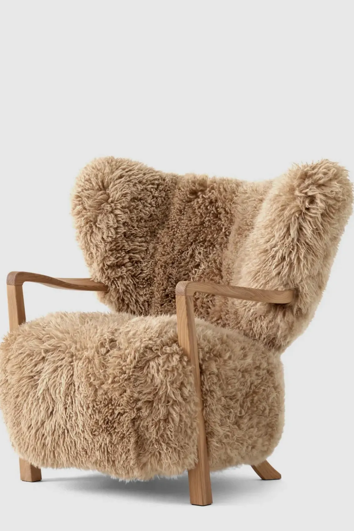 Finn roen med Wulff lenestol fra u0026amp;Tradition. Wulff er en polstret loungestol som hyller de håndlagde designene fra 1930-tallet. Stolrammen er laget av massiv bøk og kryssfiner og deretter dekket med HR-skum og polyestervatt. Bena i heltre eik er dreid, CNC-frest og oljet. Stolen har et luksuriøst, mykt trekk av langhåret saueskinn som dekker setet og ryggstøtten. Wulff står for overlegent håndverk og enestående komfort. Loungestolens arkitektoniske form vil gi et stilig uttrykk til ethvert interiør og vil være et velkomment møbel i stua eller på soverommet. Man kan også kjøpe matchende puff til hvis man ønsker det.