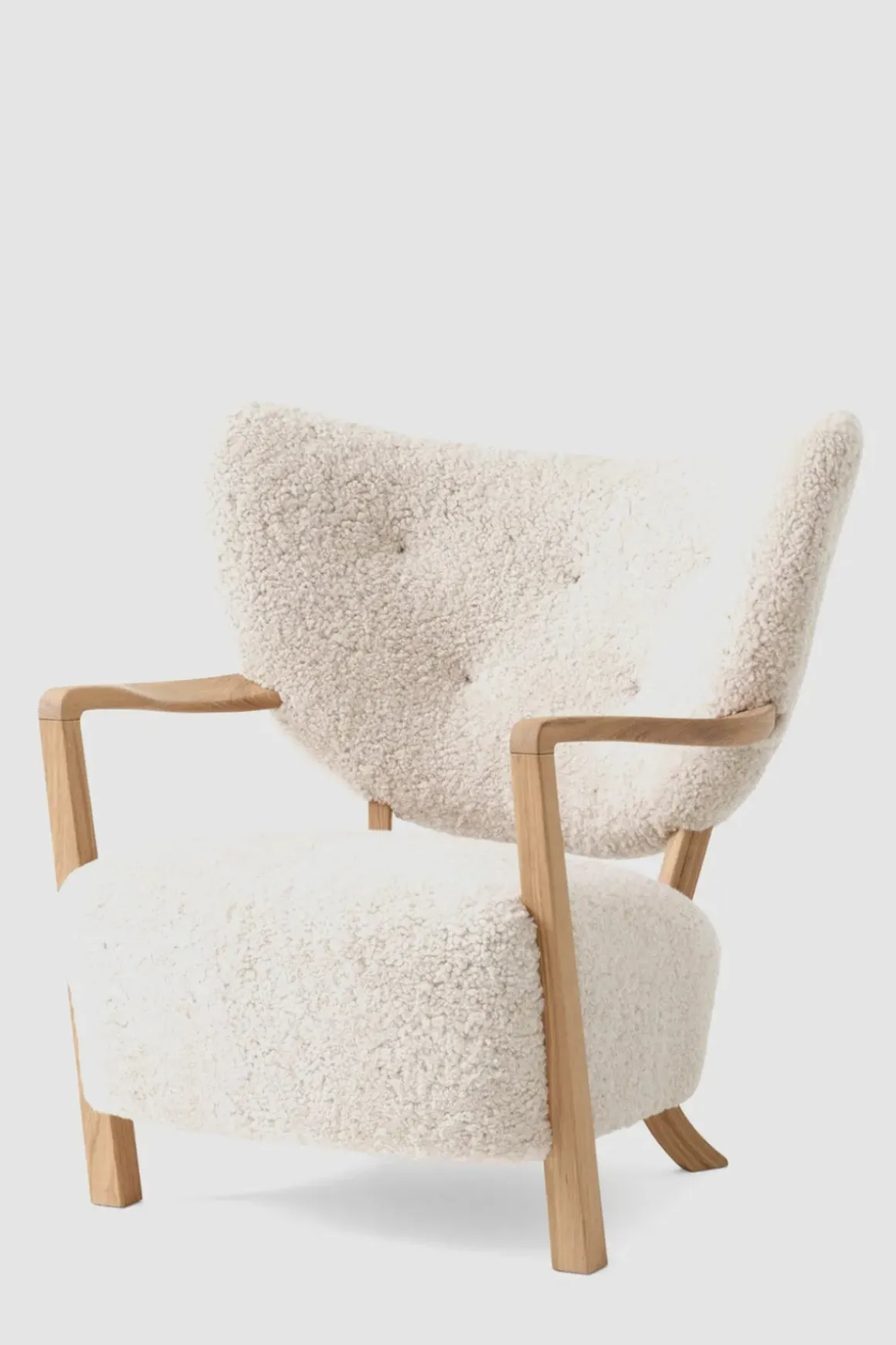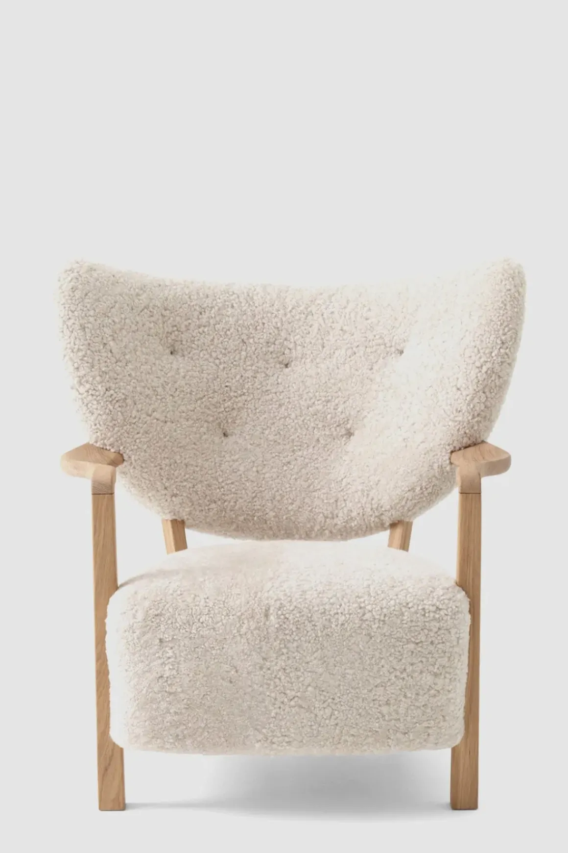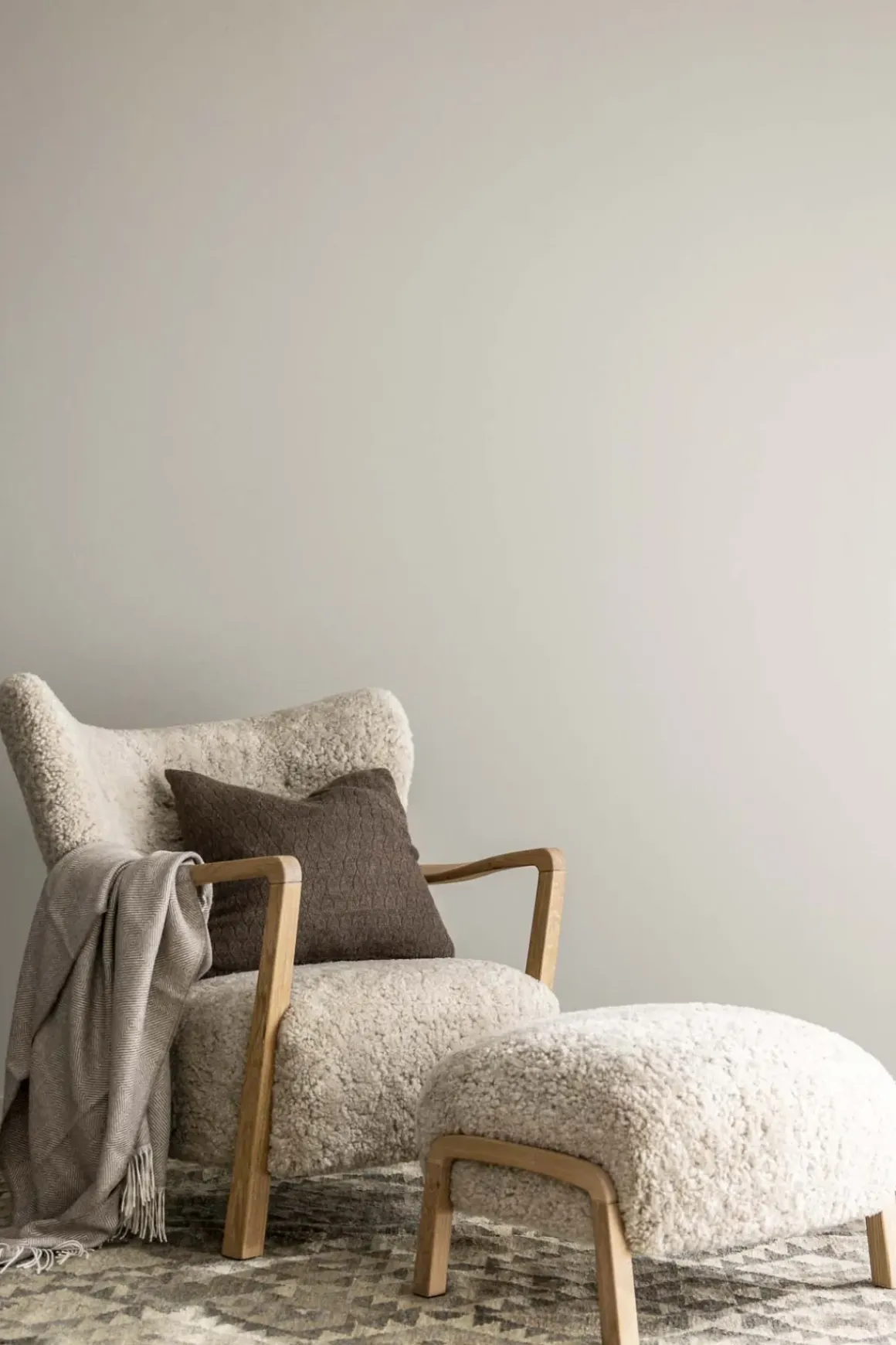Finn roen med Wulff lenestol og puff fra u0026amp;Tradition. Wulff er en polstret loungestol som hyller de håndlagde designene fra 1930-tallet. Stolrammen er laget av massiv bøk og kryssfiner og deretter dekket med HR-skum og polyestervatt. Bena i heltre eik er dreid, CNC-frest og oljet. Stolen har et luksuriøst, mykt trekk av saueskinn som dekker setet og ryggstøtten. Wulff står for overlegent håndverk og enestående komfort. Loungestolens arkitektoniske form vil gi et stilig uttrykk til ethvert interiør og vil være et velkomment møbel i stua eller på soverommet. Den tilhørende puffen er håndlaget med ben av solid eik og kommer i samme møbeltrekk som loungestolen. Bruk den enten som fotskammel til Wulff-stolen eller som en sjarmerende loungekrakk alene.