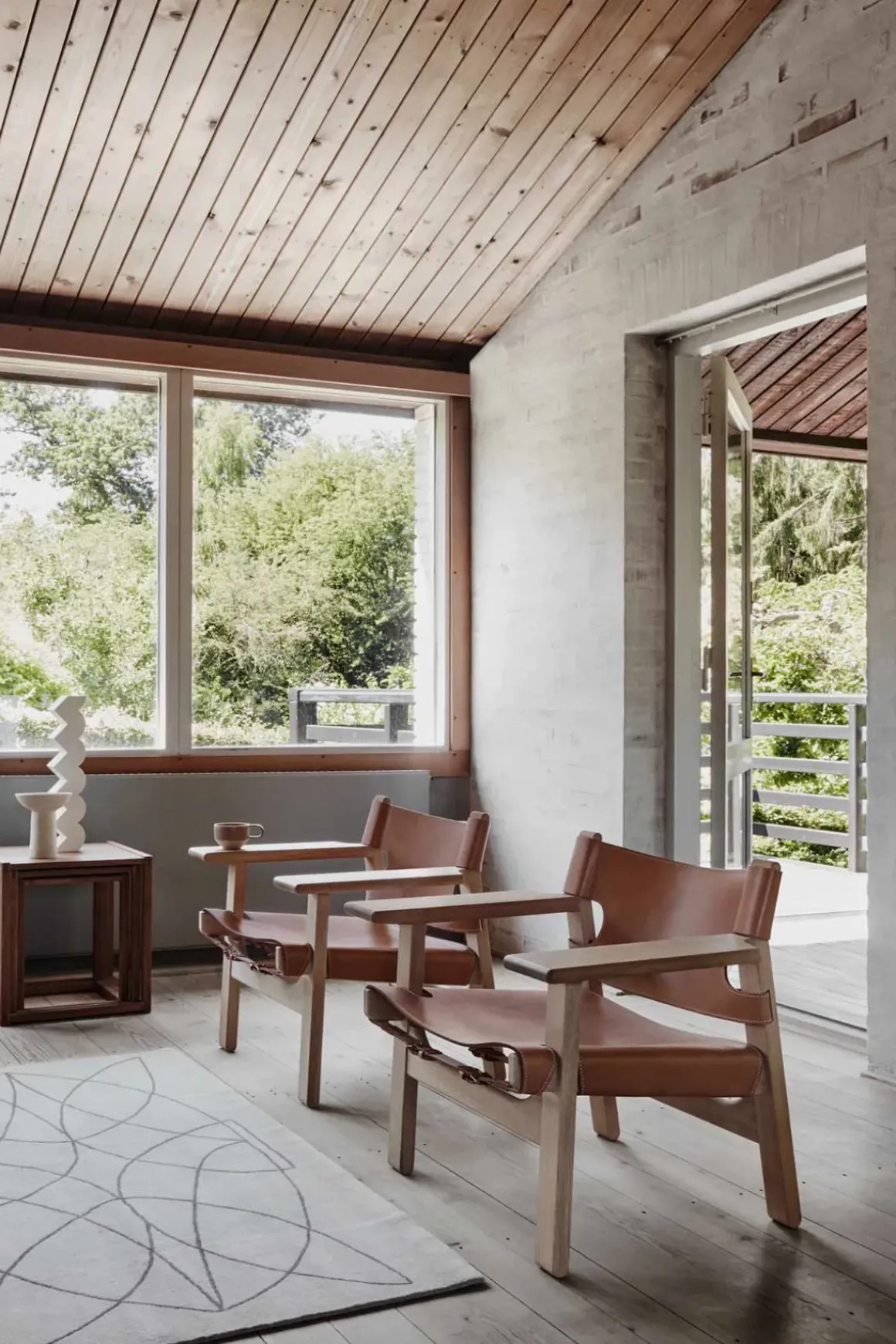 Ikoniske Spanish Chair med stilrent, cognacfarget skinn og understell i oljet eik fra danske Fredericia. Funksjonsdrevet design, nøysomt håndverk, naturlige materialer og vakre, gjennomtenkte detaljer, gjør Spanish Chair til en moderne designklassiker som er like aktuell i dag som da den først ble designet. Børge Mogensen tegnet spanskestolen etter en tur til Spania i 1958 med Hans J. Wegner. Stolen er inspirert av en tradisjonell stol med brede armlener fra området. Han moderniserte formen, men beholdt de karakteristiske, brede armlenene så man lett kan sette fra seg glasset eller kaffekoppen. Materialene brukt i loungestolen er av den høyeste kvalitet og utførelse; fra kvartsaget, massiv eik, til vegetabilsk farget skinn og messingspenner som sammen gir stolen et enkelt og sterkt uttrykk. Med tiden vil skinnet strekke seg og man kan ta i bruk messingspennene under for å stramme skinnet tilbake til sin opprinnelige form. Stolen vil etterhvert utvikle en vakker patina som gir karakter, og som bare gjør den finere med tiden. De slitesterke og bærekraftige materialene gjør at stolen har svært lang levetid og kan gå i arv. Spanish Chair kan også fås med sort eller natur-skinn og understellet kommer i flere varianter: såpebehandlet, oljet, lysoljet, røkt og oljet, lakkert eller sortlakkert eik.