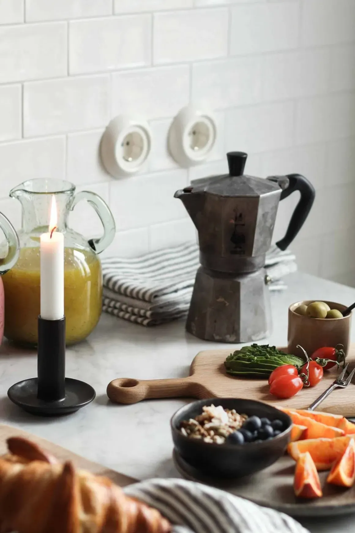 Minimalistisk, håndlaget lysestake i keramikk fra svenske Tell Me More i en matt, mørk gråfarge.