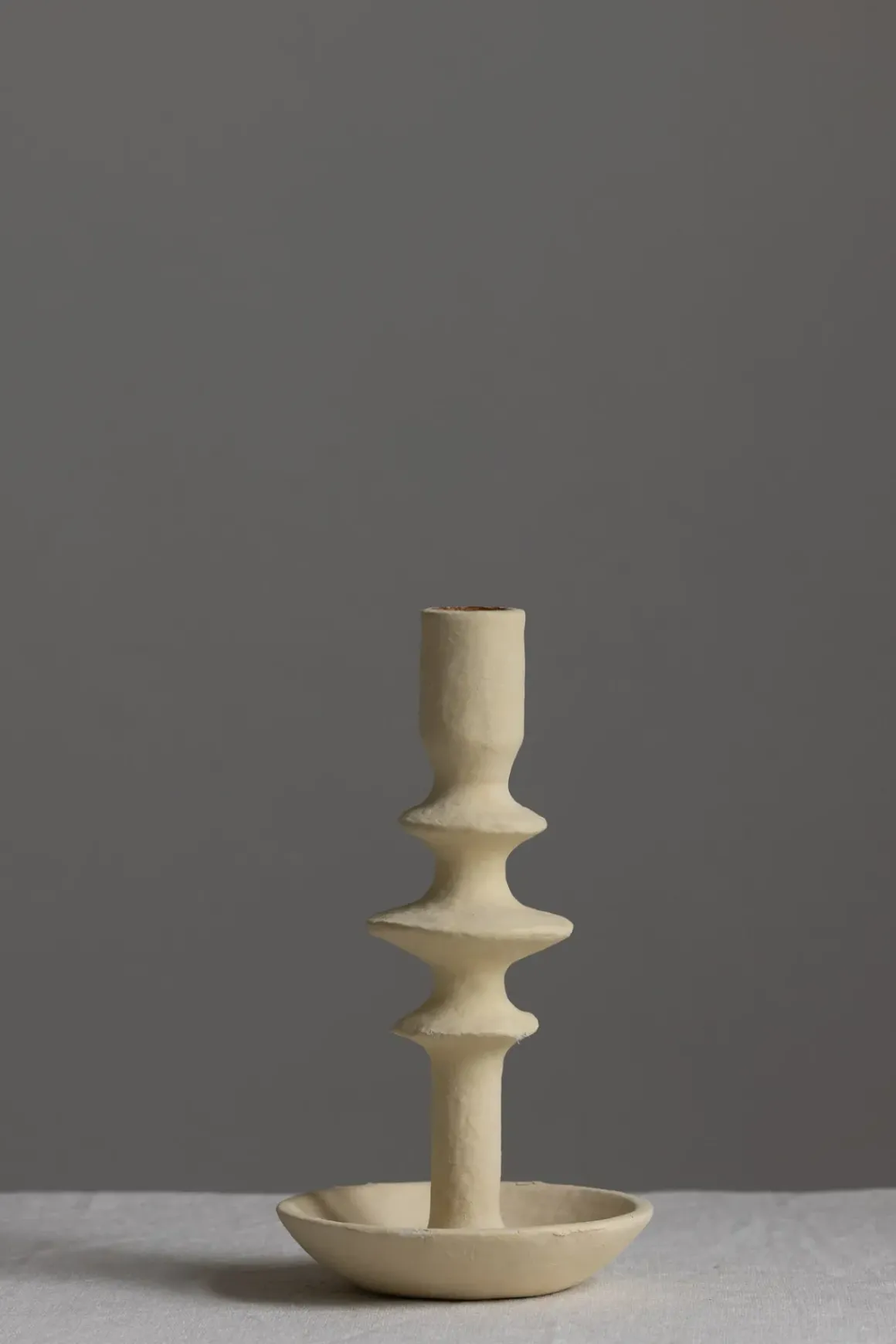 Lysestake fra Snowdrops Copenhagen i papirmaché. Lysestaken har en kunstnerisk, bølgende form som tilfører et spennende preg til ethvert interiør. Den nøytrale fargen gjør den enkle å kombinere med ulike stiler, og kommer i tre ulike varianter, noe som gir mulighet for å skape variasjon og dybde i innredningen. For å sikre trygg bruk anbefales det å benytte LED-lys og unngå plassering nær varmekilder, siden materialet er brennbart.