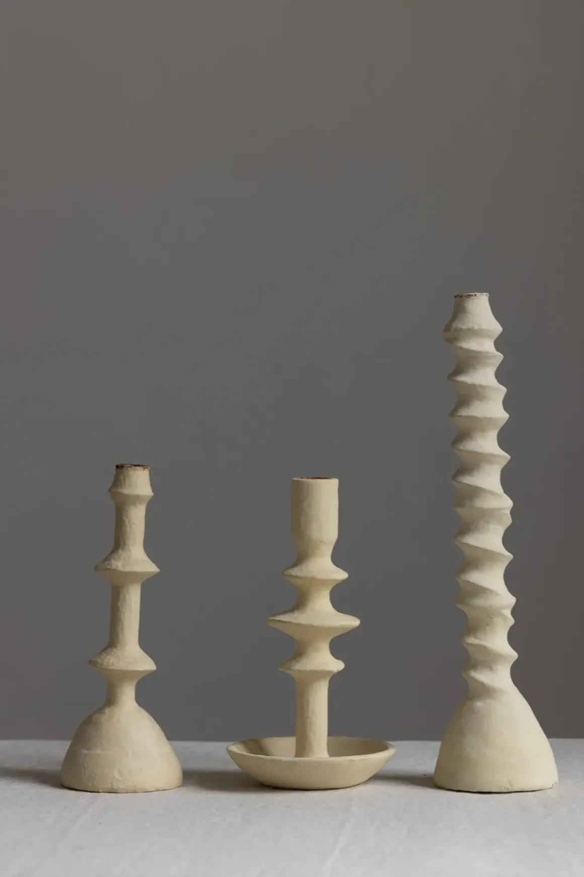 Lysestake fra Snowdrops Copenhagen i papirmaché. Lysestaken har en kunstnerisk, bølgende form som tilfører et spennende preg til ethvert interiør. Den nøytrale fargen gjør den enkle å kombinere med ulike stiler, og kommer i tre ulike varianter, noe som gir mulighet for å skape variasjon og dybde i innredningen. For å sikre trygg bruk anbefales det å benytte LED-lys og unngå plassering nær varmekilder, siden materialet er brennbart.