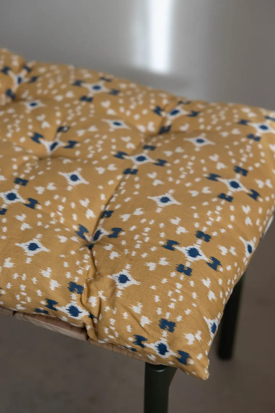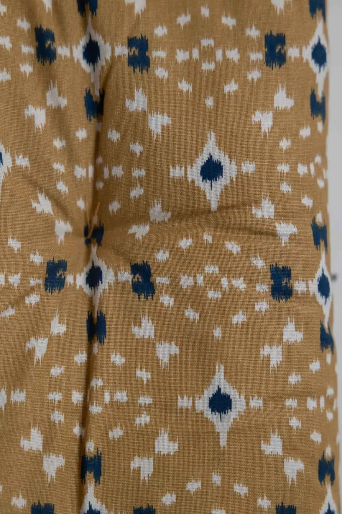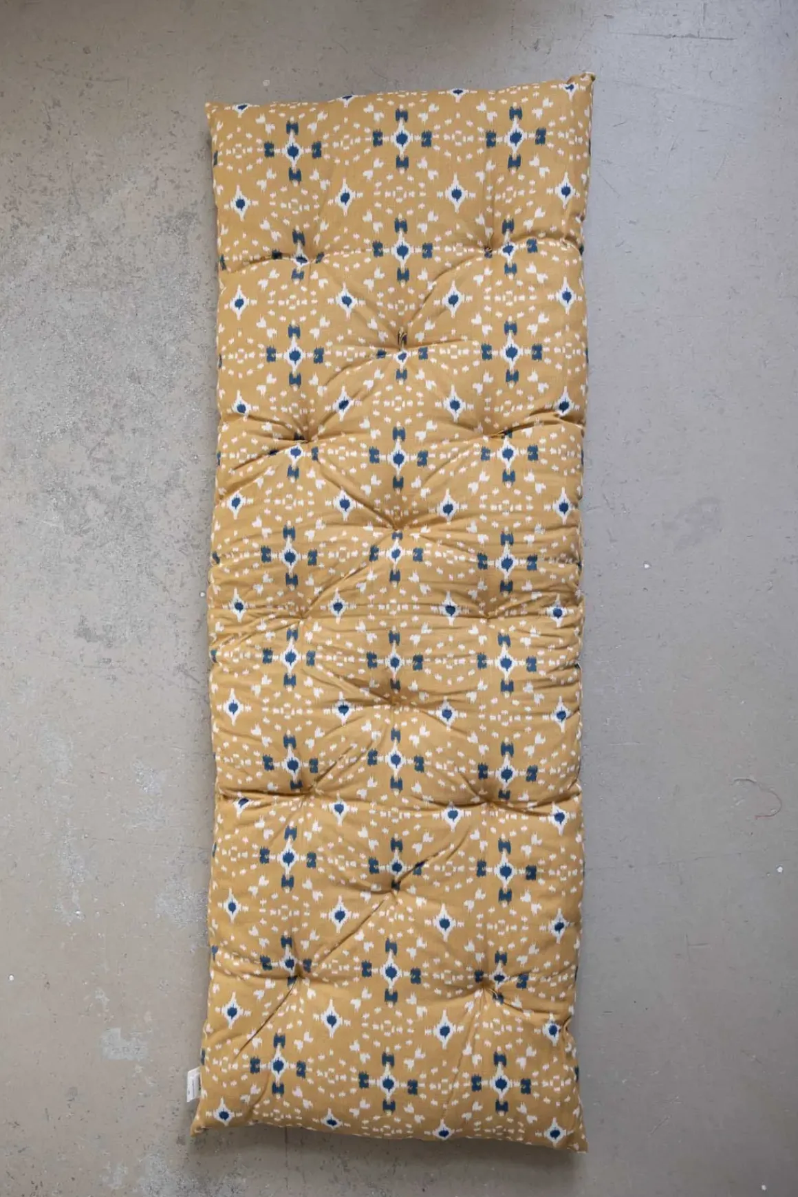 Fargerik bomullsmadrass med heldekkende mønster inspirert av tradisjonelle indiske blokktrykk. Perfekt for å gi benken et nytt uttrykk og ekstra komfort, enten du bruker den inne eller ute på terrassen. Unngå direkte sollys, da fargene kan falme. Madrassen er fylt med resirkulerte bomullsrester og tåler rengjøring med fuktig klut.