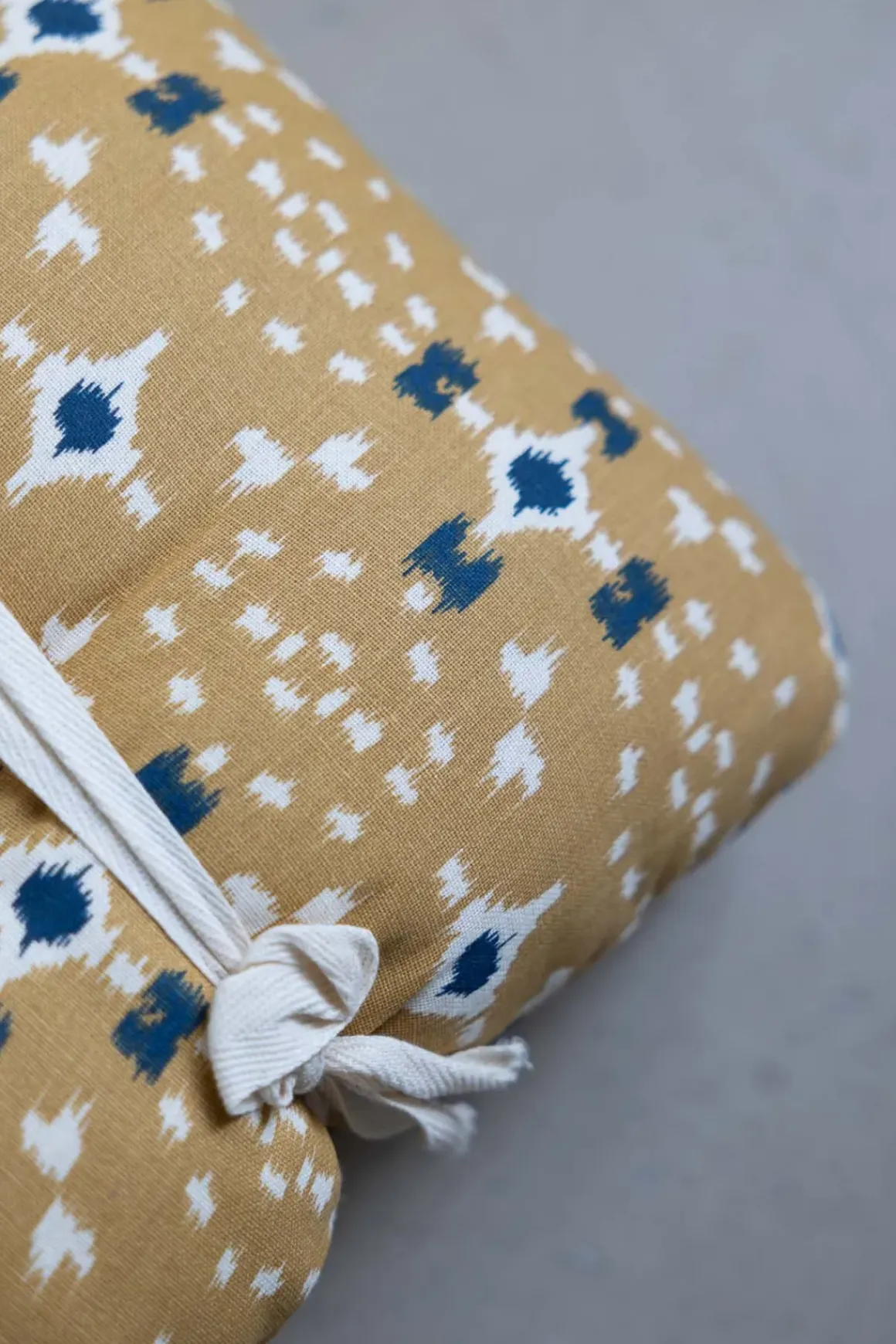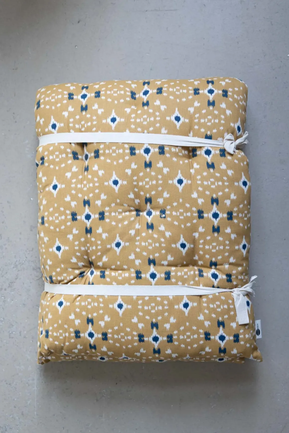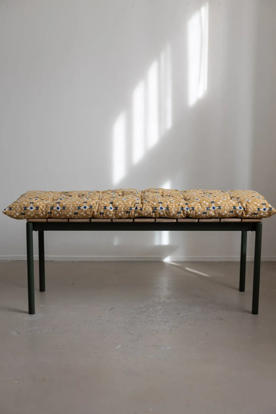Fargerik bomullsmadrass med heldekkende mønster inspirert av tradisjonelle indiske blokktrykk. Perfekt for å gi benken et nytt uttrykk og ekstra komfort, enten du bruker den inne eller ute på terrassen. Unngå direkte sollys, da fargene kan falme. Madrassen er fylt med resirkulerte bomullsrester og tåler rengjøring med fuktig klut.