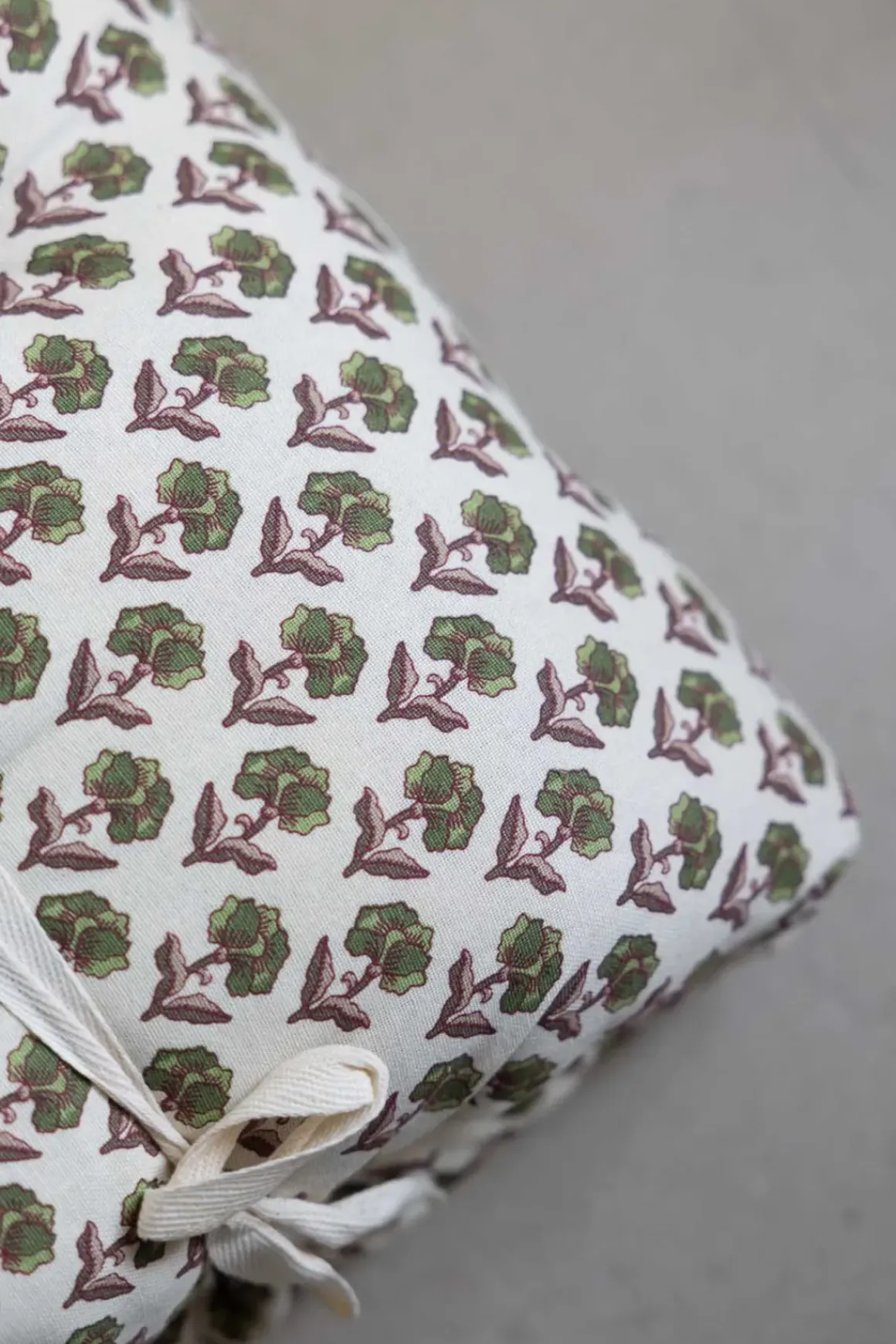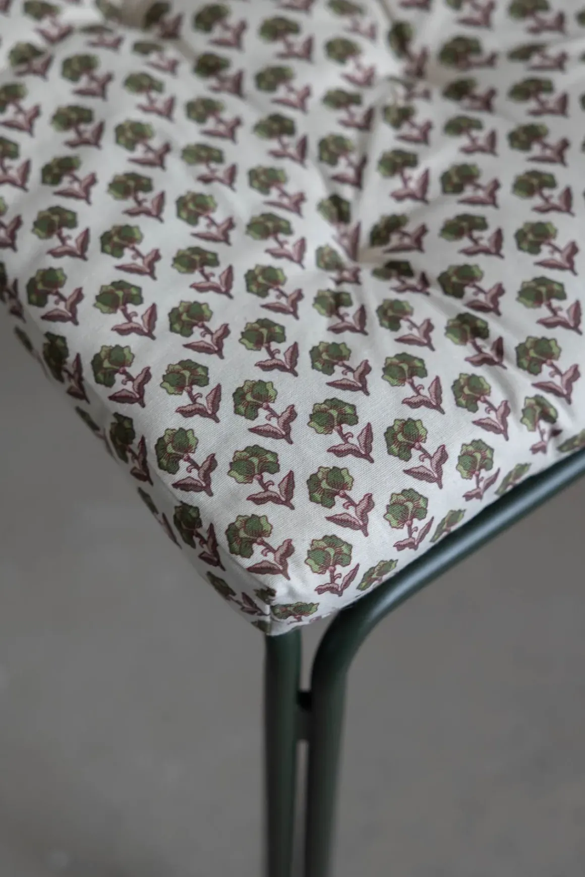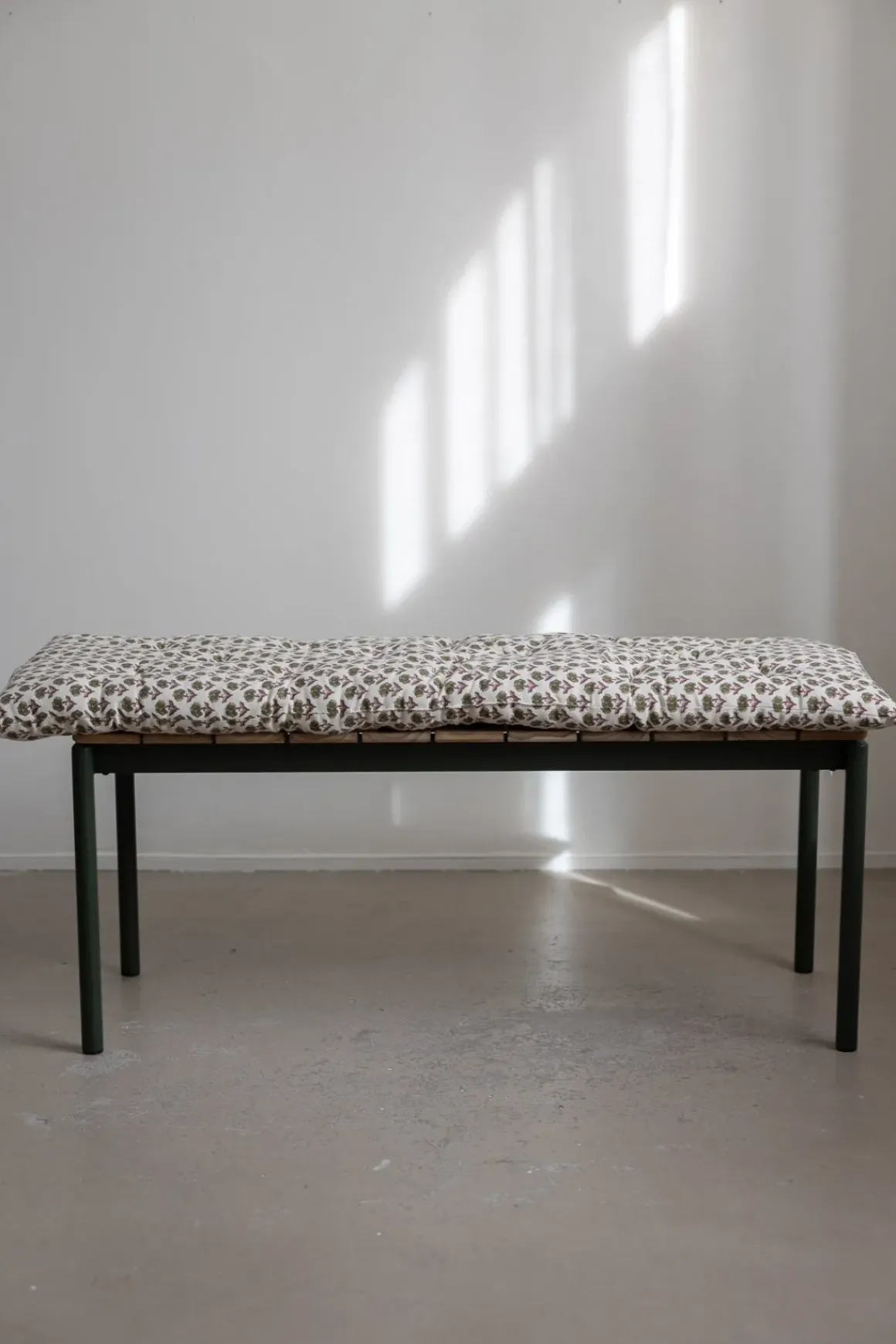 Fargerik bomullsmadrass med heldekkende trykk, inspirert av tradisjonelle indiske blokktrykk. Madrassen gir benken et nytt og levende uttrykk samtidig som den sørger for ekstra komfort. Den passer perfekt både inne og ute på terrassen, og tilfører en lun og innbydende stemning uansett hvor du plasserer den. Fyllet består av resirkulerte bomullsrester fra tekstilproduksjon, og det slitesterke bomullstrekket tåler rengjøring med en fuktig klut. Unngå å utsette produktet for direkte sollys, da fargene kan falme over tid.