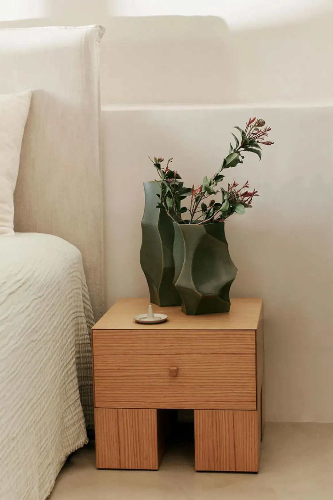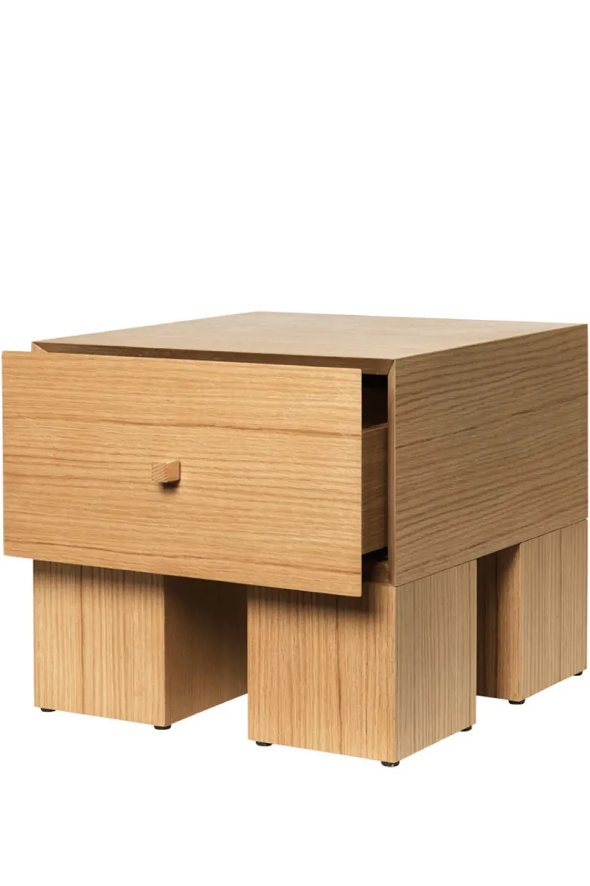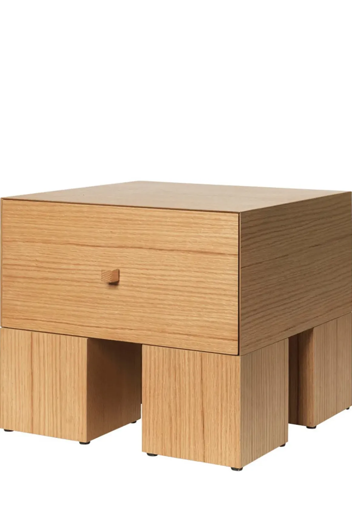 Nattbordet Kuben fra Ferm Living er laget av FSC™-sertifisert, naturlig eikefiner. Den tydelige, kubeformede silhuetten med gjærede skjøter gir inntrykk av en sømløs boks, mens de markante, kubeformede føttene tilfører designet en særegen karakter. Små håndtak setter prikken over i-en og understreker nattbordets lekne detaljer. Kuben kombinerer funksjonalitet med et minimalistisk uttrykk, gir god oppbevaringsplass og har et moderne design som passer inn i mange ulike interiører.