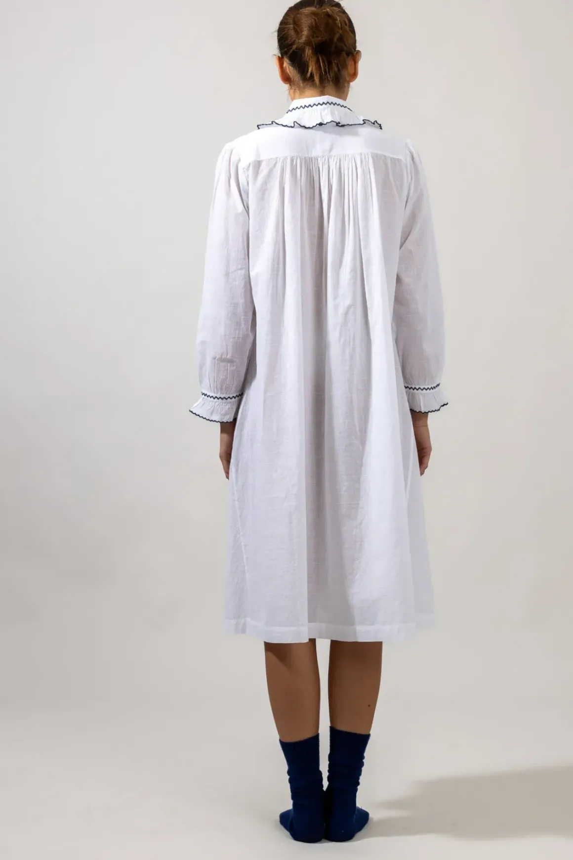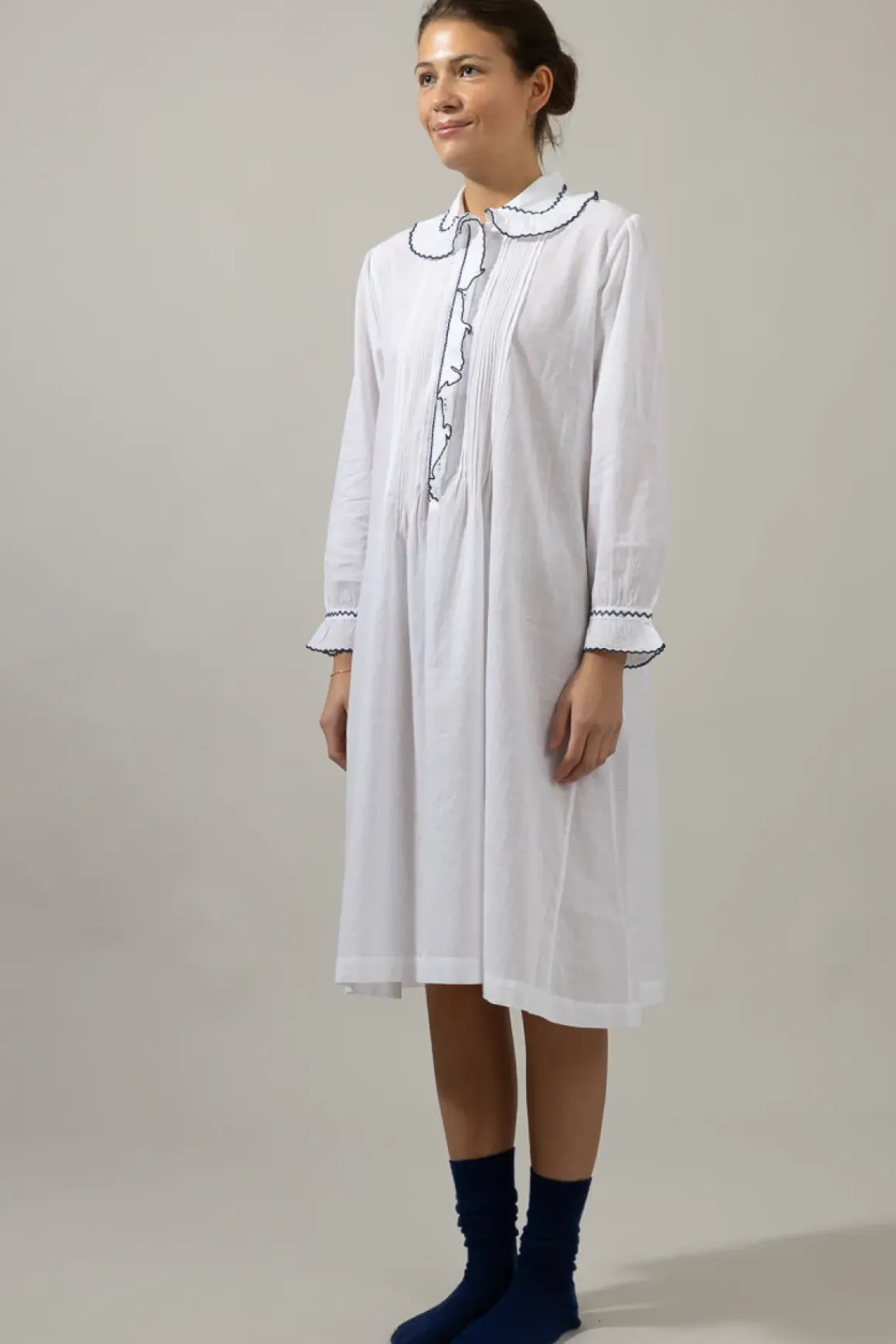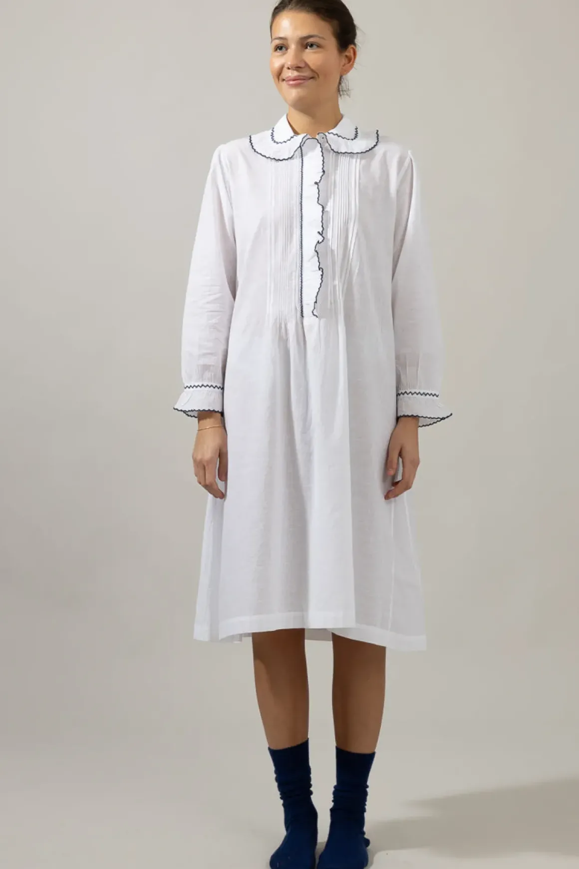 Maria-nattkjolen fra Scarlette Ateliers har en nostalgisk sjarm med sine romantiske detaljer og klassiske snitt. Den søte Claudine-kragen med håndbroderte detaljer og de brede mansjettene med knapper gir kjolen et sjarmerende uttrykk. Den er laget i 100% bomull, er knelang og kommer i én størrelse som passer fra størrelse 38 til 44. Med kneppet åpning foran er den både praktisk og feminin. Perfekt som en behagelig nattkjole, men kan også brukes som en lett sommerkjole på varme dager.