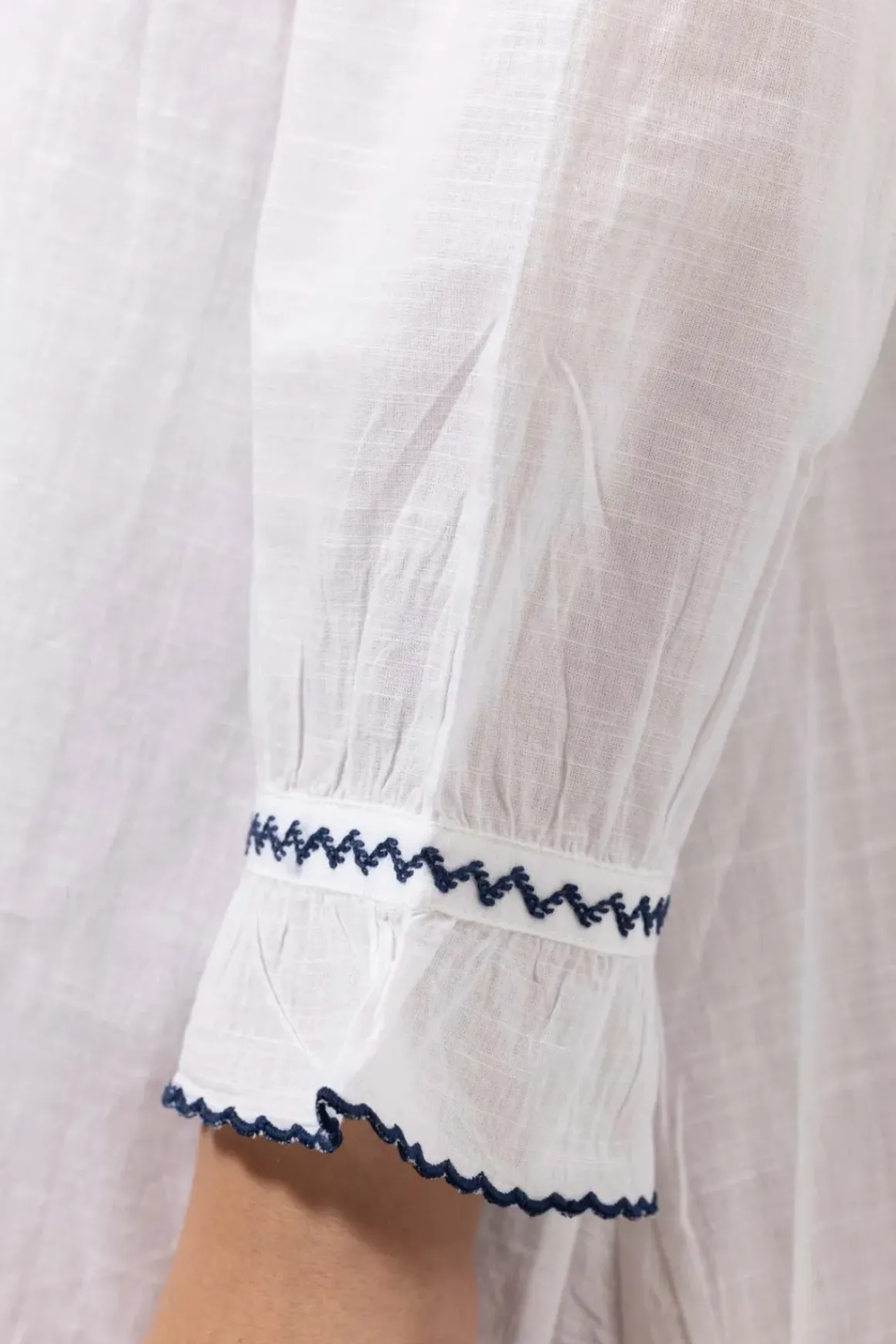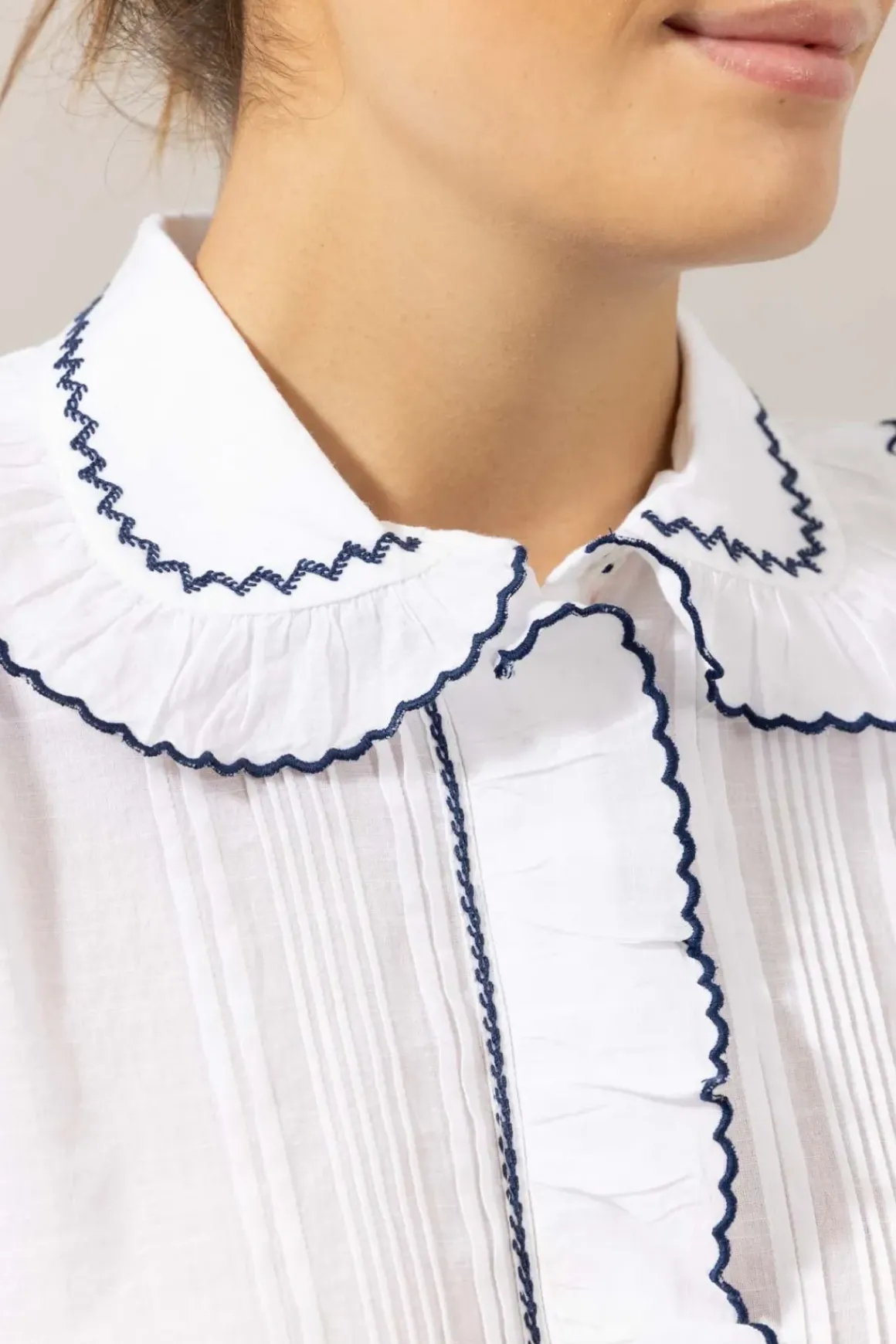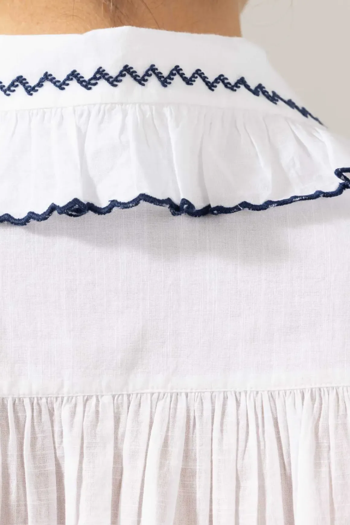 Maria-nattkjolen fra Scarlette Ateliers har en nostalgisk sjarm med sine romantiske detaljer og klassiske snitt. Den søte Claudine-kragen med håndbroderte detaljer og de brede mansjettene med knapper gir kjolen et sjarmerende uttrykk. Den er laget i 100% bomull, er knelang og kommer i én størrelse som passer fra størrelse 38 til 44. Med kneppet åpning foran er den både praktisk og feminin. Perfekt som en behagelig nattkjole, men kan også brukes som en lett sommerkjole på varme dager.