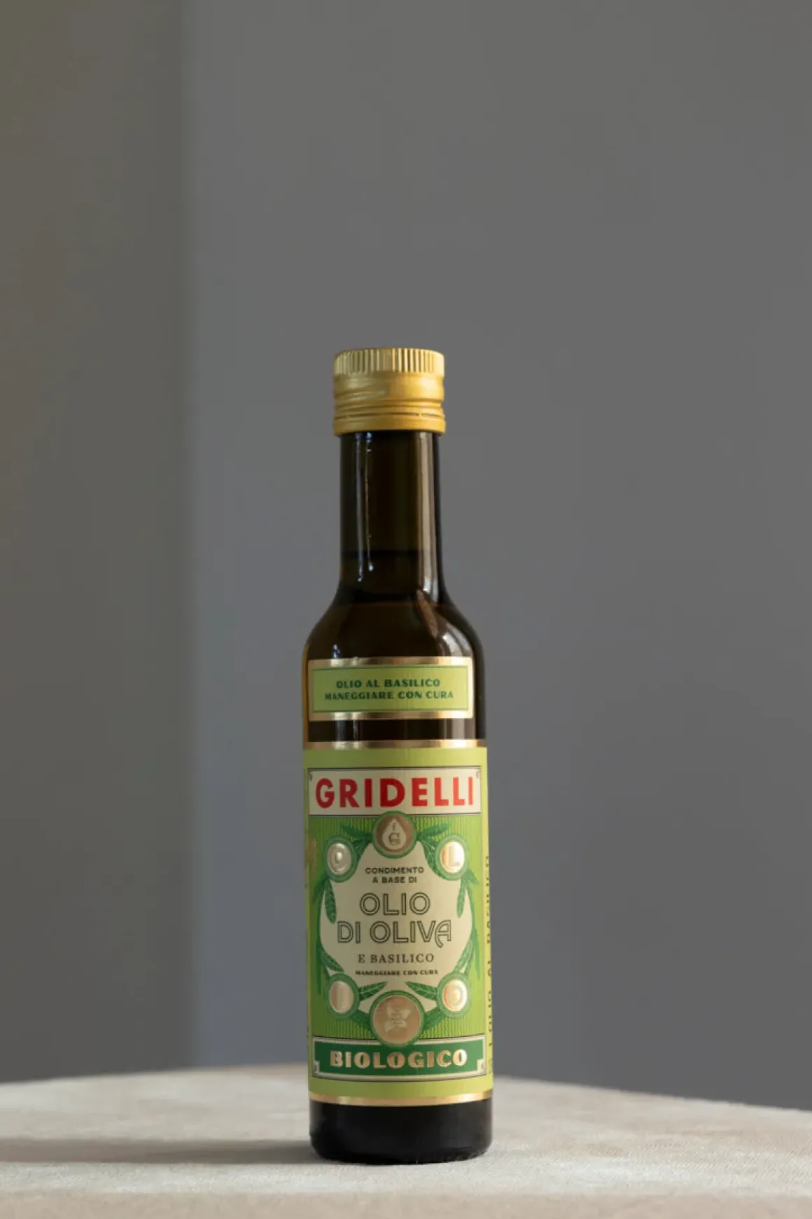 Organisk kaldpresset olivenolje av høy kvalitet smaksatt med basilikum fra favoritten Gridelli. Økologiske ingredienser. 100 ml