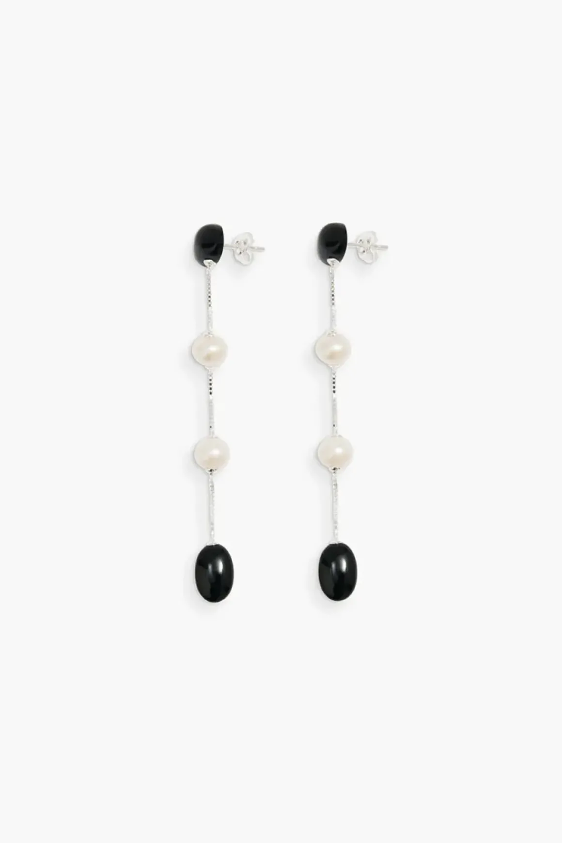 Dualism øredobber fra Ragbag. Disse lange øredobbene har en kombinasjon av kremhvite ferskvannsperler og dype, svarte onyx-steiner, koblet sammen med detaljer i 925 sterlingsølv. Designet skaper en fin bevegelse og tilfører en følelse av letthet, samtidig som kontrasten mellom perler og onyx gir et unikt uttrykk. Perfekte for deg som vil ha et smykke som skiller seg ut, både til hverdags og til festligere anledninger.