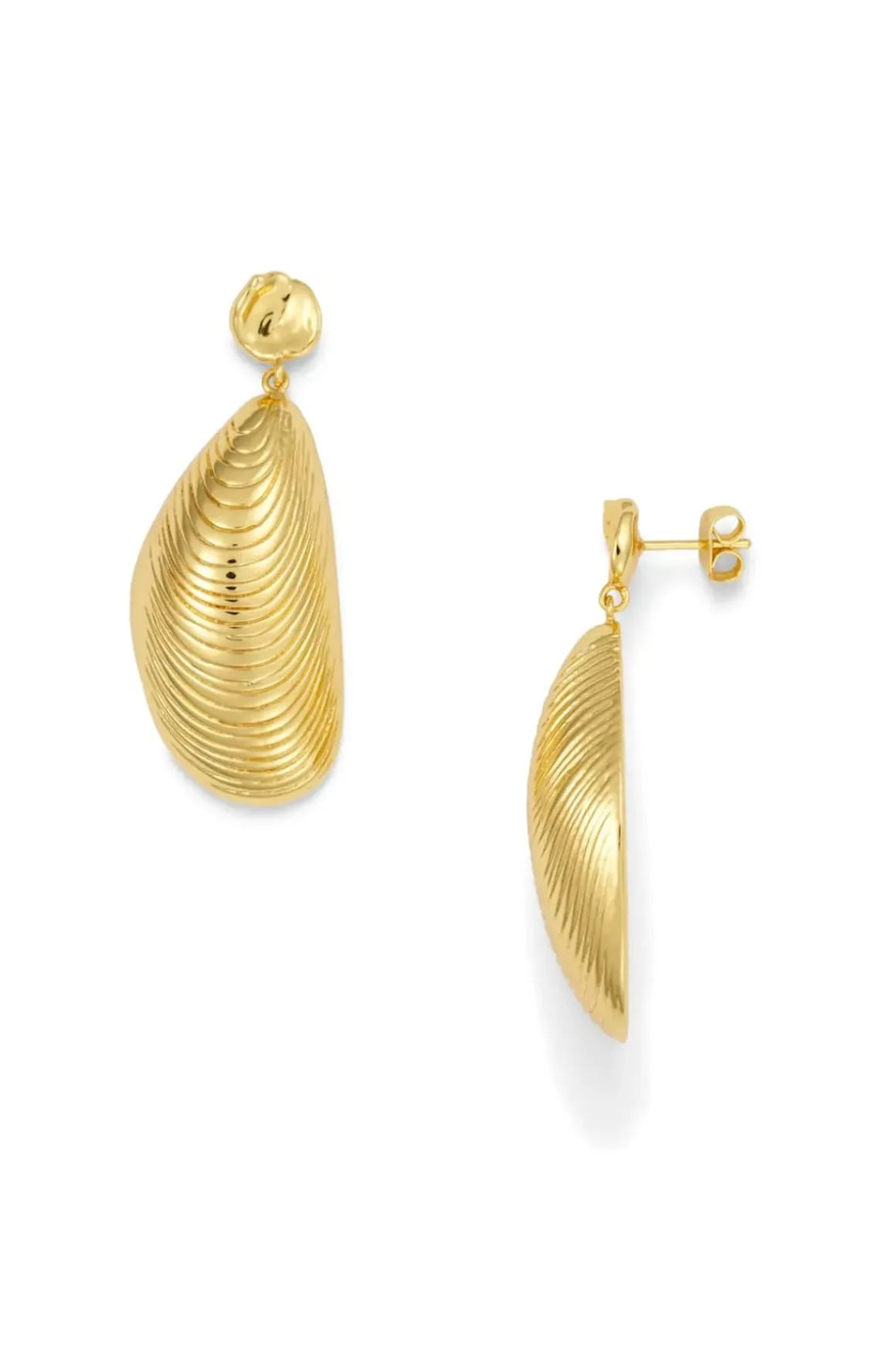 Moules-øredobbene fra Anni Lu og Il Mare-kolleksjonen er inspirert av muslingens naturlige skjønnhet og havets organiske former. De gyldne detaljene fanger lyset på en subtil måte og gir et blikkfang som er både tidløst og unikt. Perfekte for å tilføre et hint av havets magi til ethvert antrekk.