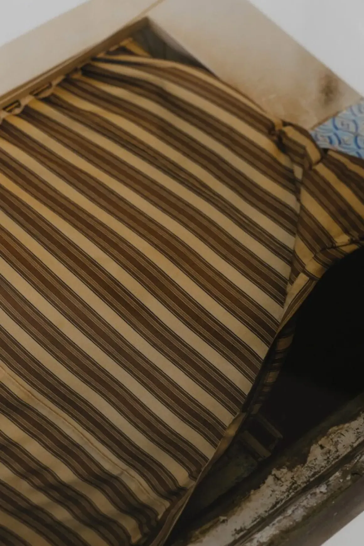 Plakaten av Julian Zerressen, laget eksklusivt for The Poster Club, er et fotografisk kunsttrykk som fanger en stemningsfull scene med en stripete gardin som delvis dekker en åpning, der lys og skygge spiller sammen på en harmonisk måte. De varme tonene og de teksturerte detaljene gir bildet en sanselig dybde, mens de subtile kontrastene mellom stoff, fliser og omgivelser skaper en balanse mellom det strukturerte og det organiske. Dette er et motiv som inviterer til undring og refleksjon, perfekt for en stilren og inspirerende innredning.