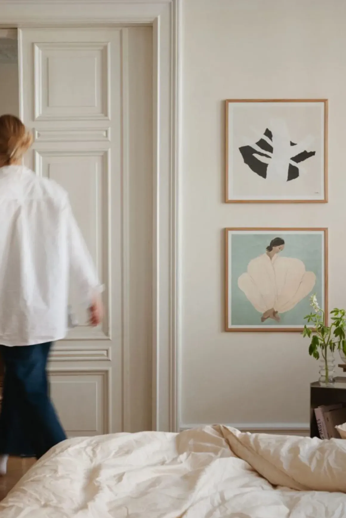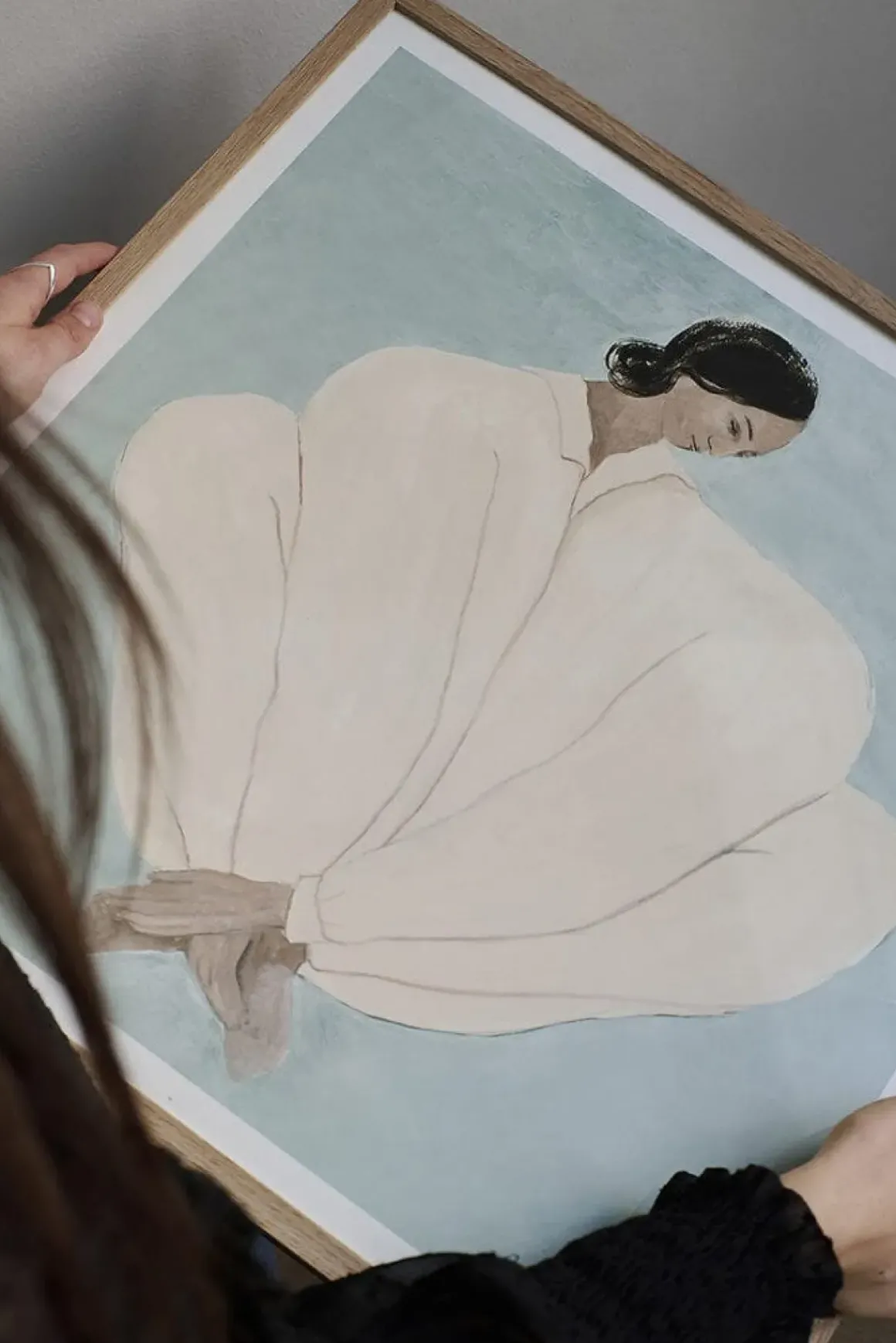 Plakaten av Sofia Lind, laget eksklusivt for The Poster Club og en del av The Paris Metro Collection, er inspirert av offentlig kunst og arkitektur, spesielt stemningen og fargepaletten i fire metrostasjoner i Paris. Med et mykt og balansert uttrykk skildrer motivet en figur i en avslappet, nesten flytende positur, der de dempede blågrønne tonene danner en rolig bakgrunn for de lyse, draperte klærne. Penselstrøkene og komposisjonen gir en sanselig dybde, mens kunstnerens karakteristiske stil tilfører motivet en subtil følelse av bevegelse og refleksjon.