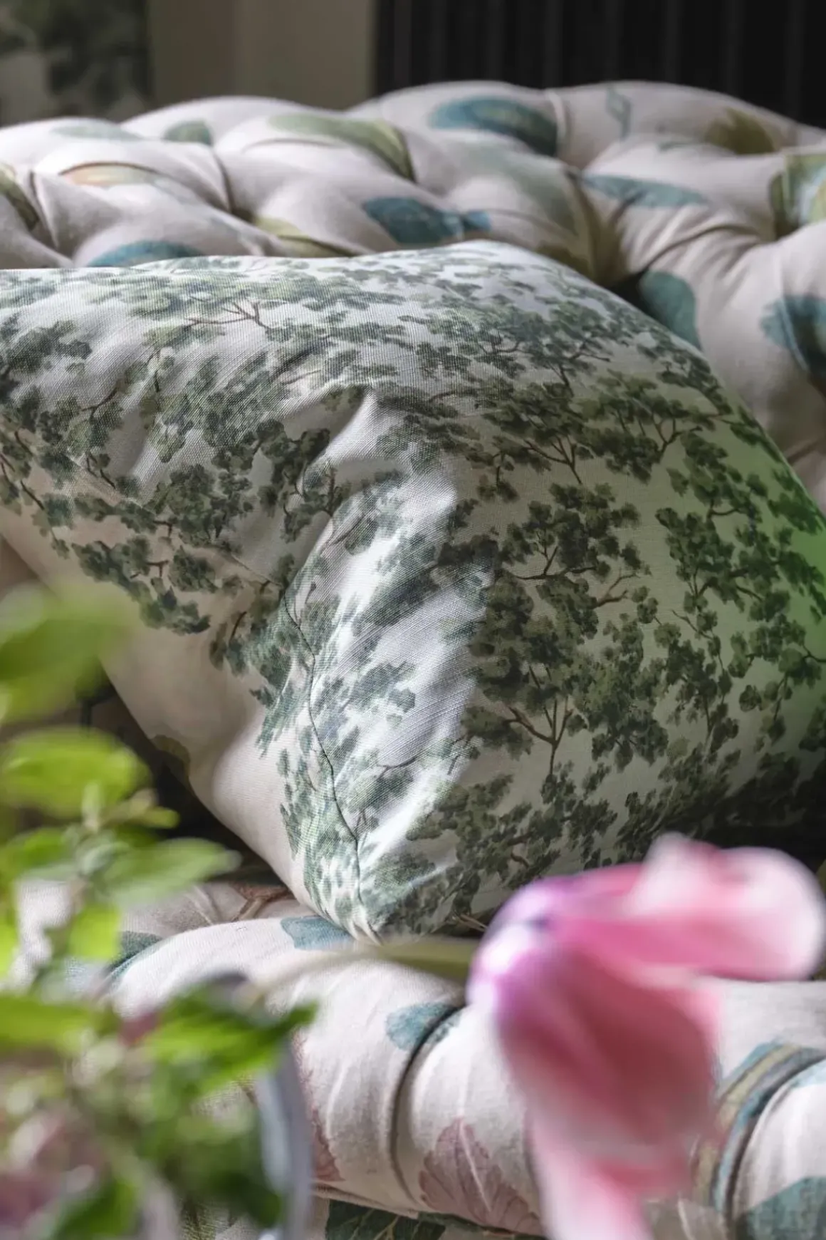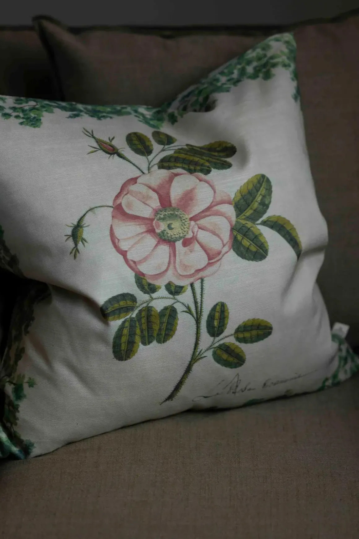 Dekorativ stor botanisk rose med grafiske blader er kunstnerisk arrangert på denne firkantede blomsterputen fra John Derian. Innrammet av trær og grener, som også utgjør det heldekkende mønsteret på baksiden. Digitaltrykket på teksturert bomull. Følger med innepute.