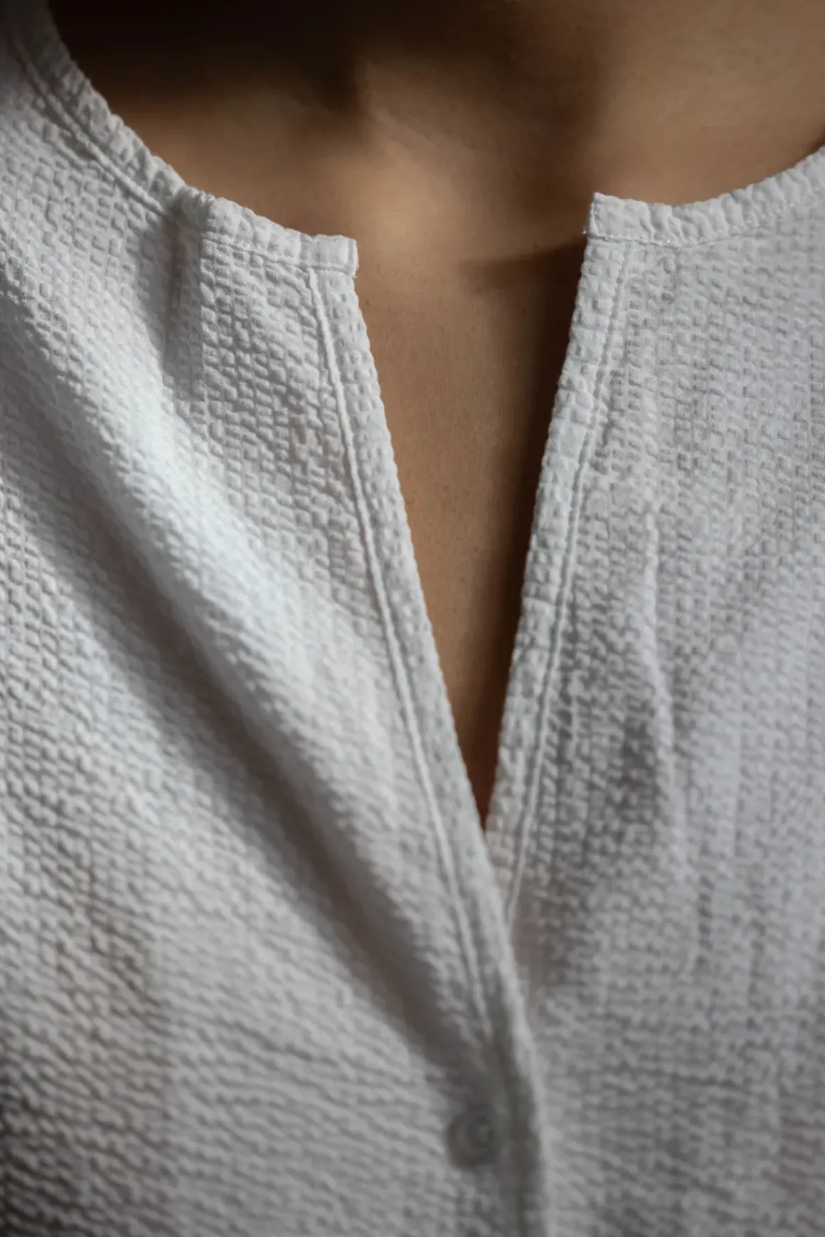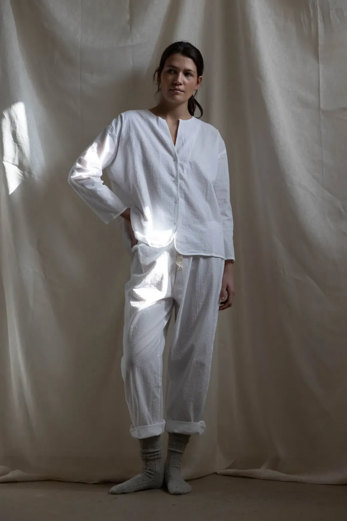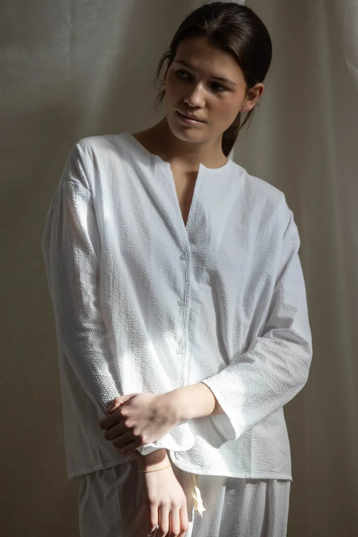 Aiayu Pyjamas – Seersucker White er en tidløs og behagelig pyjamas laget av lett, strukturert økologisk bomull i seersucker-veving. Stoffet gir en luftig følelse og et avslappet uttrykk, perfekt for både nattesøvn og late morgener hjemme. Skjorten har en klassisk krage, knappestolpe og brystlomme, mens buksene har en komfortabel strikk i livet og en løs passform for optimal bevegelsesfrihet.