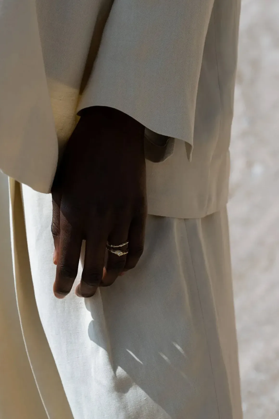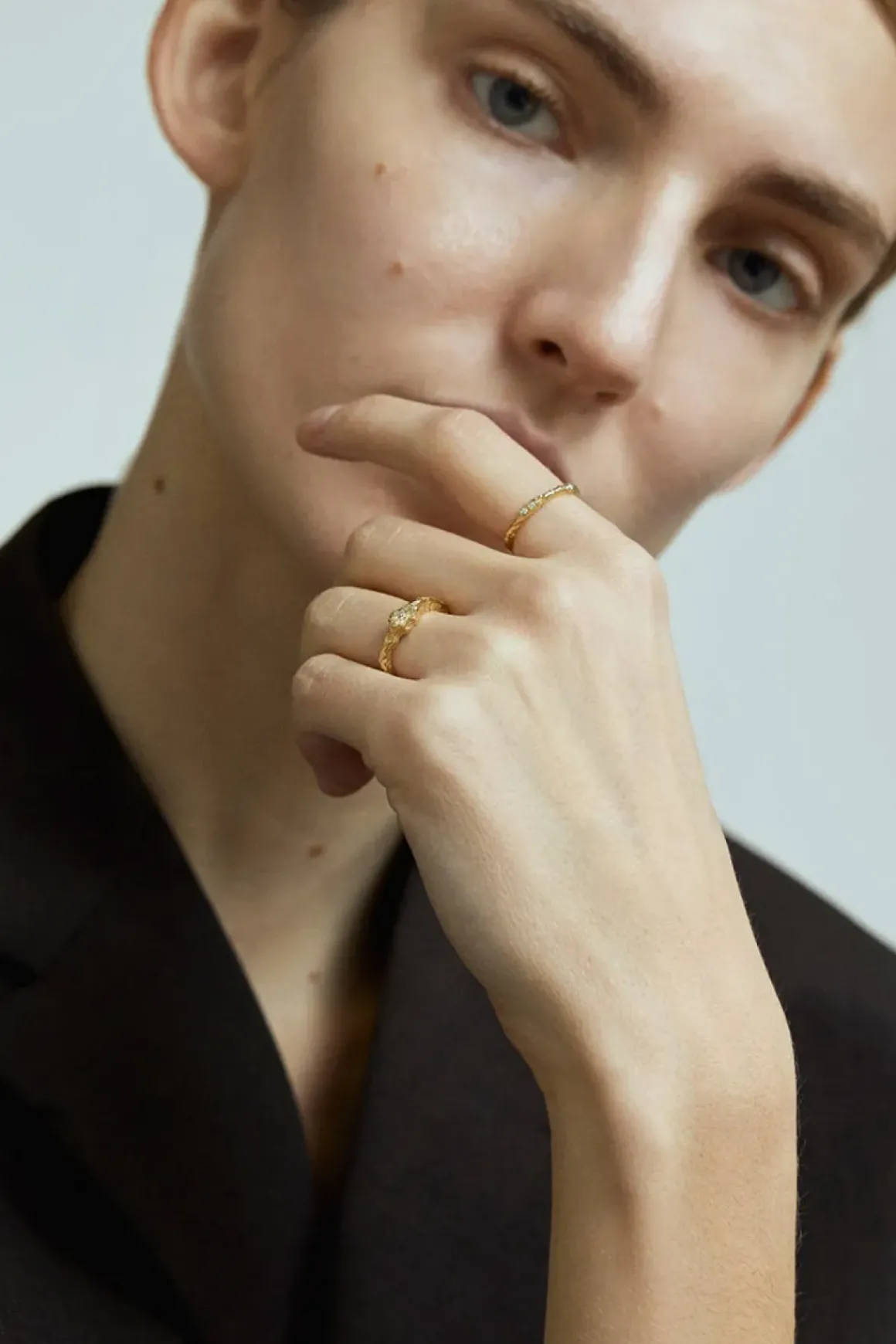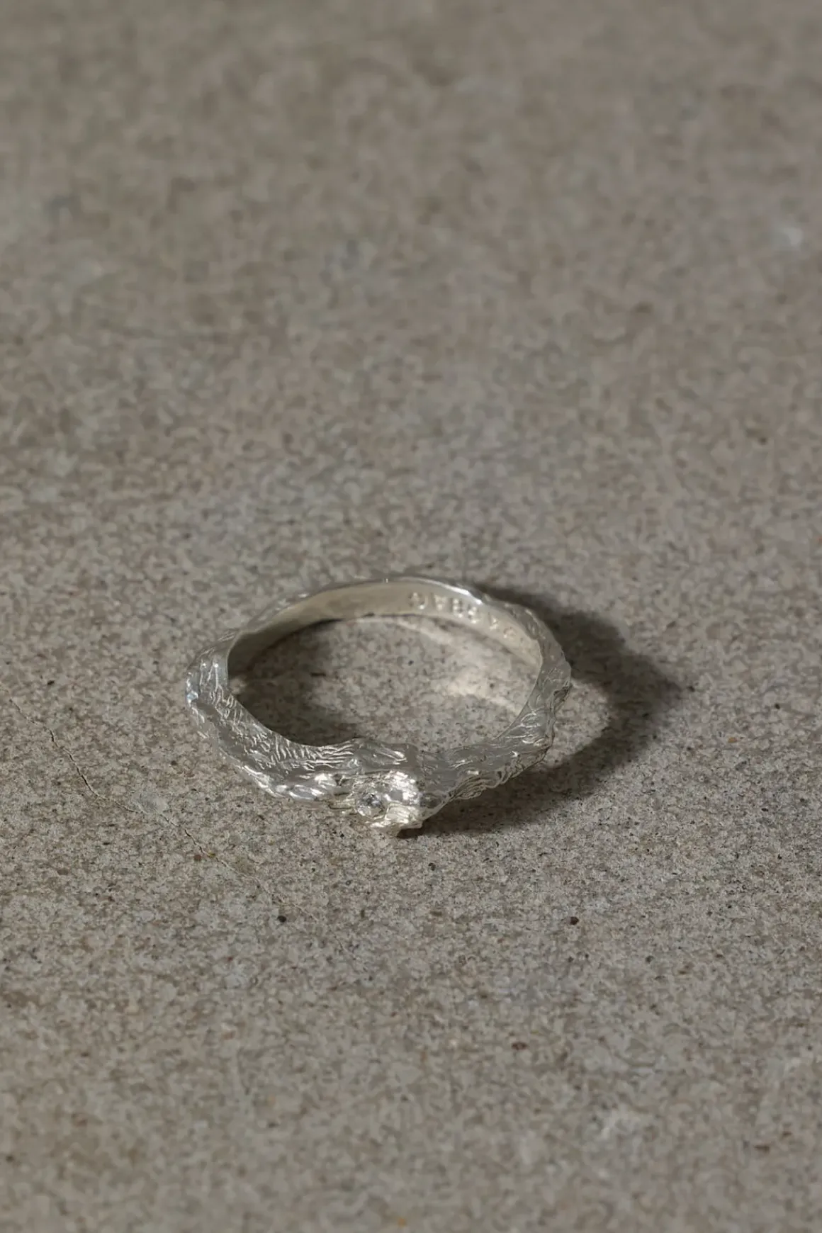 Shoreline ring fra Ragbag. Shoreline-ringen har organiske, uregelmessige konturer som gir et unikt uttrykk, sammen med en flush-satt, krystallhvit cubic zirconia-stein. Den balanserer et feminint preg med et rått og naturlig design, perfekt for deg som ønsker et smykke med karakter og personlighet. RAGBAG Studio kombinerer tradisjonelt håndverk og moderne inspirasjon for å skape smykker som dette, med en tidløs, men særegen følelse.