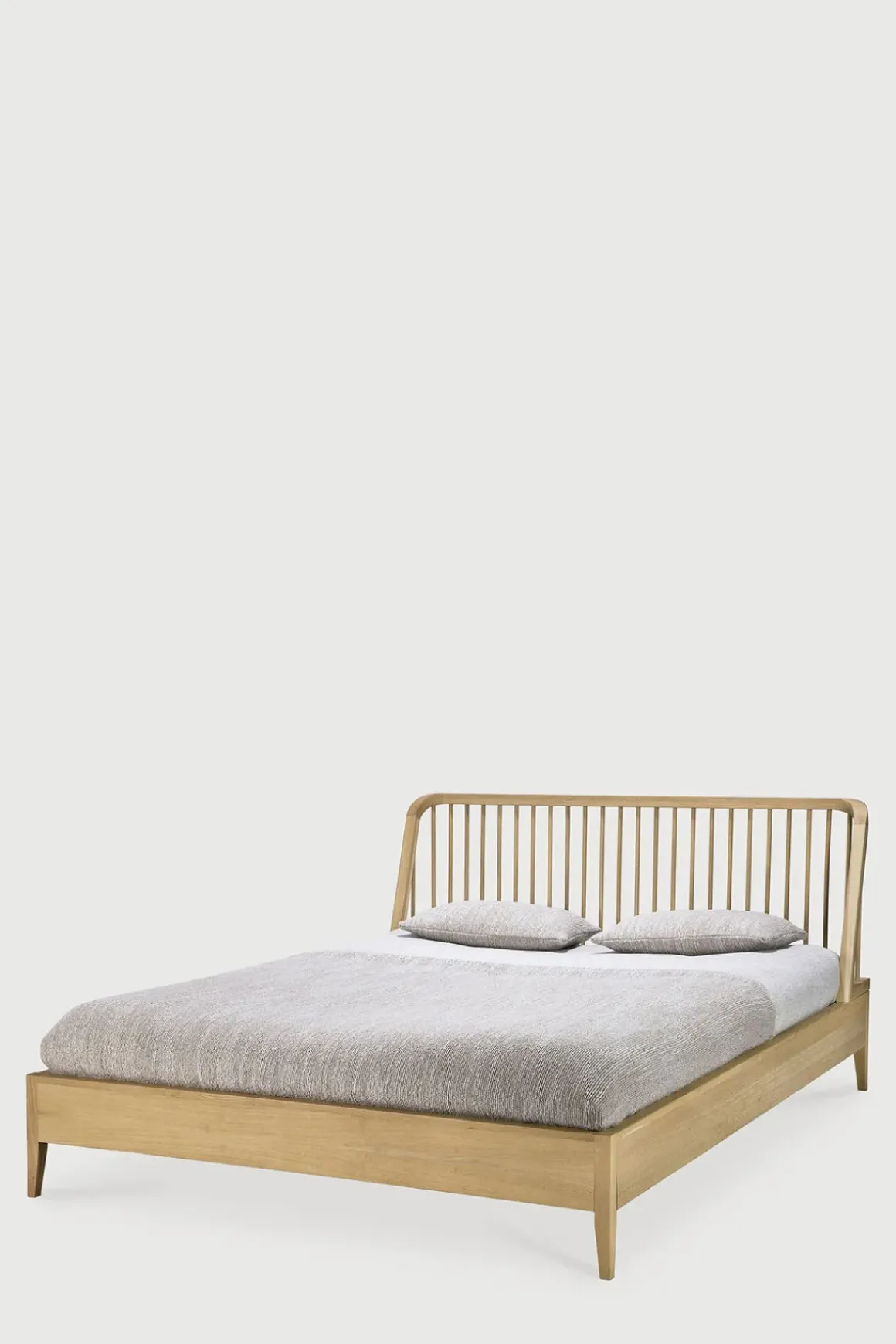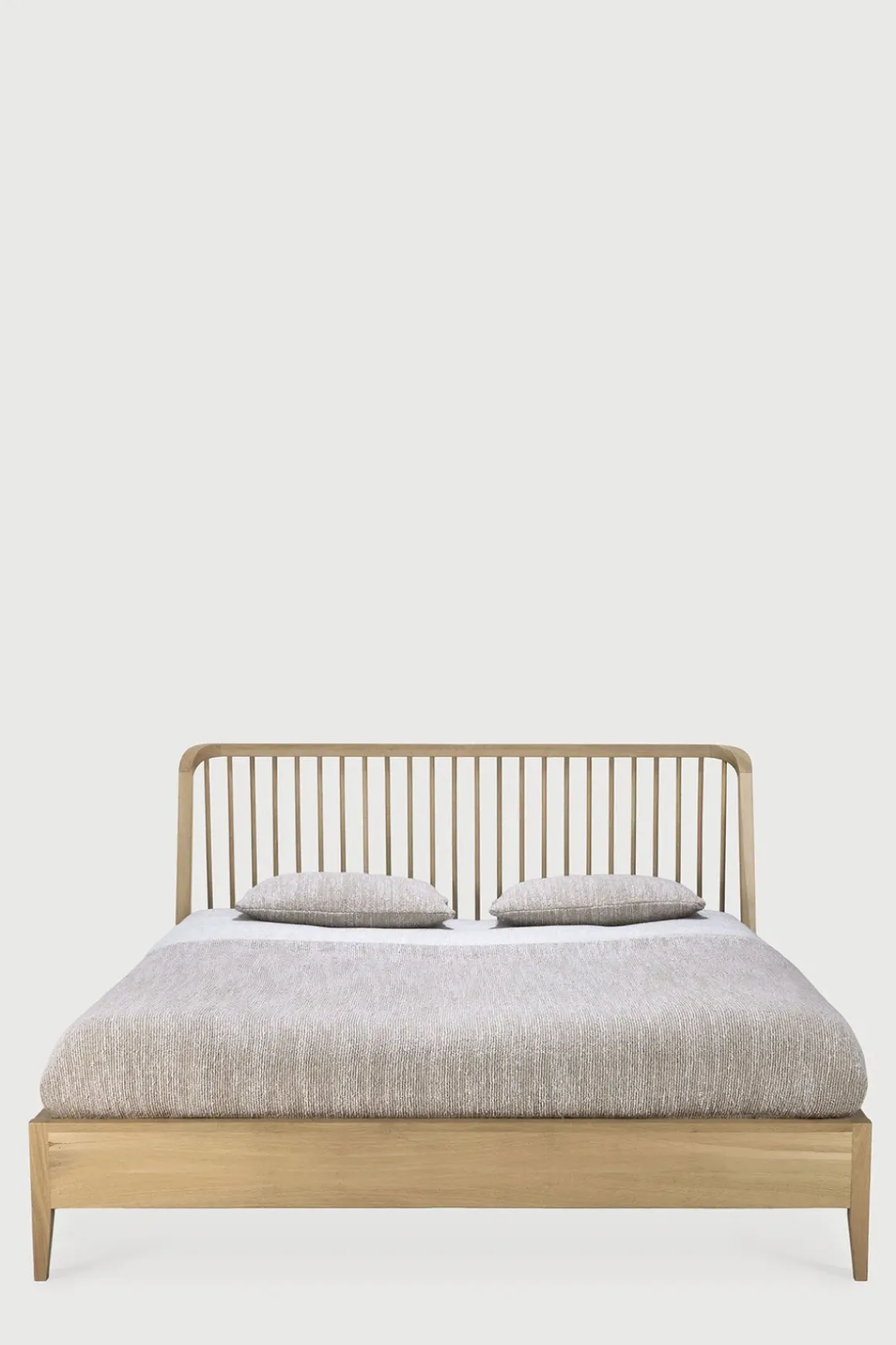 Spindle dobbeltseng fra belgiske Ethnicraft. Spindle-kolleksjonen er inspirert av tradisjonelle spinnehjul, med perfekt justerte eiker i sengegavlen. Lett avsmalnende ben og avrundede kanter gir en myk, sensuell kvalitet til denne vakre soveromskolleksjonen. Spindle er laget i solid, oljet eik og er et stødig møbel som tåler tidens tann. En klassisk, men slående seng uansett om du velger å ha den hjemme eller på hytta. Sengen passer med standard madrass i størrelse 160×200 cm. Sengen kan også bestilles i sort eik og i andre størrelser.