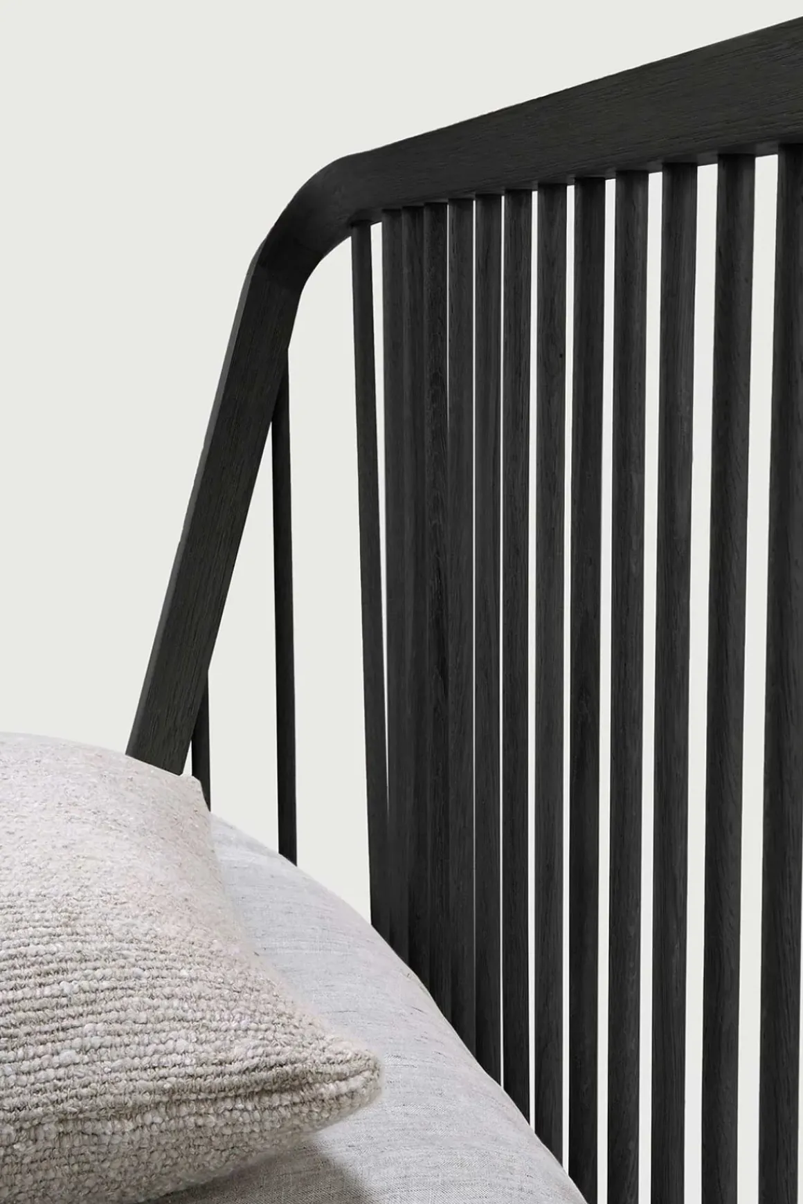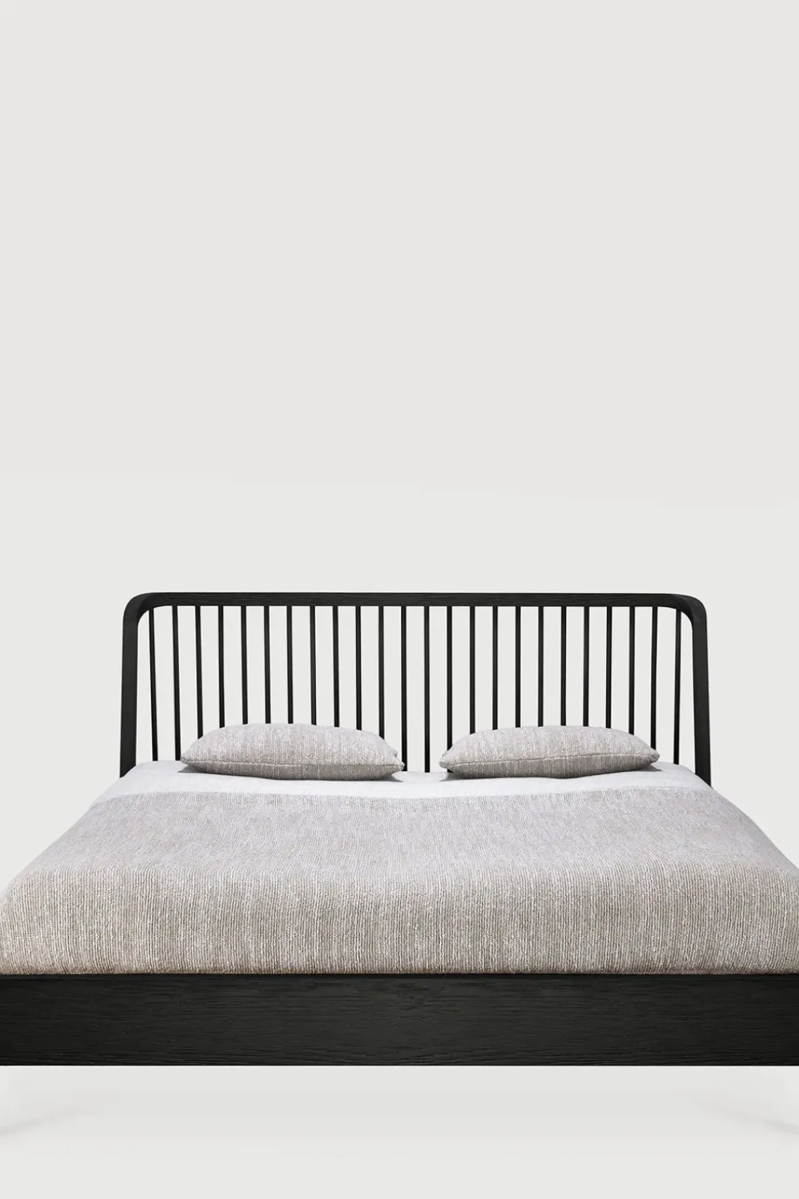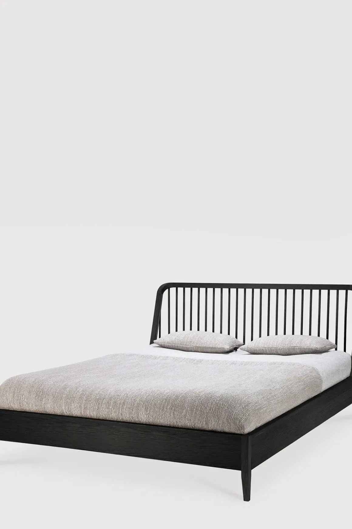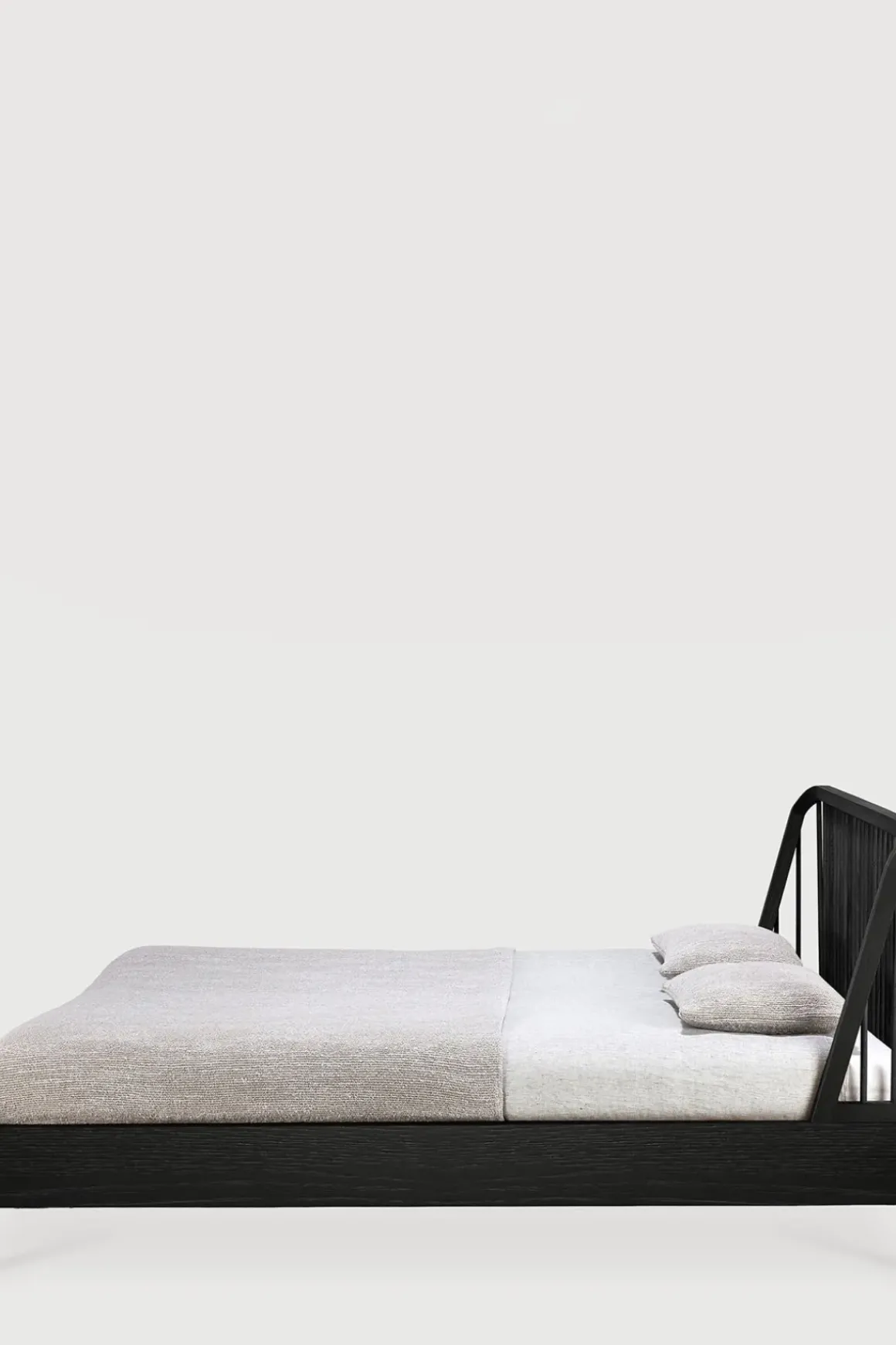 Spindle dobbeltseng fra belgiske Ethnicraft. Spindle-kolleksjonen er inspirert av tradisjonelle spinnehjul, med perfekt justerte eiker i sengegavlen. Lett avsmalnende ben og avrundede kanter gir en myk, sensuell kvalitet til denne vakre soveromskolleksjonen. Spindle er laget i solid, sortlakkert eik og er et stødig møbel som tåler tidens tann. En klassisk, men slående seng uansett om du velger å ha den hjemme eller på hytta. Sengen passer med standard madrass i størrelse 180×200 cm. Sengen kan også bestilles i oljet eik, gjenvunnet teak og i mindre størrelse (160x200cm).