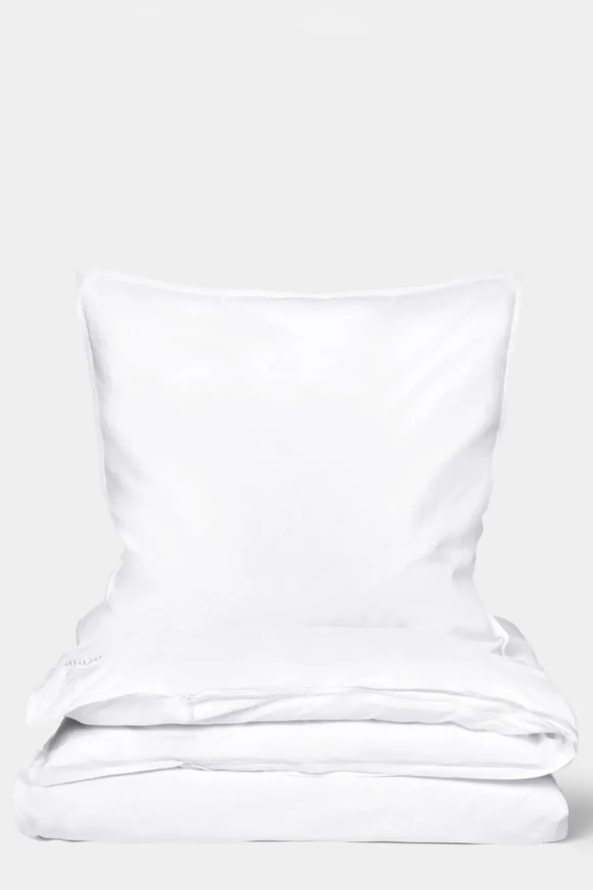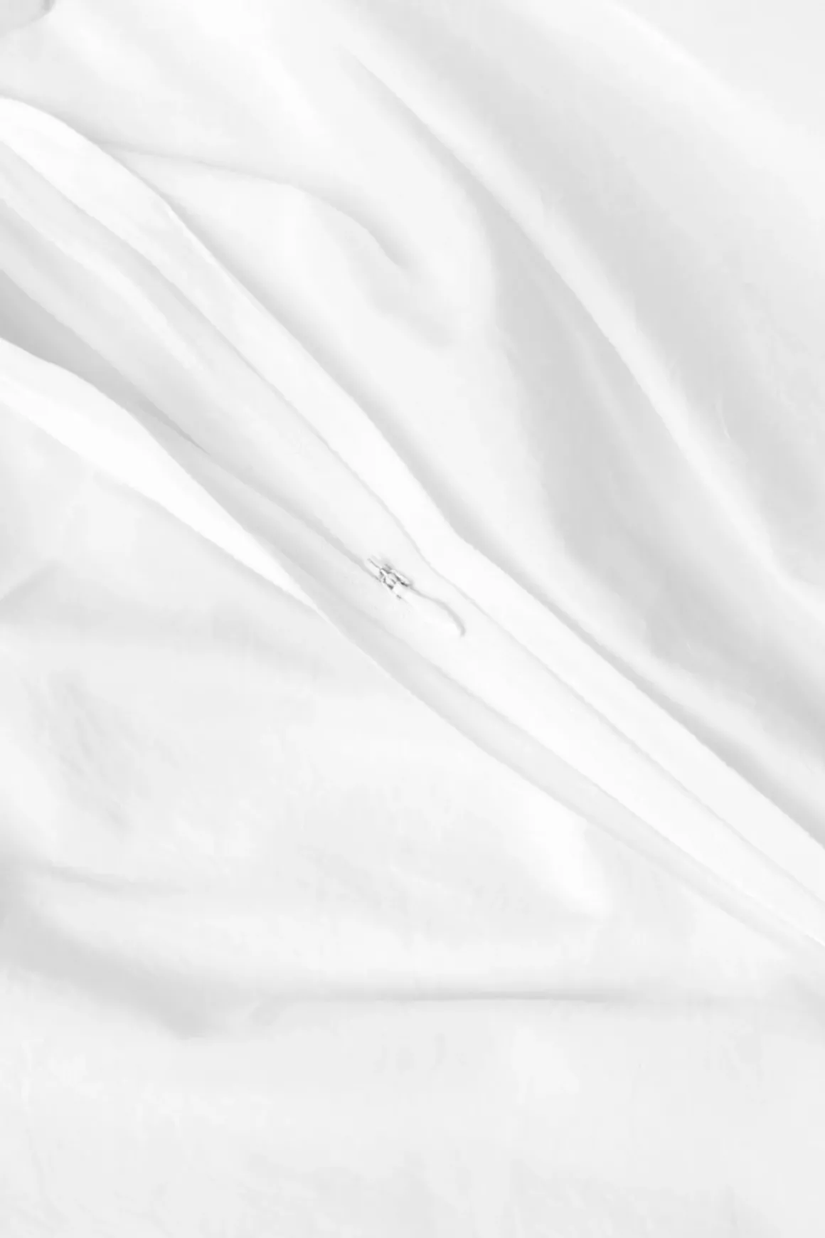 Sengesett i klassisk hvit fra Aiayu Domus. Laget av økologisk bomullspoplin for en myk og luksuriøs følelse. Settet inkluderer et enkelt dynetrekk i enten 200cm lengde eller 220cm lengde, og ett putetrekk (50x70cm). Sengetøyet har et avslappet, rynket utseende med sydd kant og enkel glidelås. Det lette og pustende materialet er perfekt for små øyeblikk av hverdagsluksus. Kommer pakket i en bomullspose ideell for oppbevaring og gjenbruk til andre formål.