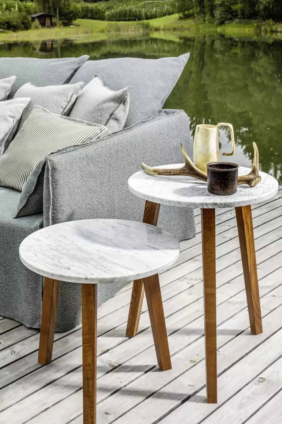 Sidebord Inout 742 fra italienske Gervasoni, designet av Paola Navone. Inout-kolleksjonen er en bred og variert samling av stoler, krakker, lenestoler, sofaer, bord og tilbehør som skildrer de utallige måtene Gervasoni forestiller seg å tilbringe tid utendørs. Sidebordet er klassisk med tre ben i oljet iroko som støtter en slank, rund bordplate i hvit, eksklusiv Carrara-marmor. Iroko er et spesielt slitesterkt tre fordi den er naturlig motstandsdyktig mot vann og fuktighet, og egner seg derfor spesielt bra til utemøbler. Sidebordet er tilgjengelig i to størrelser og er perfekte til kaffe-eller avlastningsbord ute på terrassen. Kombiner med andre møbler fra Inout-serien for å komplettere looken og få den luksuriøse resort-følelsen hjemme.