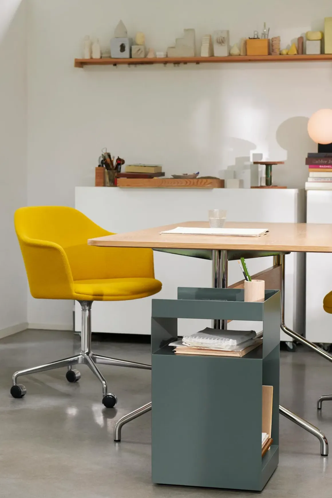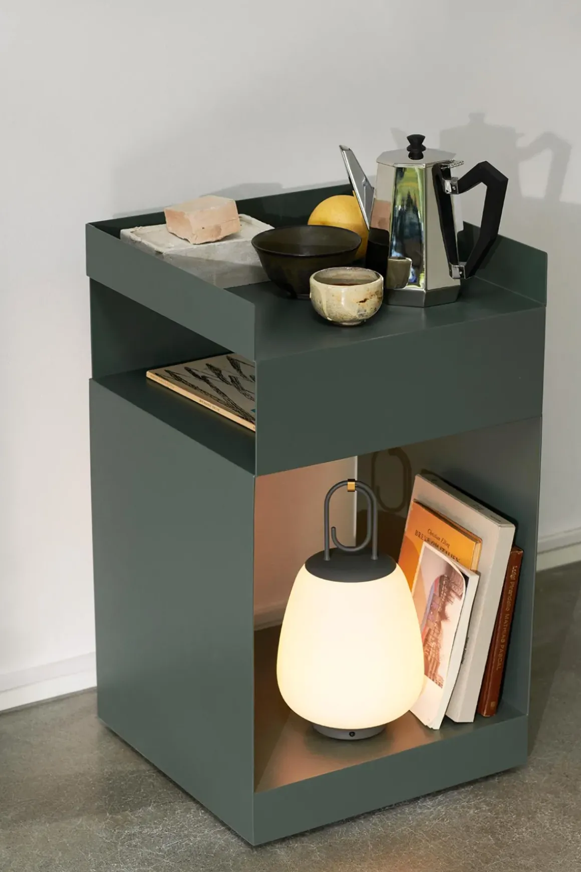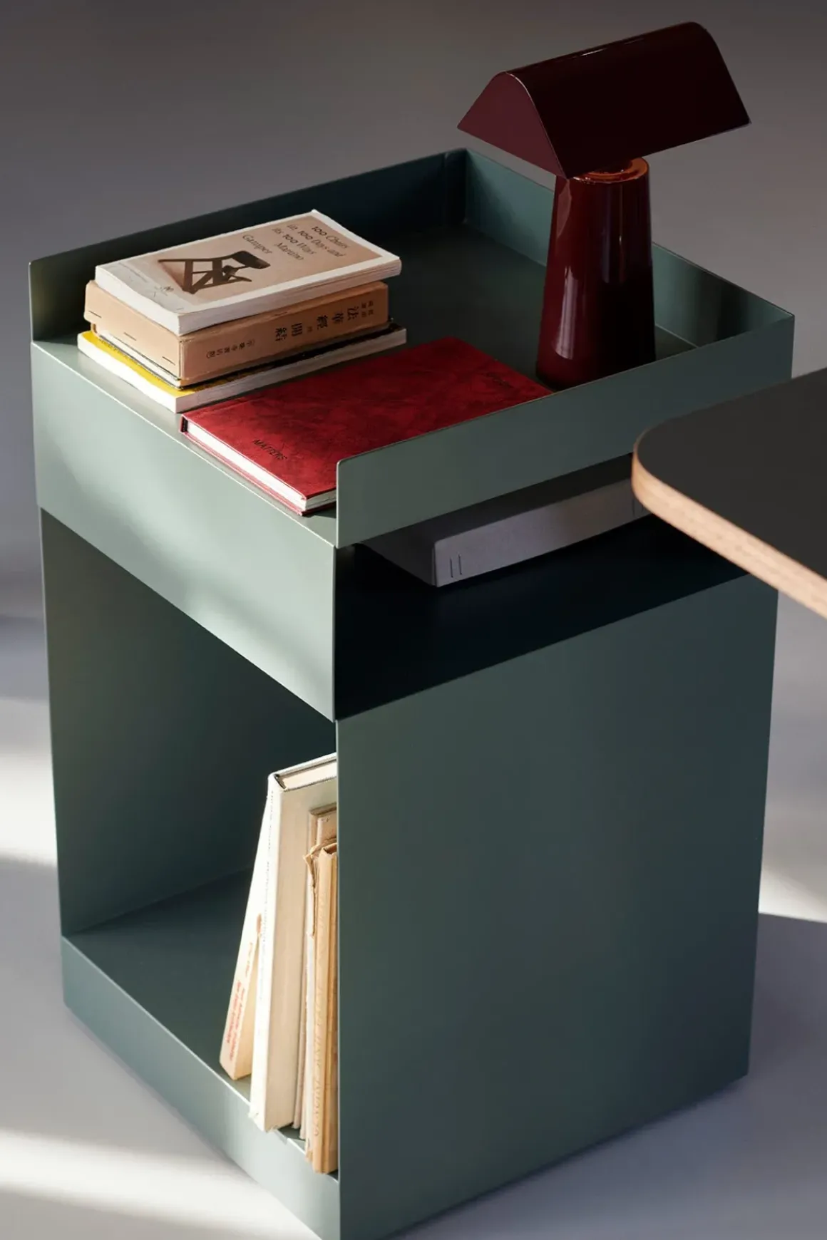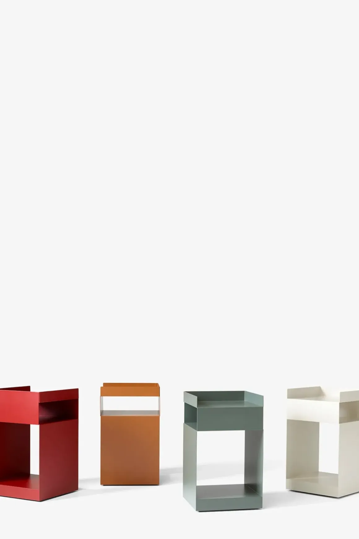 Rotate sidebord fra u0026amp;Tradition, designet av anerkjente Space Copenhagen. Rotates upretensiøse utseende motsier dets svært funksjonelle design. Laget for å oppfylle en rekke formål – bruk den på hjemmekontoret, som nattbord eller til oppbevaring på badet. Rotate kan brukes i alle rom og hjulene gjør bordet enkelt å flytte rundt der det trengs. Sidebordet er laget av stål, av ett stykke metallplate, som kuttes i to og bøyes etterpå. Til slutt sveises de to delene sammen og pulverlakkeres. Rotate kommer i fargene Terracotta, Hunter, Ivory og Merlot.