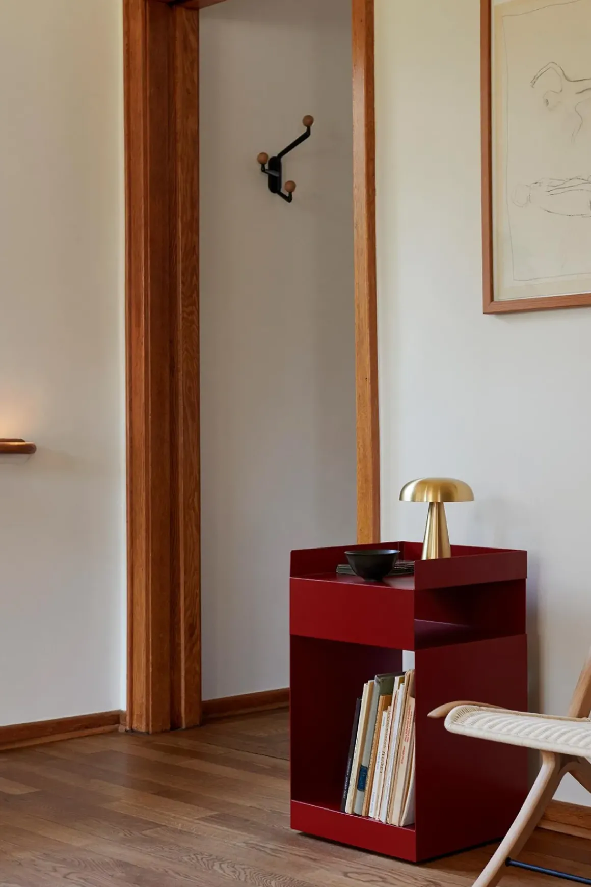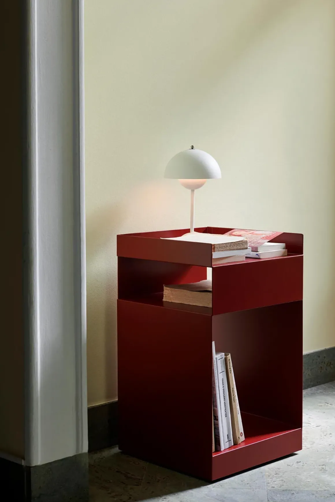 Rotate sidebord fra u0026amp;Tradition, designet av anerkjente Space Copenhagen. Rotates upretensiøse utseende motsier dets svært funksjonelle design. Laget for å oppfylle en rekke formål – bruk den på hjemmekontoret, som nattbord eller til oppbevaring på badet. Rotate kan brukes i alle rom og hjulene gjør bordet enkelt å flytte rundt der det trengs. Sidebordet er laget av stål, av ett stykke metallplate, som kuttes i to og bøyes etterpå. Til slutt sveises de to delene sammen og pulverlakkeres. Rotate kommer i fargene Terracotta, Hunter, Ivory og Merlot.