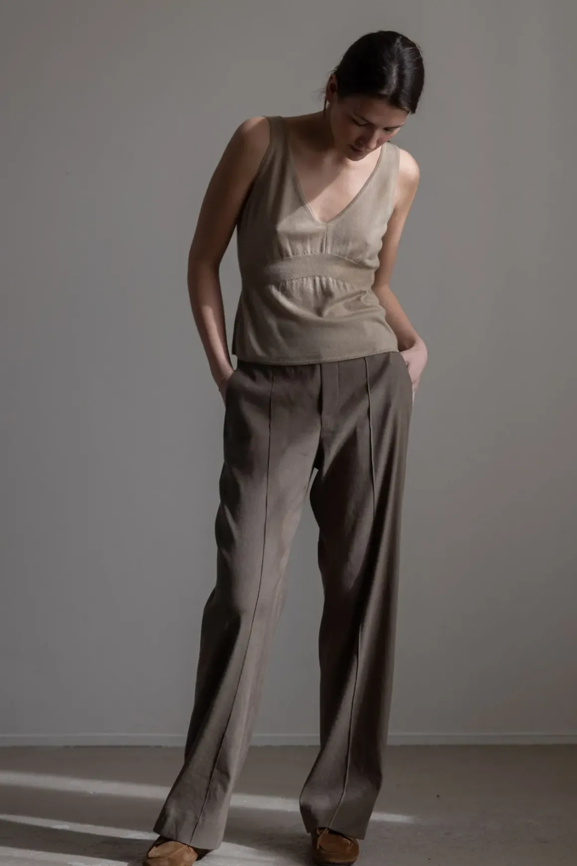 Strikket singlett fra Vince i en lett og finstrikket ullblanding med kashmir, perfekt for varmere dager. Den dype V-utringningen foran og bak gir et åpent og sommerlig uttrykk, mens en ribbestrikket kant under bysten gir en lett drapert form og markerer midjen på en diskré måte. Et mykt og pustende plagg som fungerer like godt alene som under en cardigan.