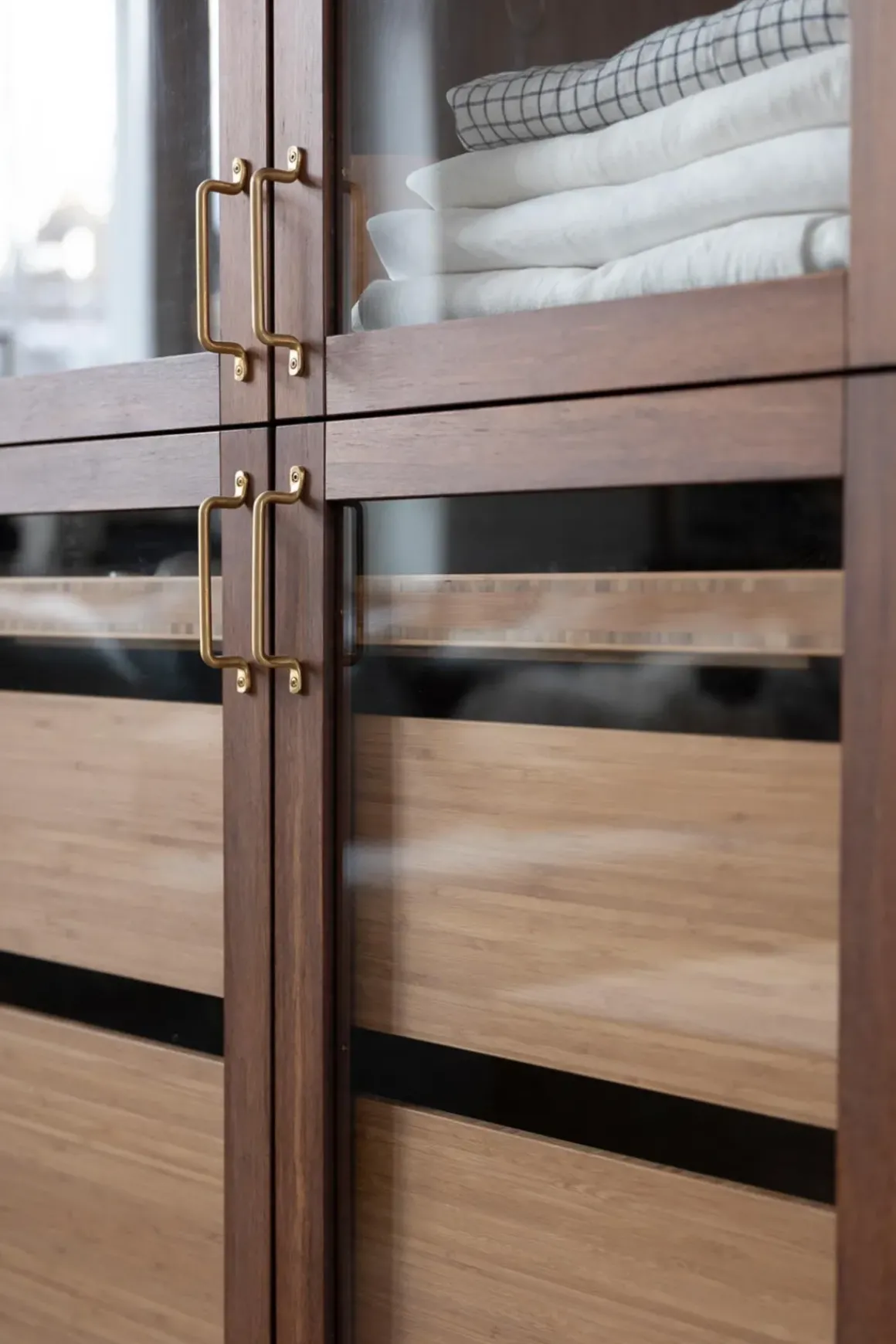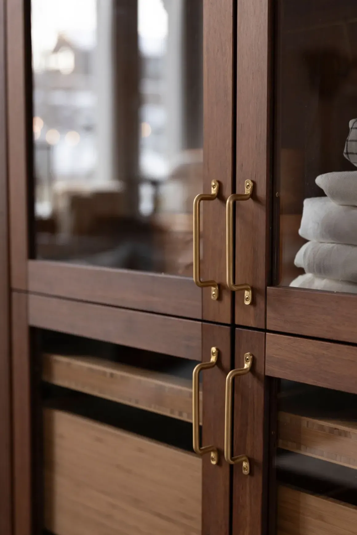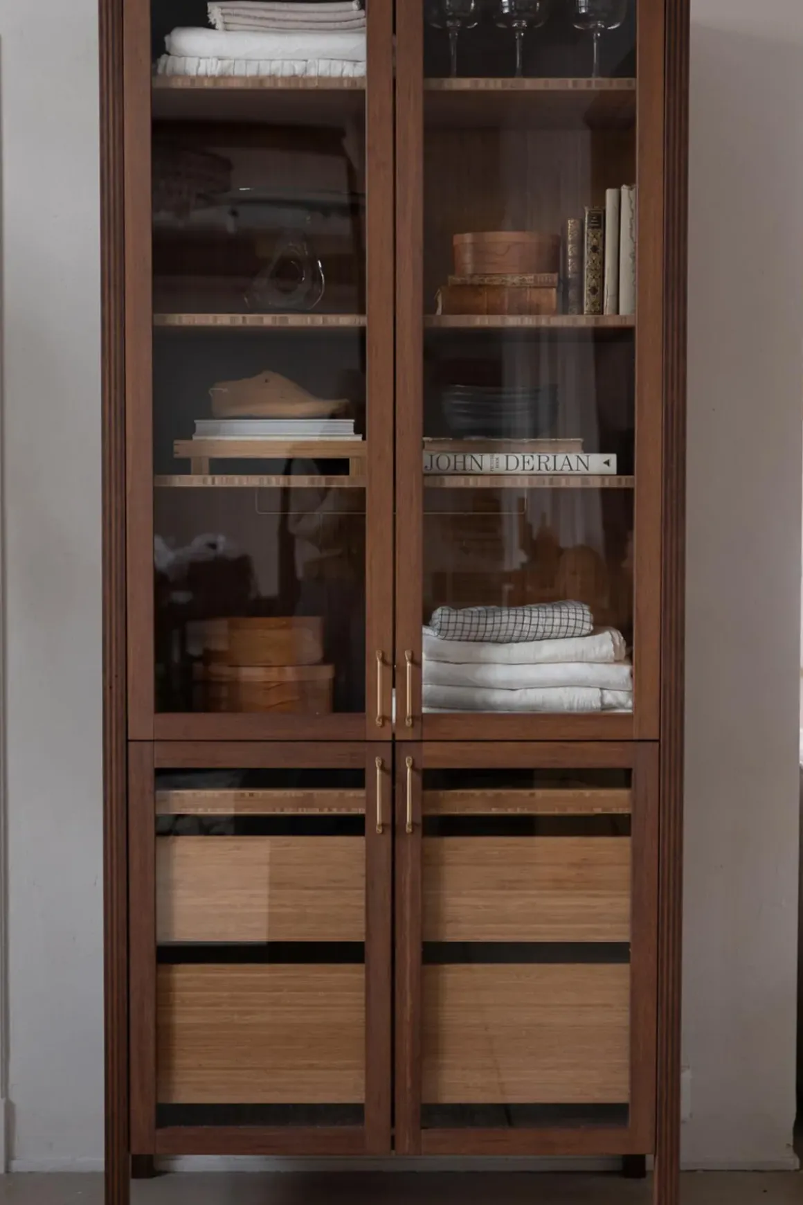Vitrineskap i bambus fra norske Ask og Eng, laget i eksklusivt samarbeid med Bolina. Det skreddersydde, håndlagde skapet i solid, brun bambus har dører i glass og håndtak og detaljer i varm messing som harmonerer perfekt. Her er ingenting overlatt til tilfeldighetene og hver detalj er nøye gjennomtenkt. Skapet kan brukes som et frittstående møbel der du trenger det i huset eller du kan innlemme det som en del av kjøkkenet eller spisestuen for eksempel. Vis fram utvalgte skatter, serviser, vaser, objekter eller tekstiler og bruk skuffene til oppbevaring av andre ting som ikke trenger å synes. Skapet er designet og håndlaget på Ask og Eng・Workshop i Drammen. Skapet kan bestilles i et større utvalg farger/finisher og hardware og detaljer i ulike metaller- kom innom butikken for å se skapet live og snakk med oss så hjelper vi deg å finne den perfekte match til ditt hjem.