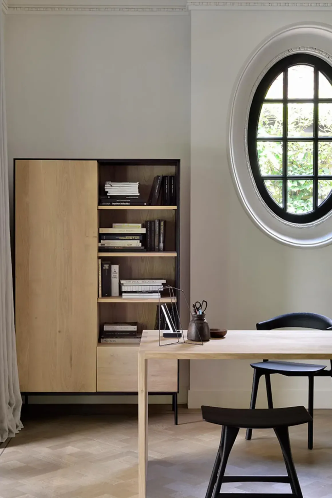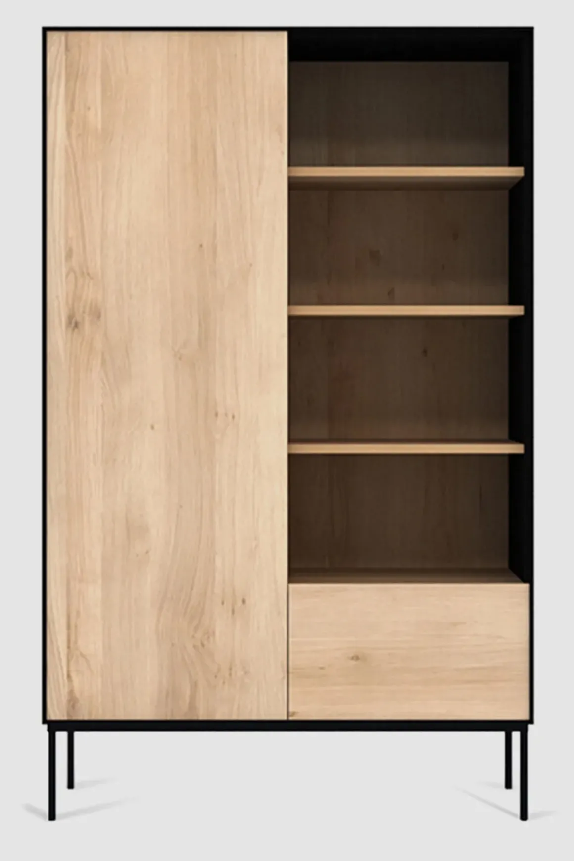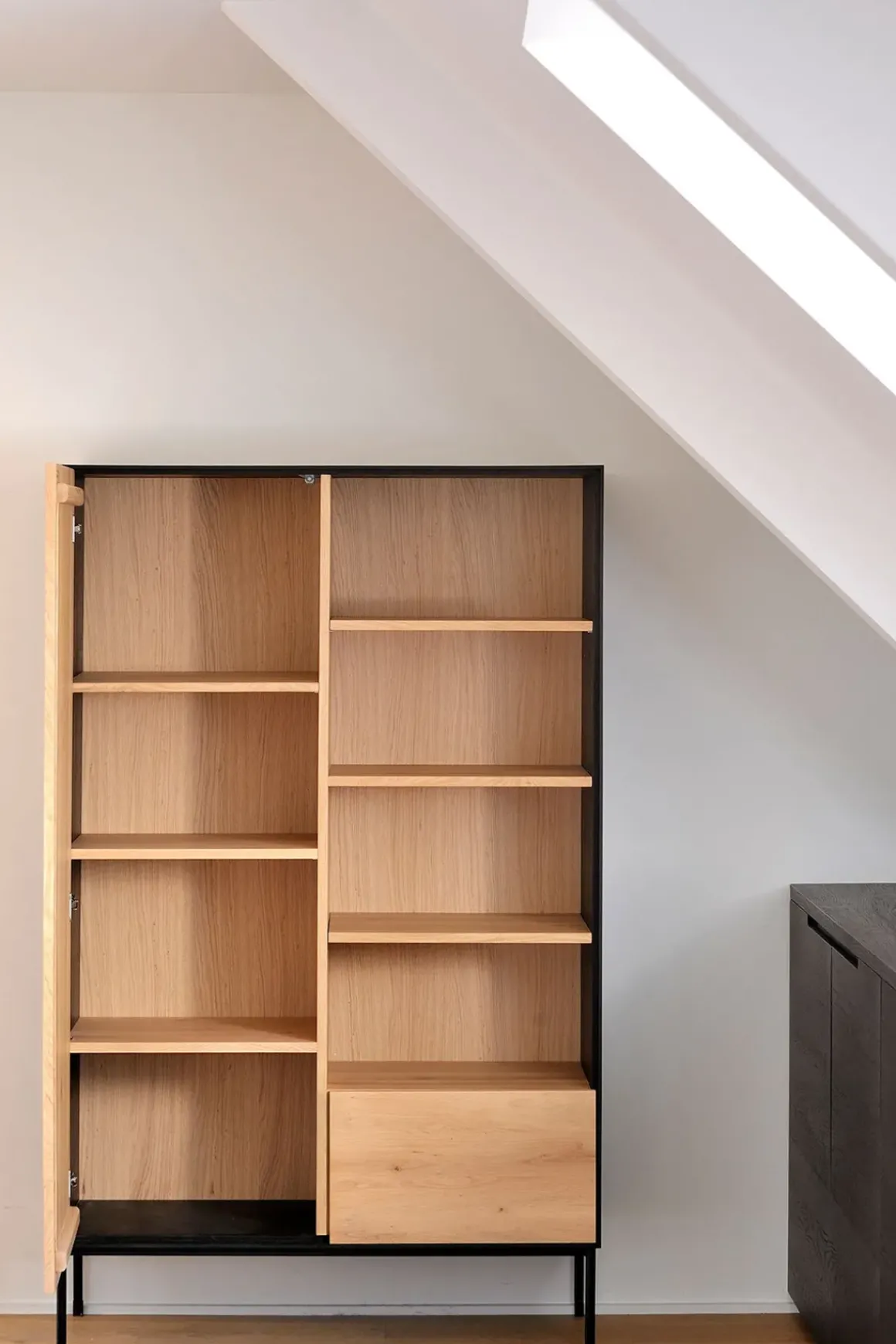 Blackbird skap i solid eik fra belgiske Ethnicraft, designet av Alain van Havre. Skapet har et tidløst design som kombinerer myke, runde ben med iøynefallende kraftige, grafiske linjer og et lyst og luftig uttrykk. De sorte detaljene og de pulverlakkerte bena, står i flott kontrast med det lyse treverket. Skapet er laget av høykvalitets europeisk eik, og Ethnicraft lar materialet komme til sin rett ved å la de naturlige variasjonene og teksturene i treet være synlige. Blackbird har én dør og én skuff, og til sammen 8 hyller til lagringsplass i tillegg til skuffen. Skapets kombinasjon av moderne design, sterke konstruksjon og varige holdbarhet gjør det til den ideelle oppbevaringsløsningen for alle hjem.