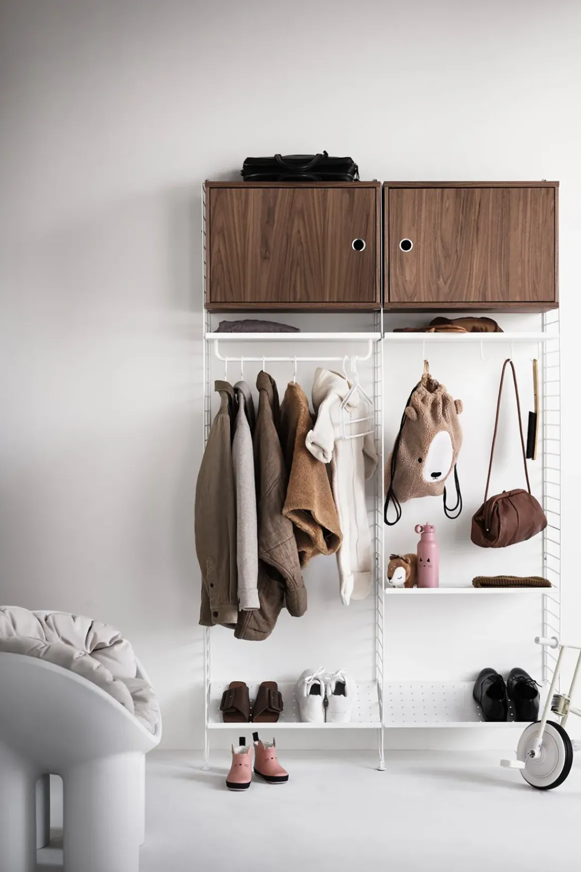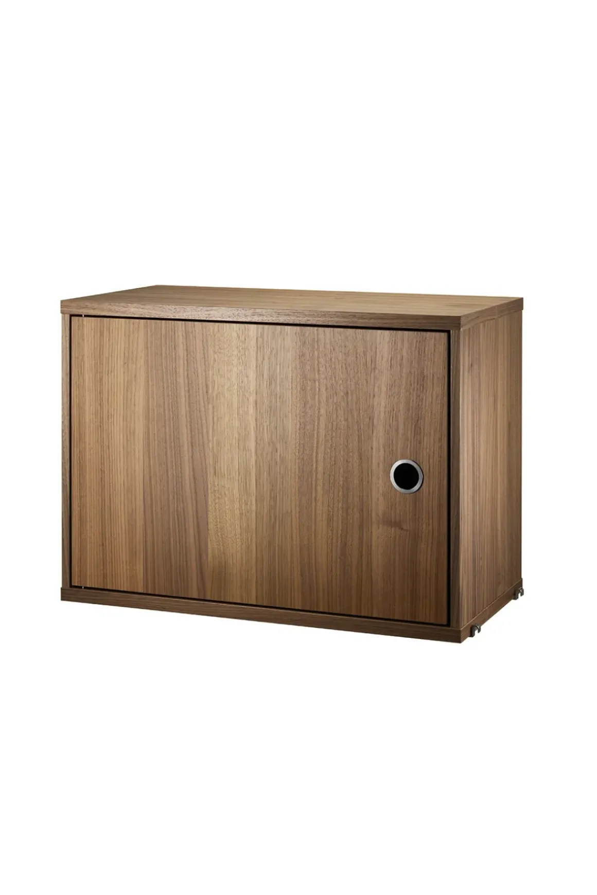 Dette skapet selges som en enkeltdel du praktisk kan kombinere i ditt String® System med gavler som er 30 cm dype. Tilgjengelige i én bredde, 58 cm. Visuelt er det fint å tilføre et større element til Stringhyllen din, som dette skapet, samtidig som det er praktisk med ekstra oppbevaring. Døren kan monteres på hver side av skapet. Den kommer med én justerbar indre hylle. Følger med opphengsbeslag.
