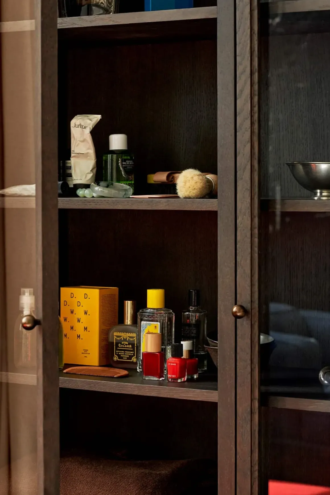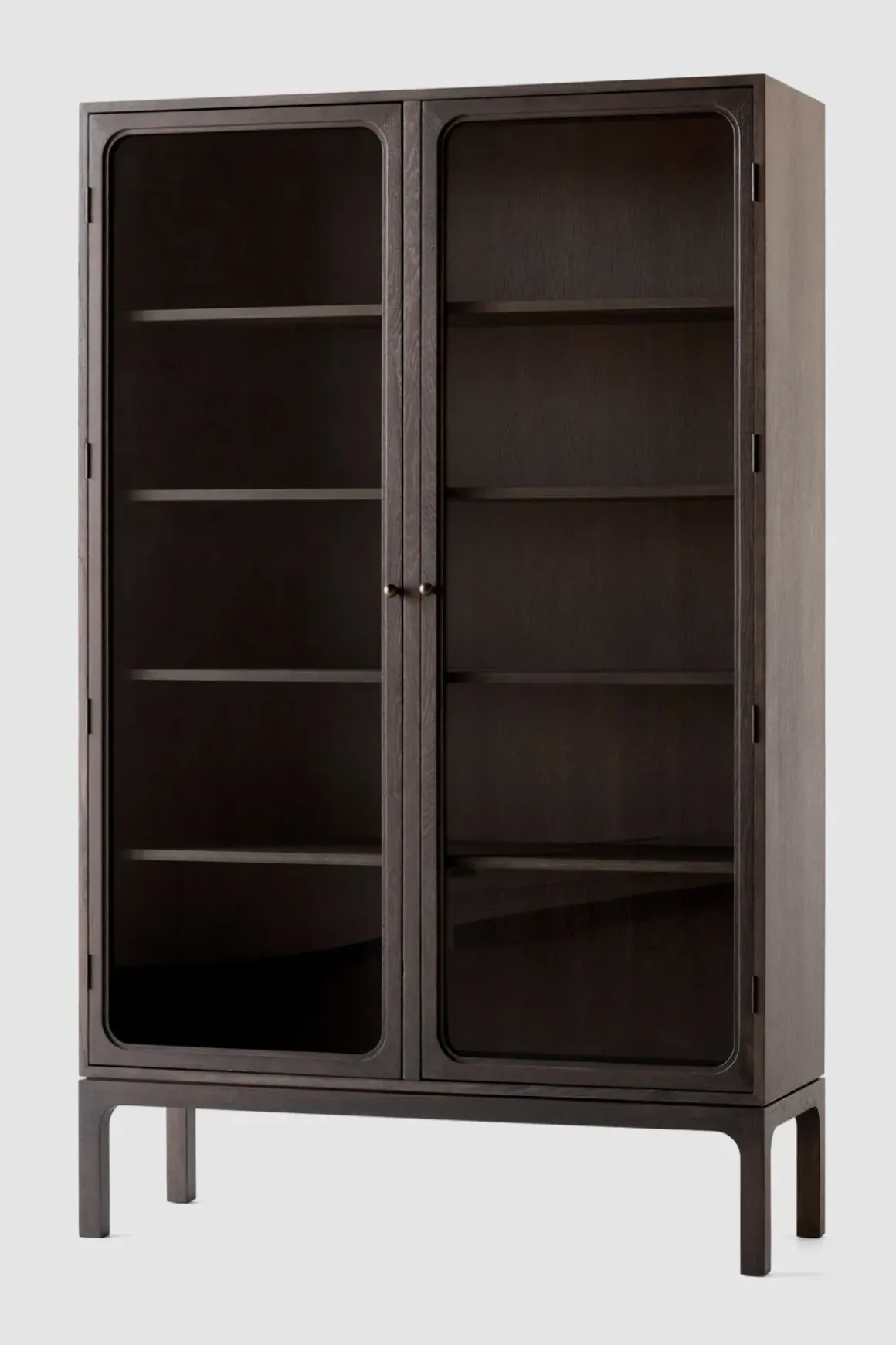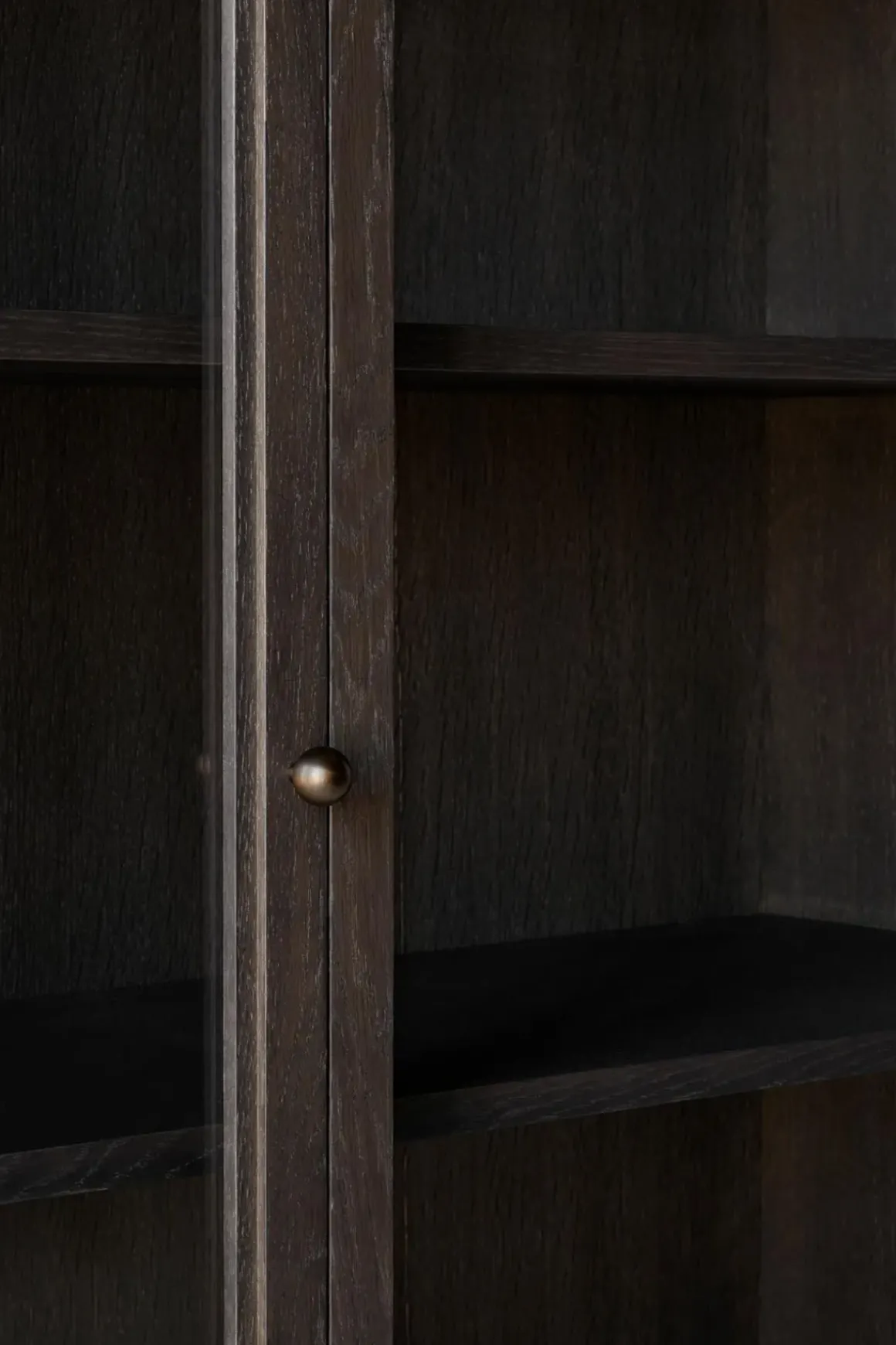 - Materiale: Mørkbeiset, massiv eik | Eikefiner | Glasspaneldører | Hengsler i bronsert messing | Knotter i bronsert stål