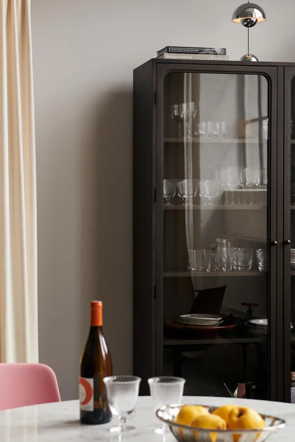 Trace Double er et vakkert, romslig vitrineskap som forener en moderne silhuett med et klassisk uttrykk, designet av Space Copenhagen for u0026amp;Tradition. Designstudioet valgte skapets navn for å gjenspeile konseptet med å samle små, sentimentale objekter fra livene våre – og sporene de etterlater seg. Skapet og hyllene er laget av MDF-plater, skåret til og dekket med eikefiner, deretter behandlet med mørkbeiset lakk. Dørene er laget av frest massiv eik og herdet glass. Trace passer sømløst inn i skandinaviske hjem, og er et tidløst utstillingsvindu til dine kjæreste eiendeler. Trace finnes også i en smalere variant og i naturlig eik.