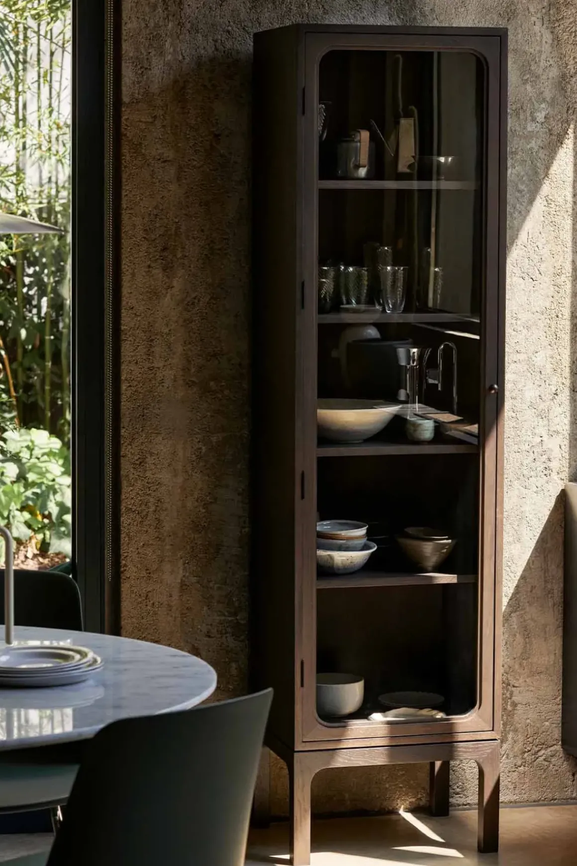 Trace Single er et vakkert vitrineskap som forener en moderne silhuett med et klassisk uttrykk, designet av Space Copenhagen for u0026amp;Tradition. Designstudioet valgte skapets navn for å gjenspeile konseptet med å samle små, sentimentale objekter fra livene våre – og sporene de etterlater seg. Skapet og hyllene er laget av MDF-plater, skåret til og dekket med eikefiner, deretter behandlet med mørkbeiset lakk. Dørene er laget av frest massiv eik og herdet glass. Trace passer sømløst inn i skandinaviske hjem, og er et tidløst utstillingsvindu til dine kjæreste eiendeler. Trace finnes også i en dobbel variant og i naturlig eik.