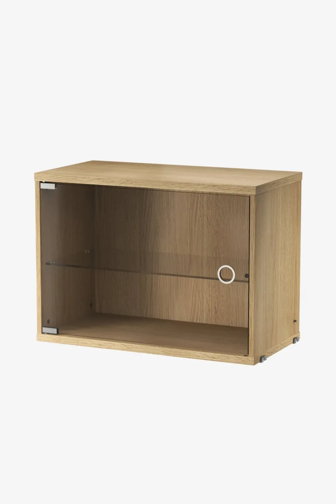 Vitrineskap fra String finnes i bredde 78/58 cm og dybde 30 cm. Den kommer med en avtagbar glasshylle slik at du kan få to seksjoner. Visuelt er det fint å bryte med et større element i hyllen din, som også gir deg mye ekstra oppbevaring og muligheten til å vise frem noe skjørt. Passer med alle gavler som er 30 cm dype. Selges pr. stk.