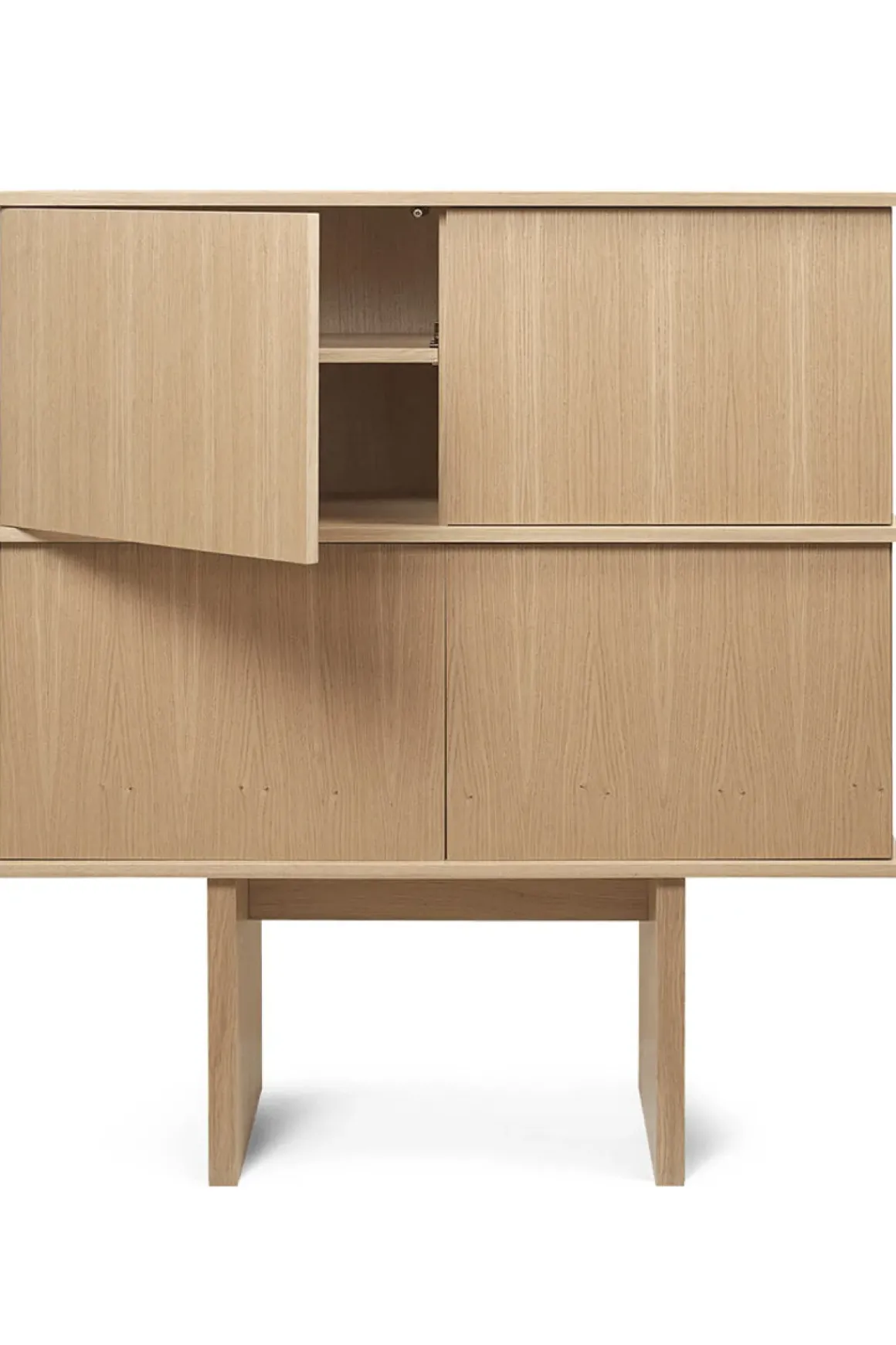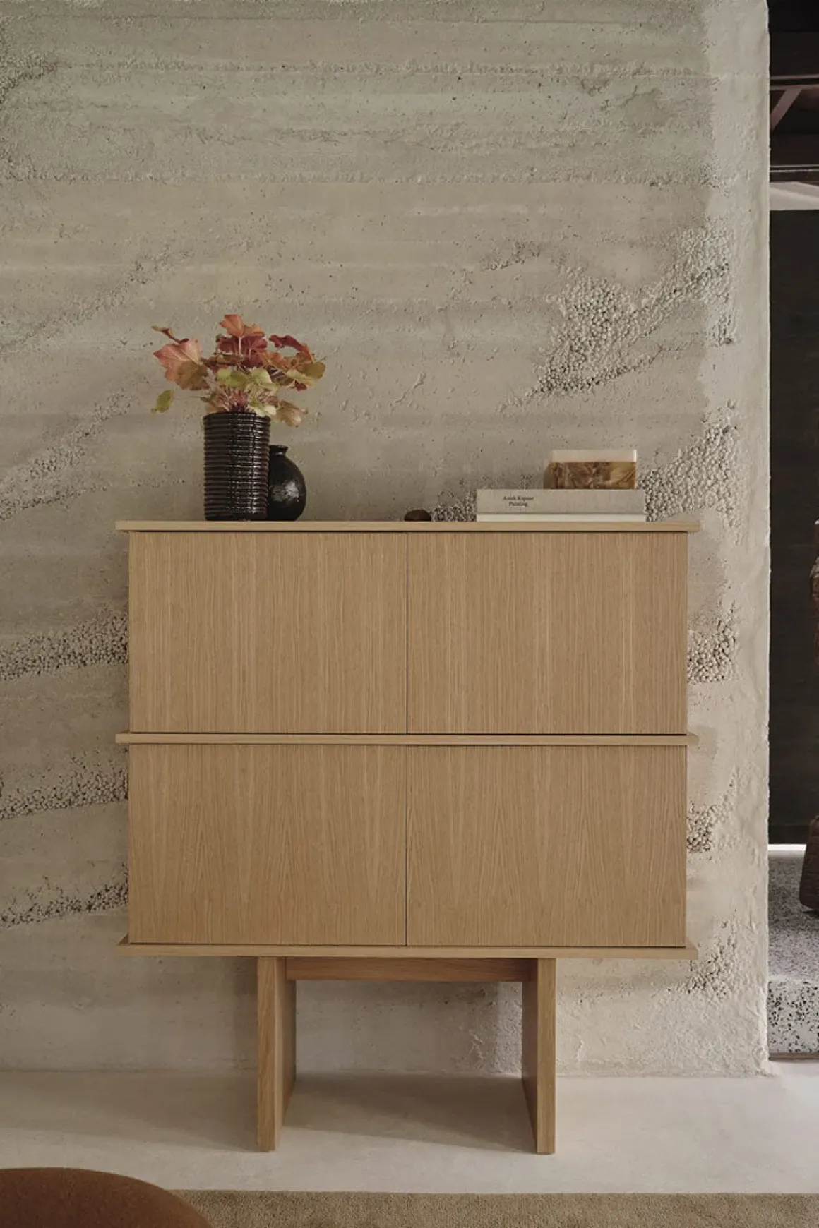 Stilt skjenk fra Ferm Living. Laget av eikefiner, tilfører Stilt Skjenk en luftig og sofistikert tilstedeværelse i rommet. Inspirert av arkitektoniske søyler, står skjenken på høye, elegante ben som gir den et lett og distinkt uttrykk. Dette designet gir både høyde og visuell interesse, noe som gjør skjenken til et blikkfang i hjemmet. Perfekt for ganger eller mindre rom, tilbyr Stilt god oppbevaringsplass samtidig som den beholder et kompakt og rent design. Merk: Stilt må festes sikkert til veggen med den medfølgende veggbraketten.
