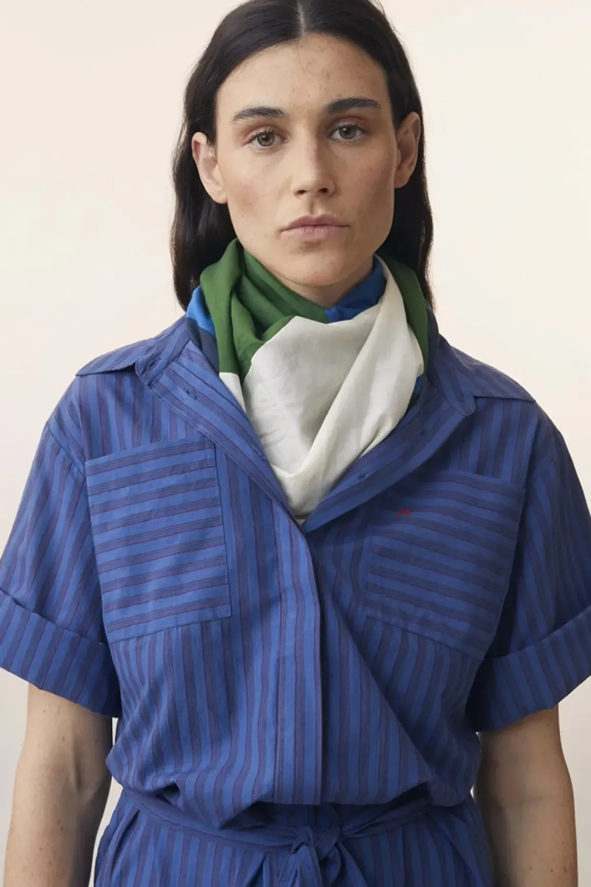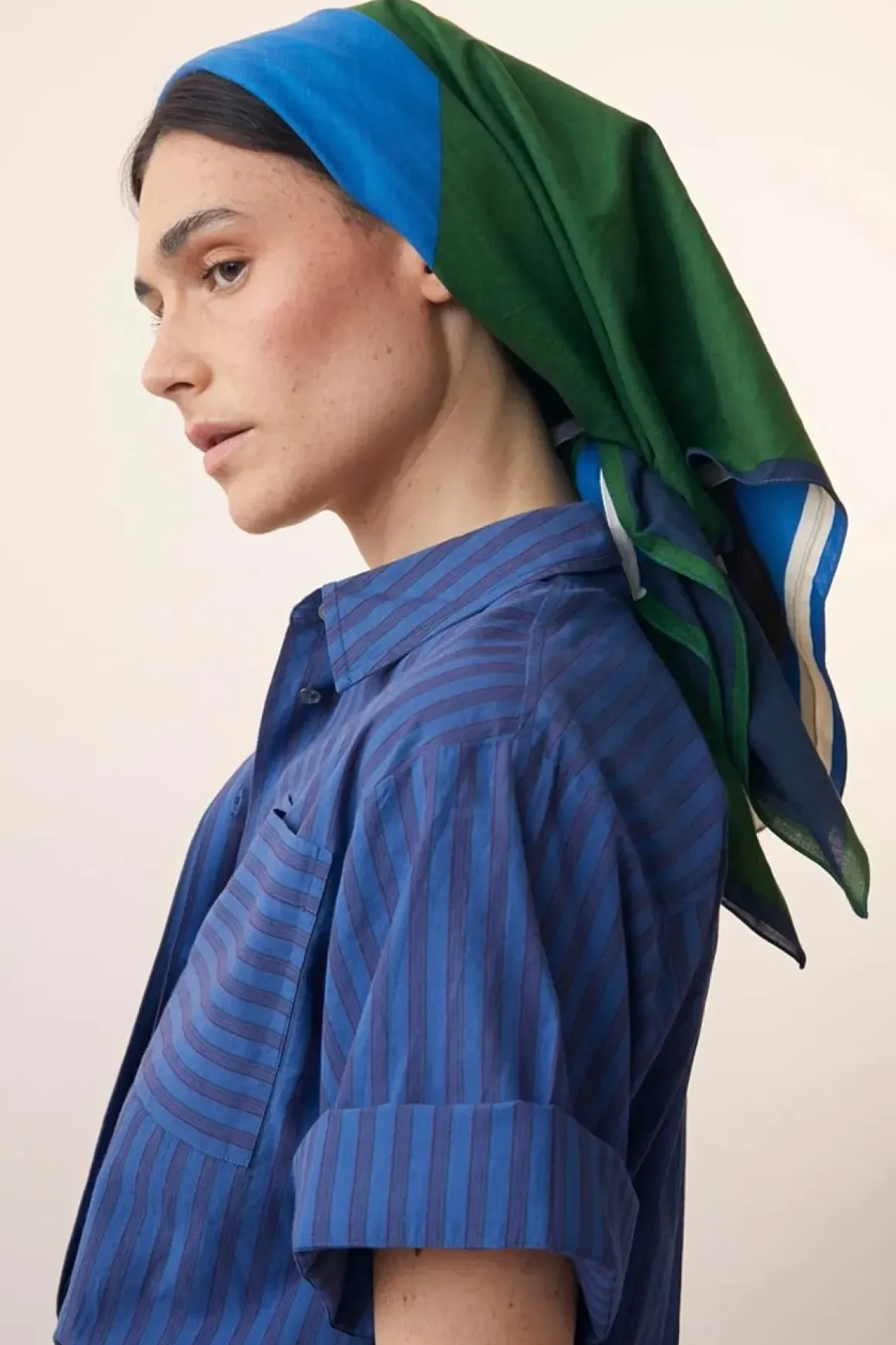 Skjerf N°717 i fargen Bottle Green er laget av lett og myk bomull som føles behagelig mot huden. Det har et grafisk rutemønster i balanserte fargetoner som gir et moderne uttrykk. Den luftige kvaliteten gjør skjerfet allsidig – bruk det rundt halsen, i håret eller som et lett sjal. De rullede kantene gir en fin avslutning og understreker det håndverksmessige preget.