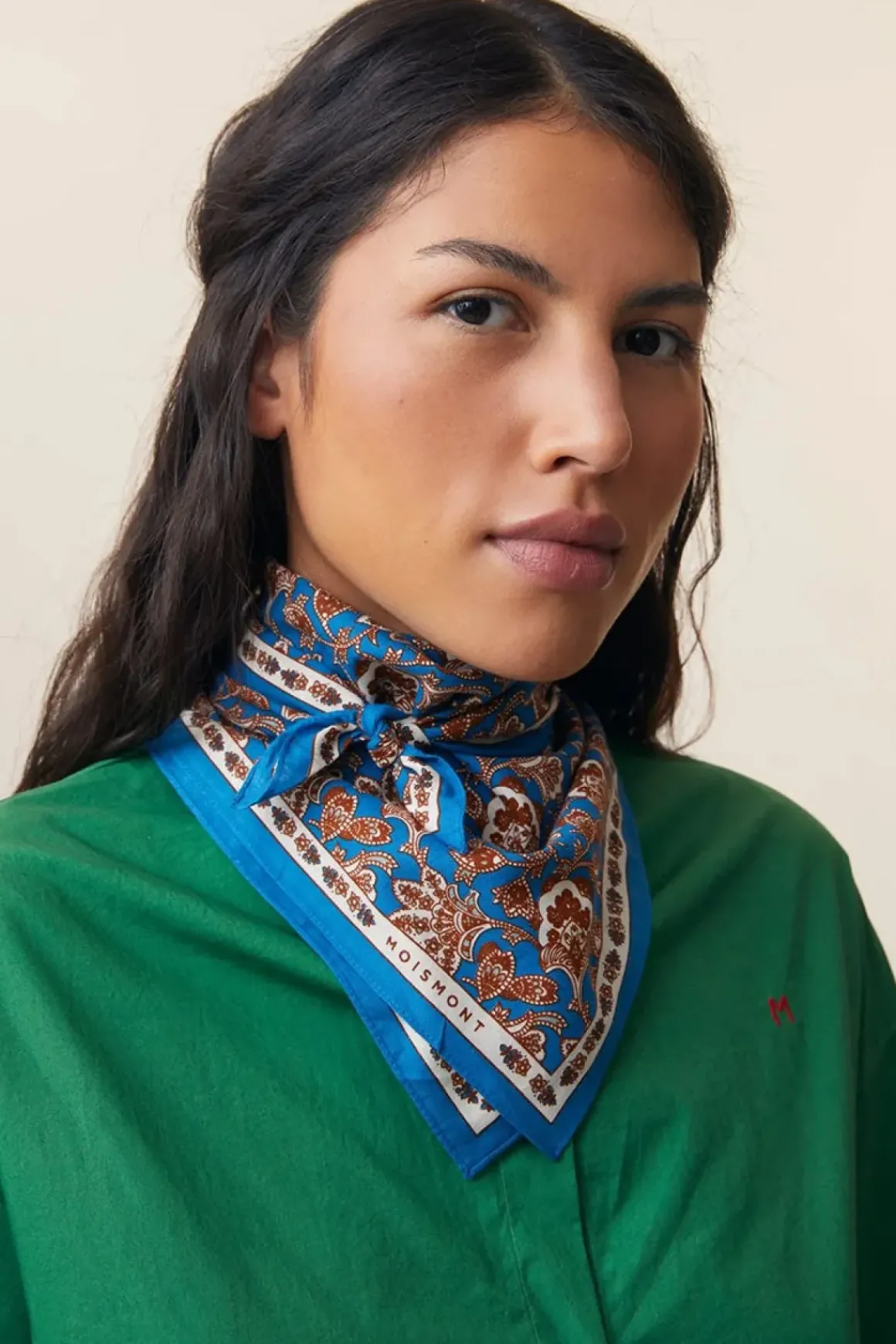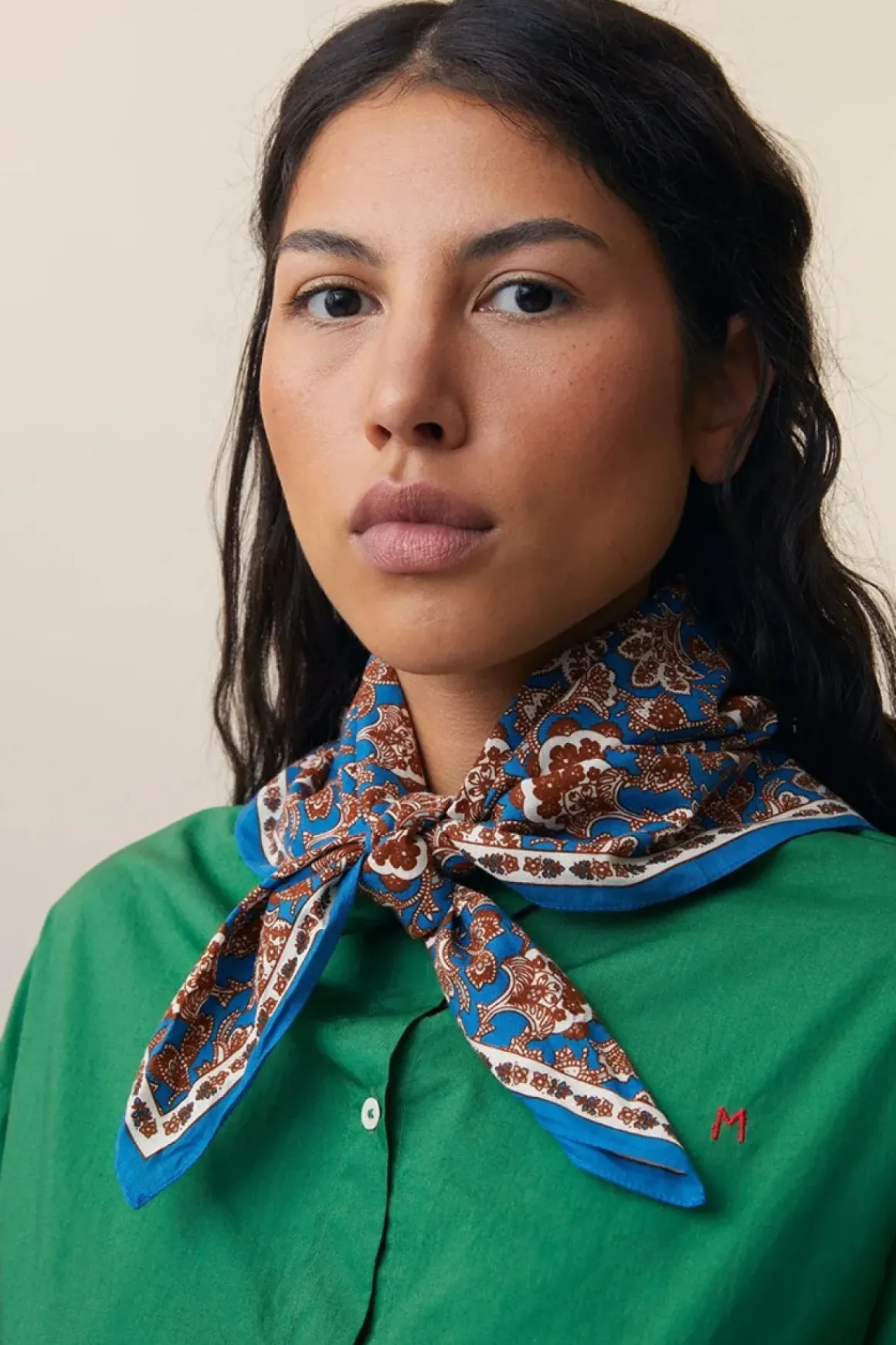 Skjerf N°764 er et kvadratisk skjerf på 65×65 cm med et paisleymønster inspirert av vårens tilbakekomst. Det er laget av lett og myk bomull, noe som gjør det behagelig å ha på. Størrelsen gjør det allsidig – bruk det rundt halsen, i håret eller knytt det på vesken for en dekorativ detalj.