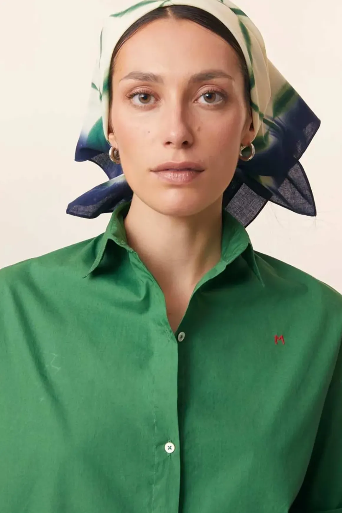 Skjerf N°766 i fargen Bottle Green er farget for hånd med den tradisjonelle shibori-teknikken, som gir hvert skjerf et unikt mønster. De grønne og blå tonene skaper et organisk og flytende uttrykk, noe som gir stoffet dybde og liv. Den lette bomullskvaliteten gjør skjerfet behagelig å bruke, enten det knyttes rundt halsen, i håret eller som en dekorativ detalj.