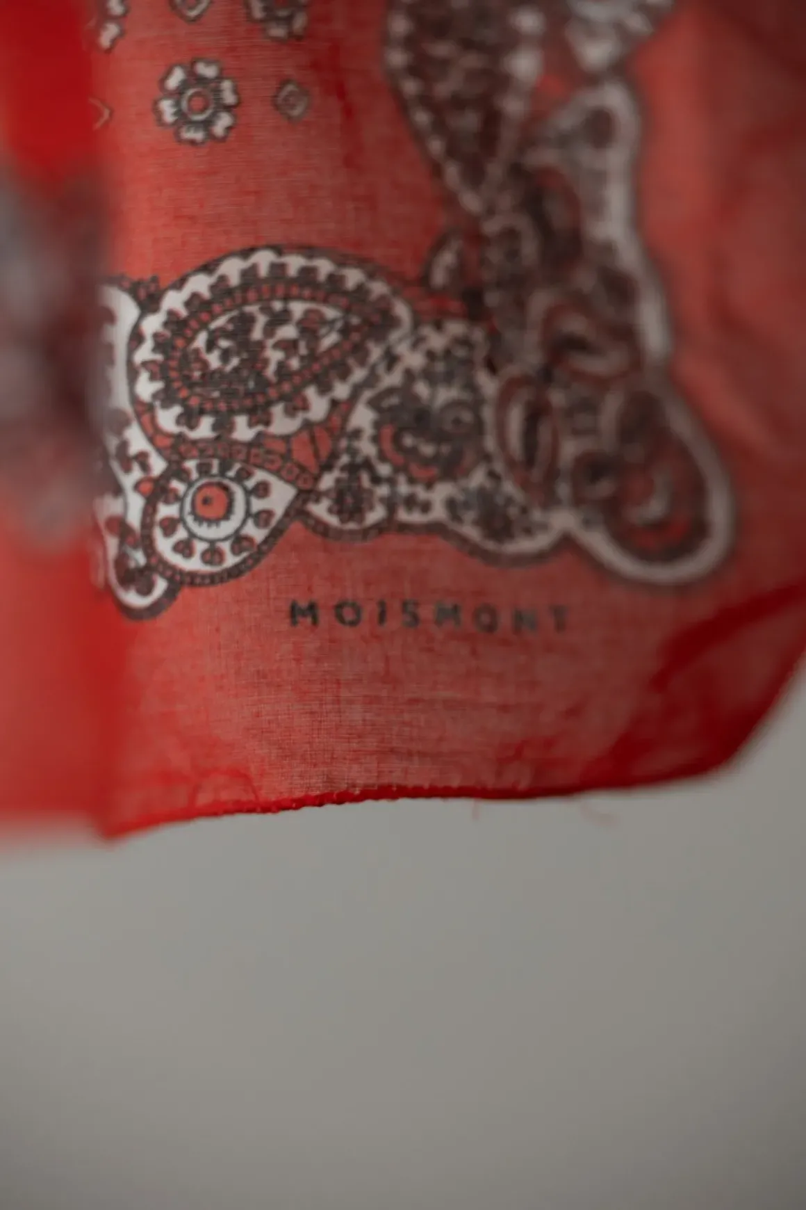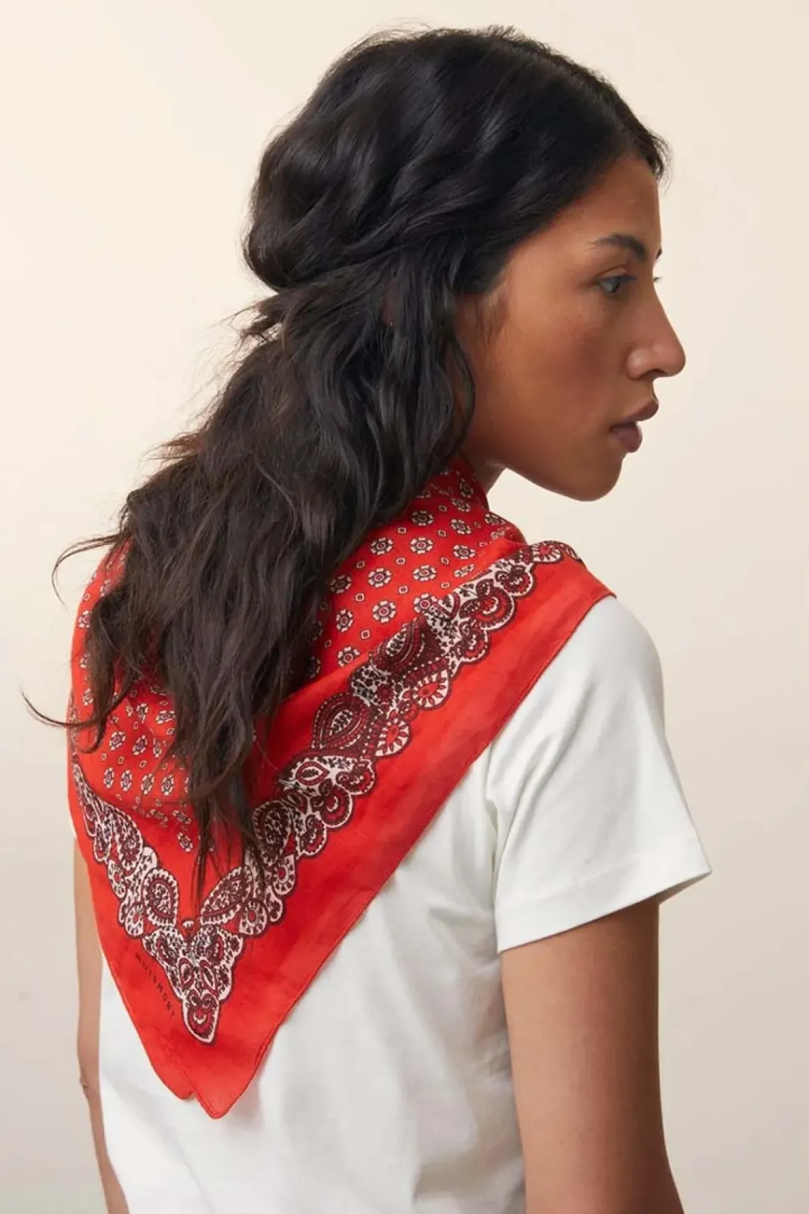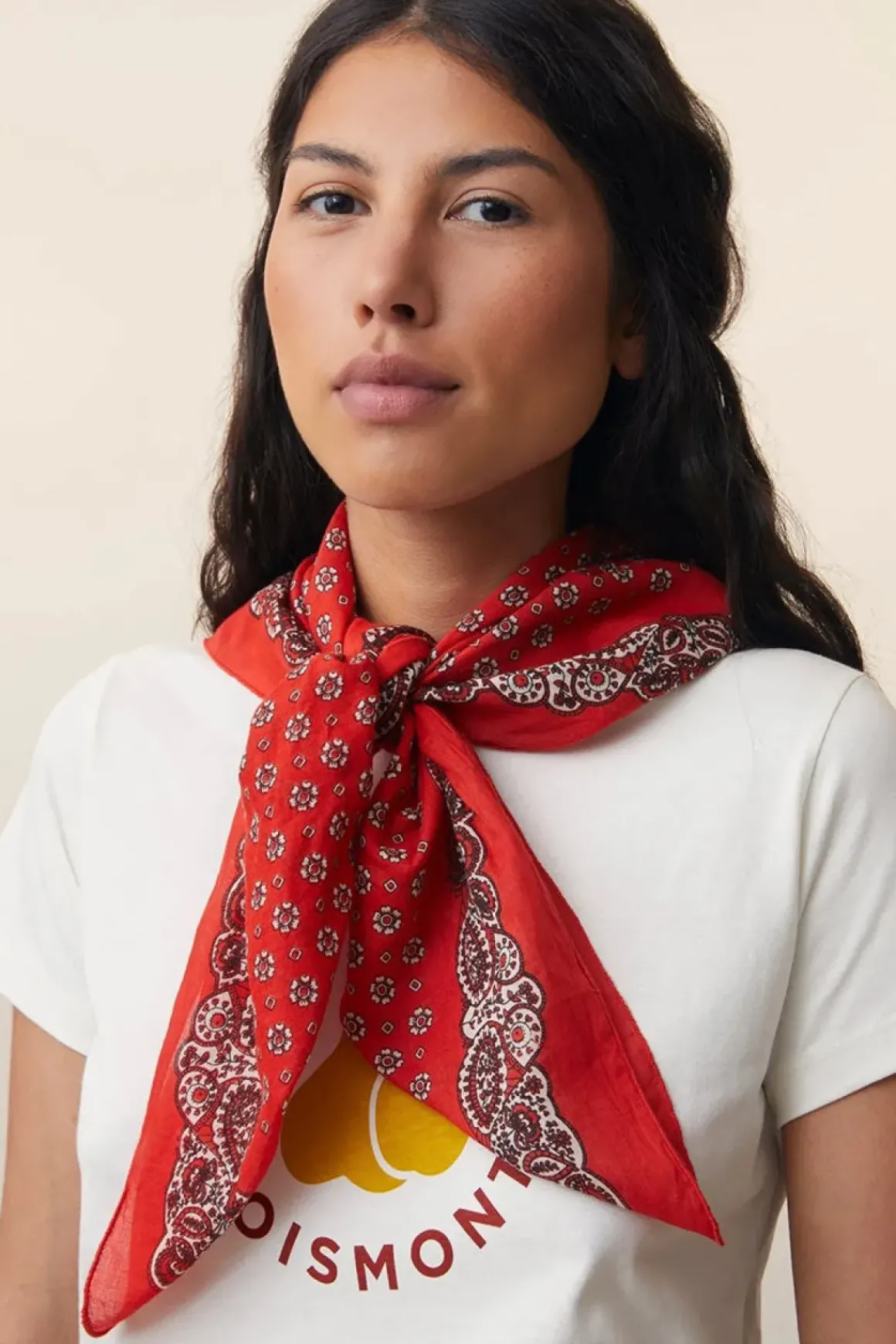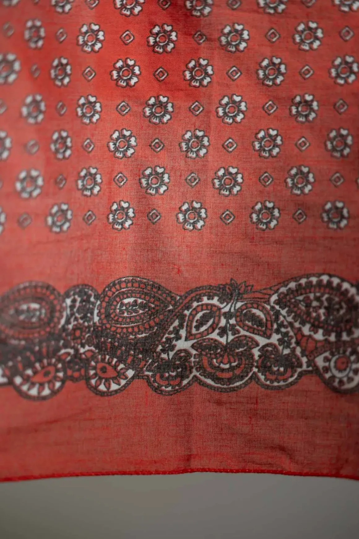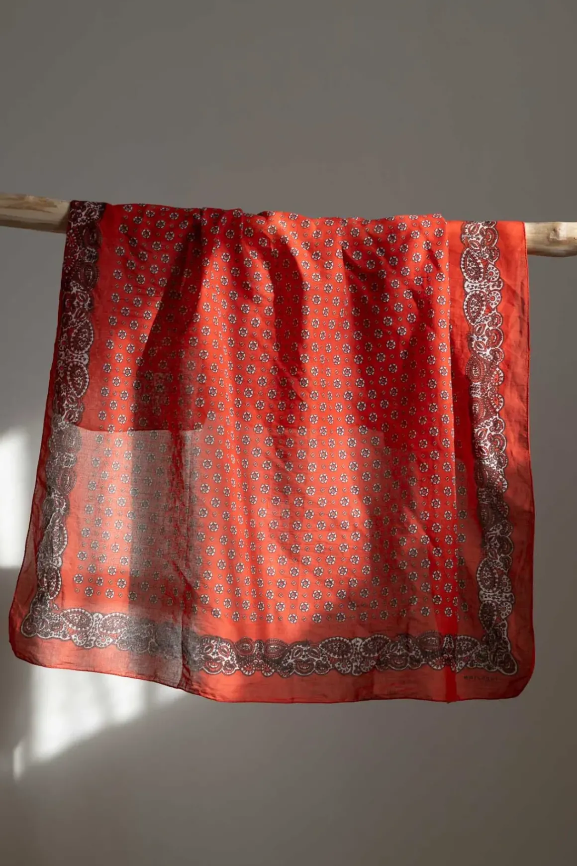 Skjerf N°767 i fargen Tomette er et håndlaget kvadratisk skjerf i 100% bomull. Det måler 90×90 cm og har et klassisk paisleymønster langs kantene, som gir det et tidløst uttrykk. Skjerfet kan styles på mange måter – bruk det som hodeplagg, rundt halsen eller knytt det på vesken for en ekstra detalj. Et allsidig tilbehør med et mykt og lett stoff.
