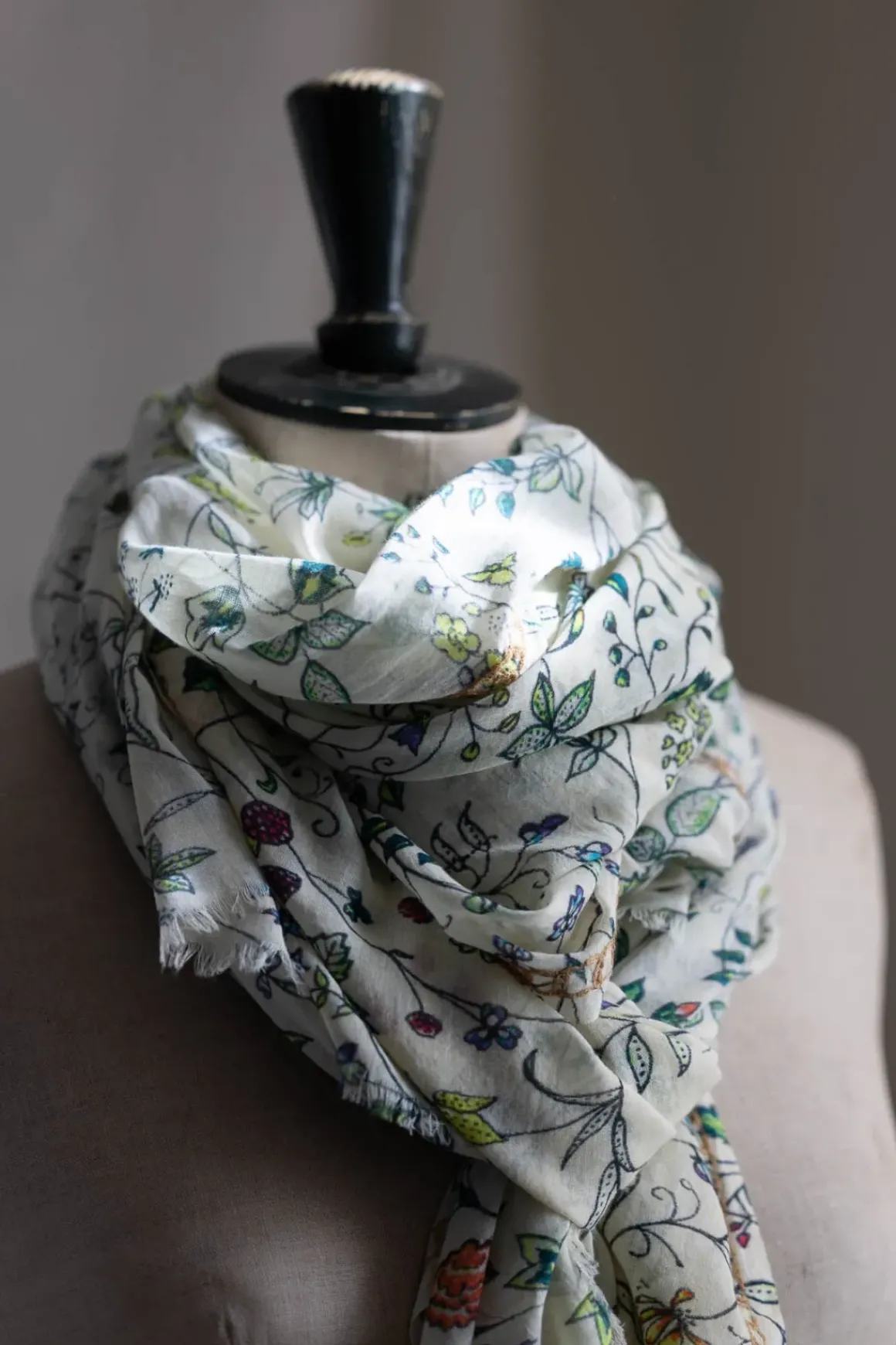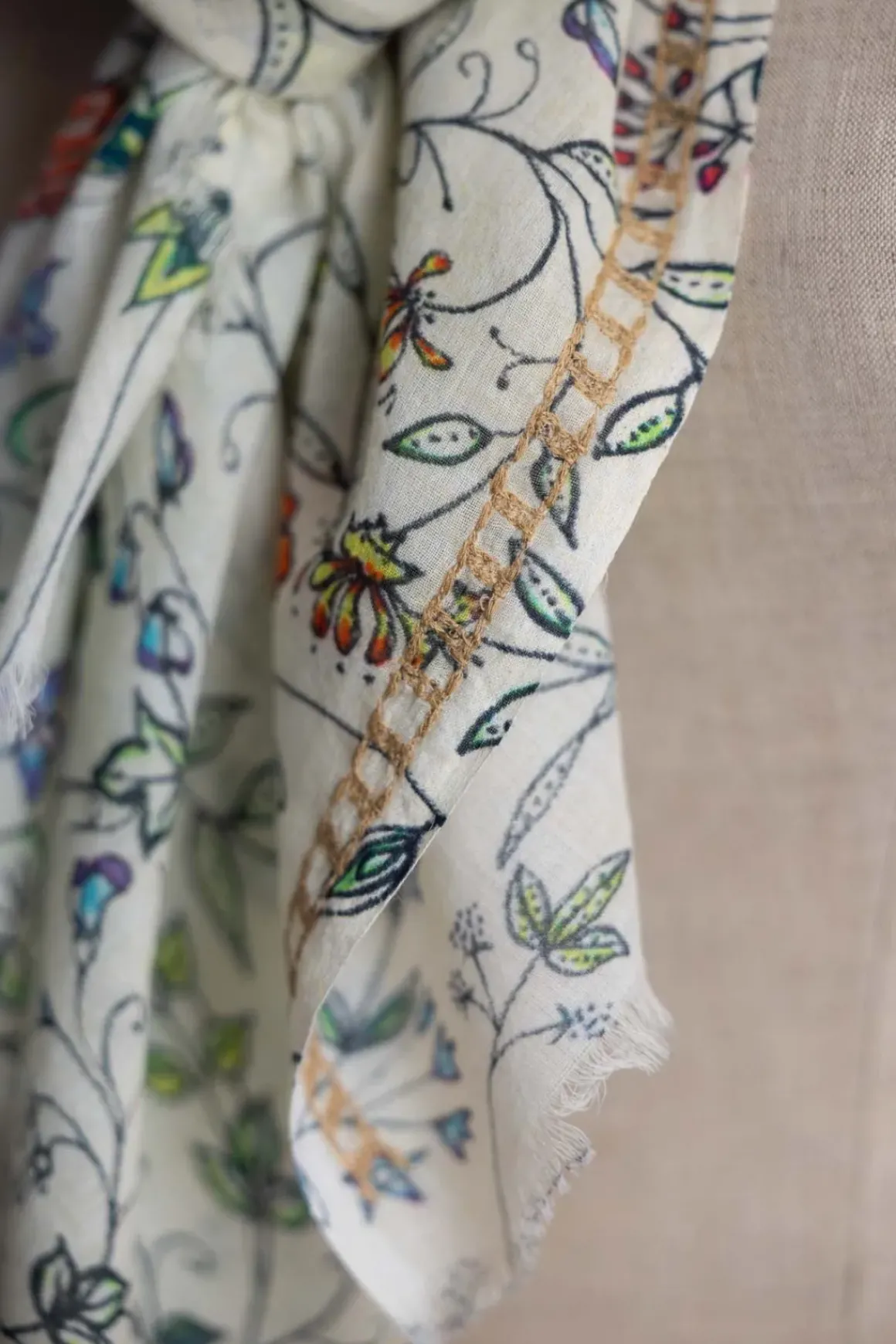 Pretty er et vakkert og tidløst skjerf fra italienske Faliero Sarti i en myk og behagelig bomullsblanding med blomstrete print i delikate farger. Det lette og luftige materialet gjør skjerfet like fint til hverdagsbruk som til mer pyntede anledninger. Bruk det som et sjal over skuldrene på kjølige sommerkvelder, knyt det rundt halsen for et klassisk uttrykk, eller la det henge løst for en avslappet og naturlig look. De fine nyansene og det florale mønsteret gjør dette til et allsidig tilbehør som løfter enhver garderobe.