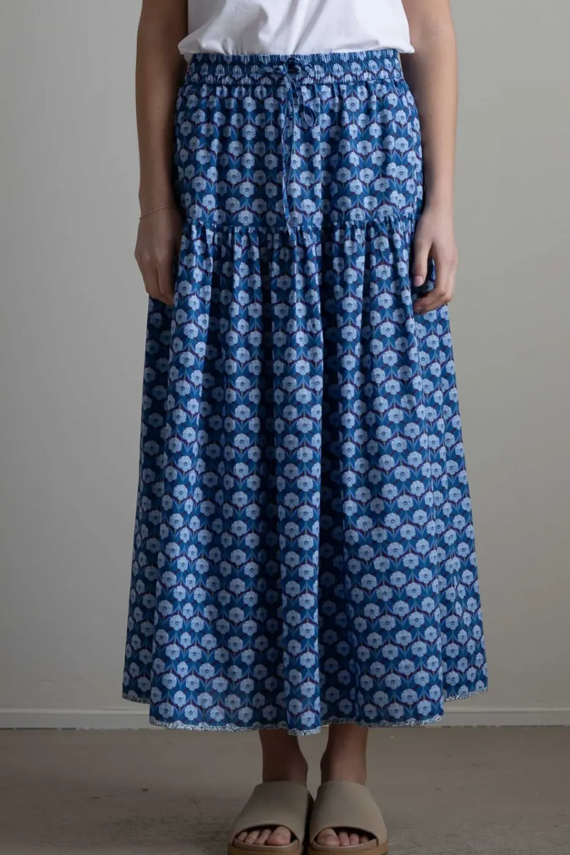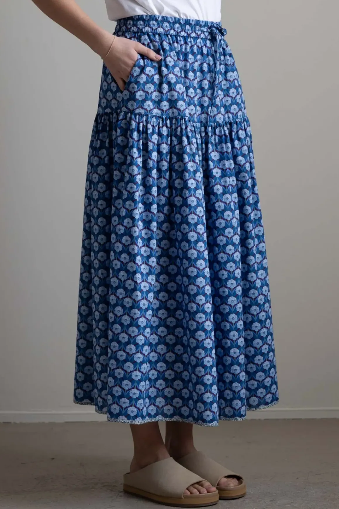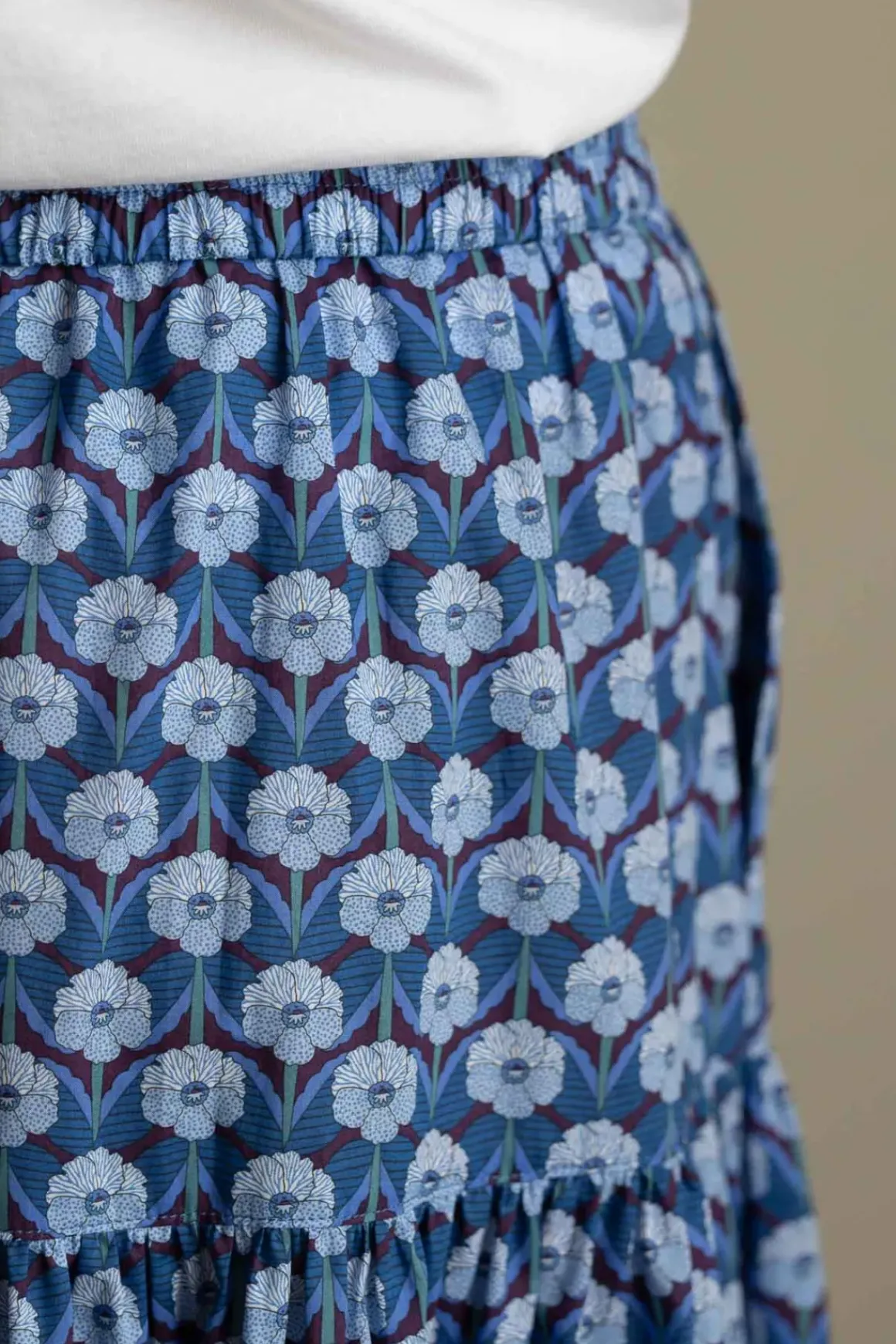 Bibbi-skjørtet fra Apof kombinerer lekent design med gjennomført komfort, laget i den lette og myke Liberty Tana Lawn-bomullen. Skjørtet har en elastisk midje med knytebånd, stikklommer i sidene og en voluminøs, lagdelt fasong som faller fint og beveger seg lett med kroppen. Mønsteret Chevron Blue gir skjørtet et fargerikt og personlig uttrykk, perfekt til både hverdag og feriedager.