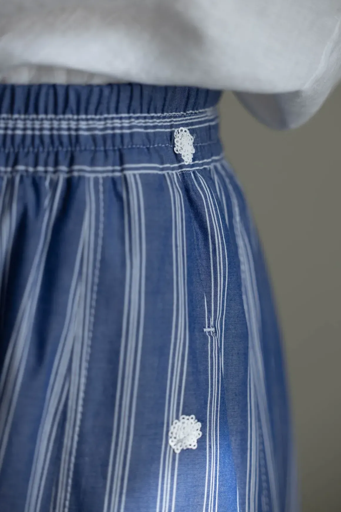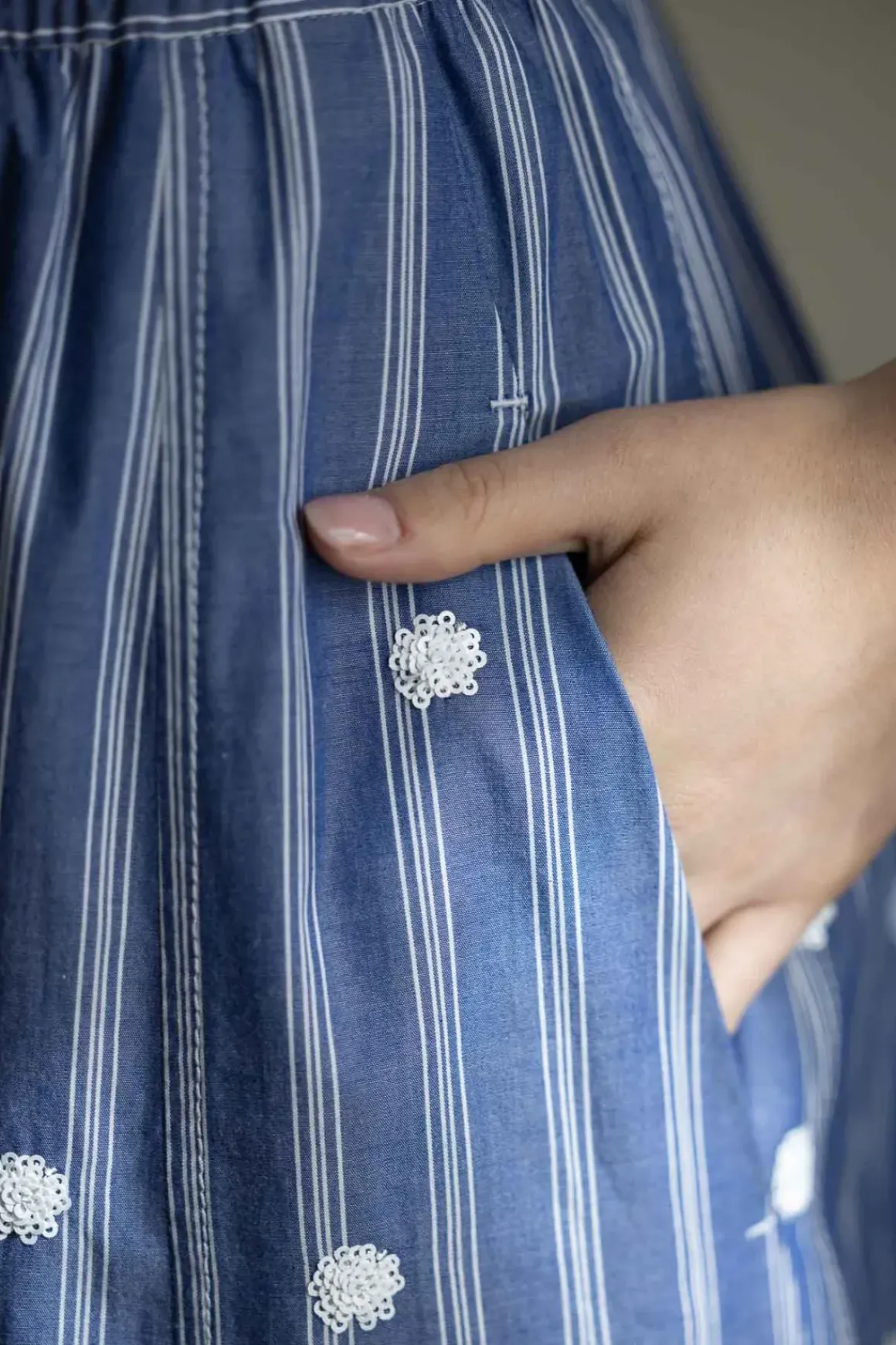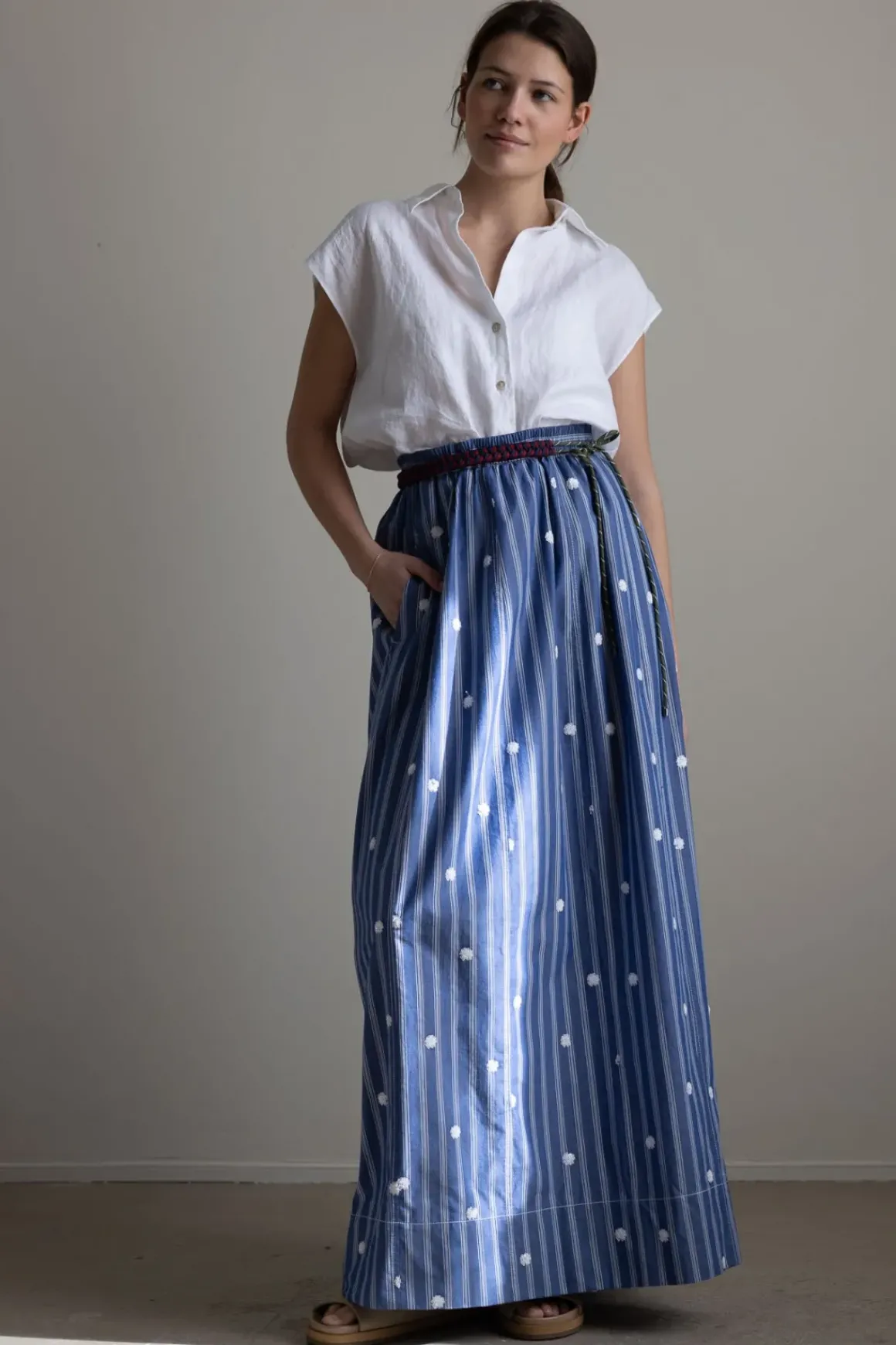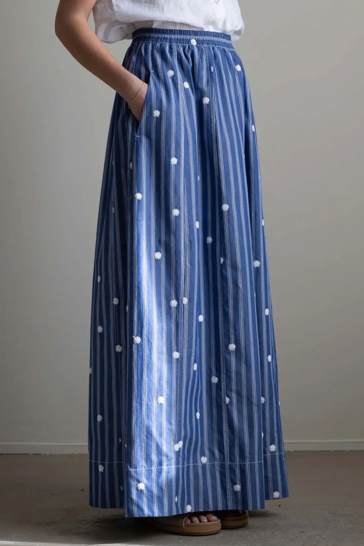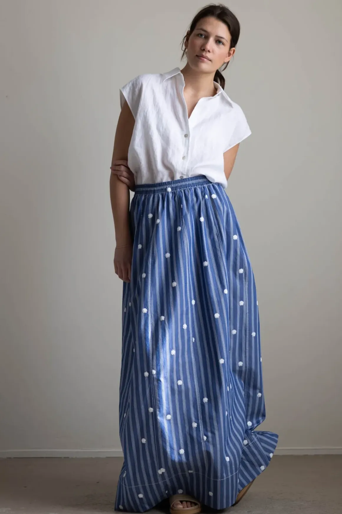 Nordic Blue-skjørtet fra Odeeh er et langt, luftig skjørt i myk bomull med påsydde blomster og smale vertikale striper. Modellen har strikk i livet, stikklommer i sidene og et voluminøst snitt som gir skjørtet en behagelig og avslappet fasong. Livet er lett romslig og gjør at skjørtet også fint kan bæres som en stroppeløs kjole – spesielt med et belte i midjen for definert silhuett. Et belte gir også ekstra støtte i livet og gir deg mulighet til å variere uttrykket. Skjørtet passer perfekt på varme dager og gir deg flere bruksmuligheter i én og samme modell.