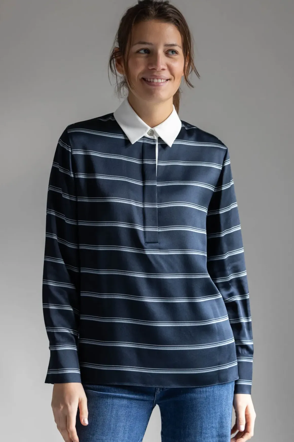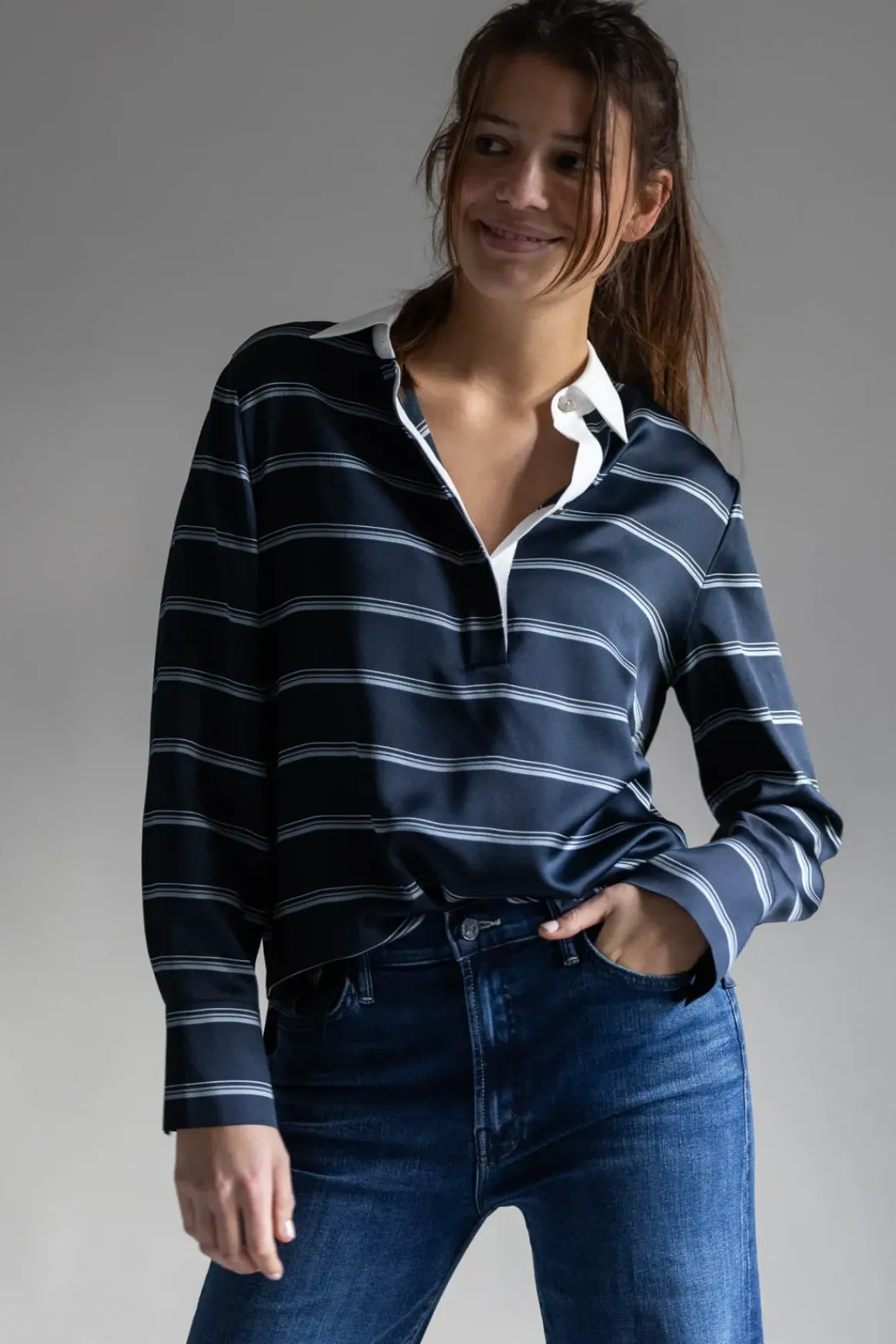 Skjorte fra Vince som henter inspirasjon fra sesongens rugby-trend med sine klassiske striper og kontrastkrage. Dette plagget balanserer det sporty og moderne med en avslappet passform og glansfullt silkestoff som føles lett mot huden. De fine detaljene, som treknappslukking og agoyaskjellknapper, tilfører et subtilt preg. En skjorte som er like fin til jeans som til et mer gjennomført antrekk, perfekt for deg som ønsker et avslappet, men kult uttrykk.