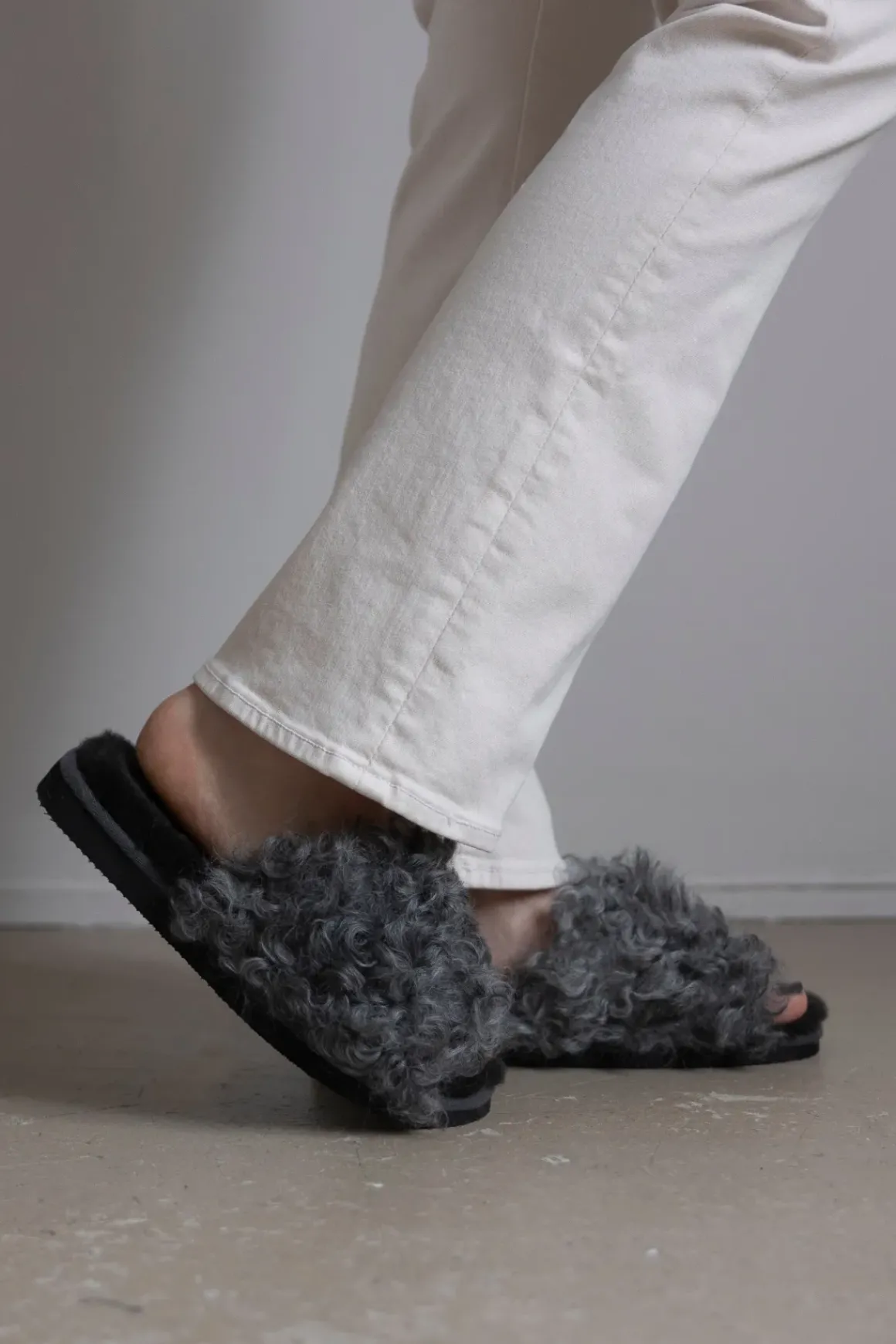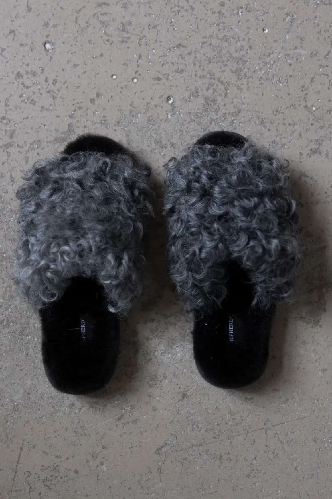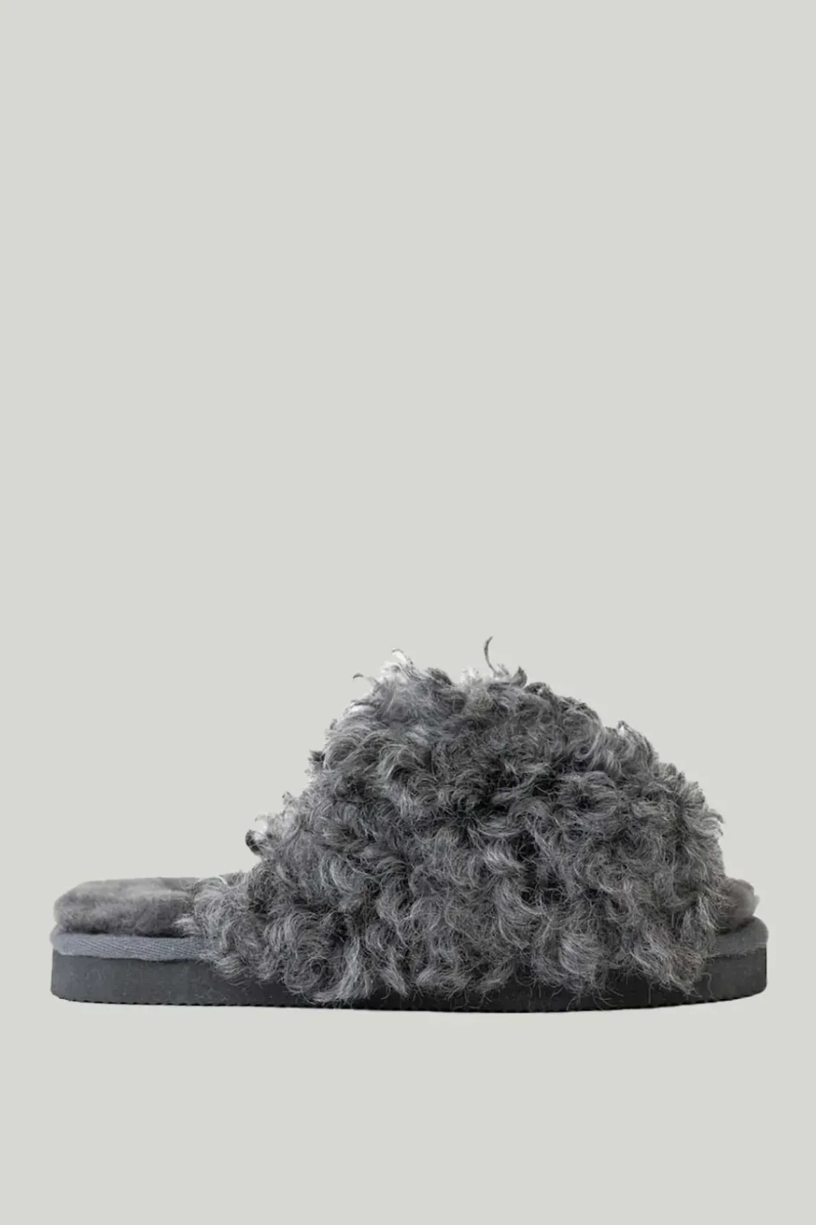 Sandaler/tøfler i 100% saueskinn fra Shepherd. Tøffelen er en kombinasjon av alle elementene vi elsker, og er fylt med varm saueull på innsiden. Tøflene har et klassisk sandal utseende med krøllet saueskinn på toppen. Helt nydelige på foten.